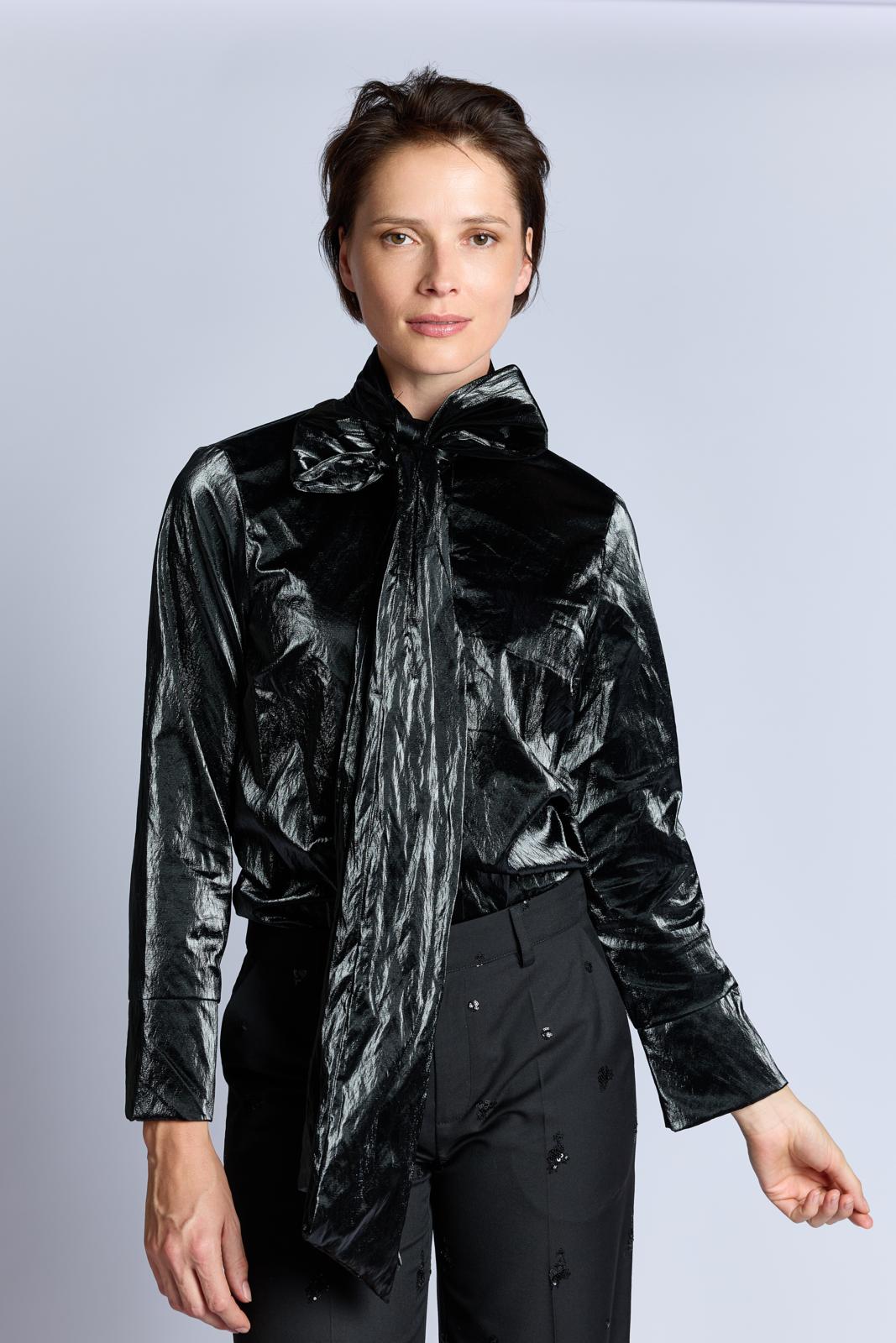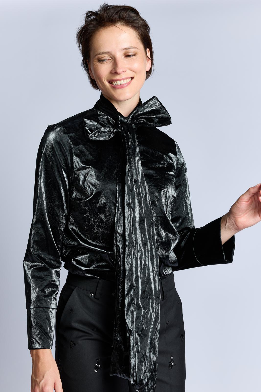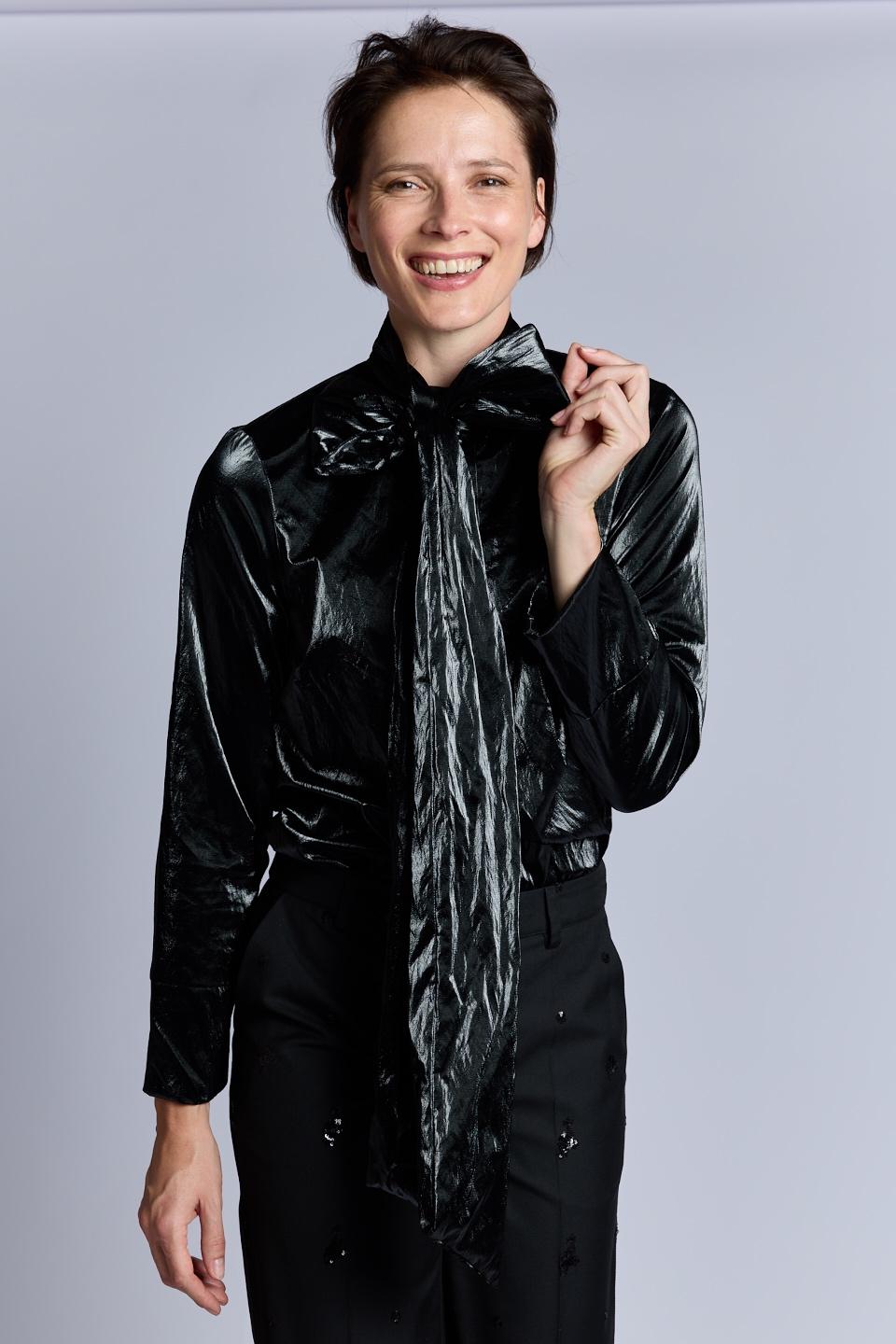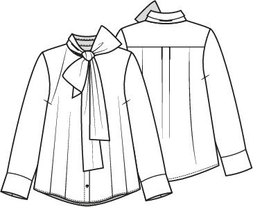 Deze blouse heeft middenvoor een knoopjessluiting die verdoezeld wordt door de grote strik. Een feestelijk item van glansstof. Van katoenen poplin maak je er een formeler exemplaar van, voor onder een vest of blazer.