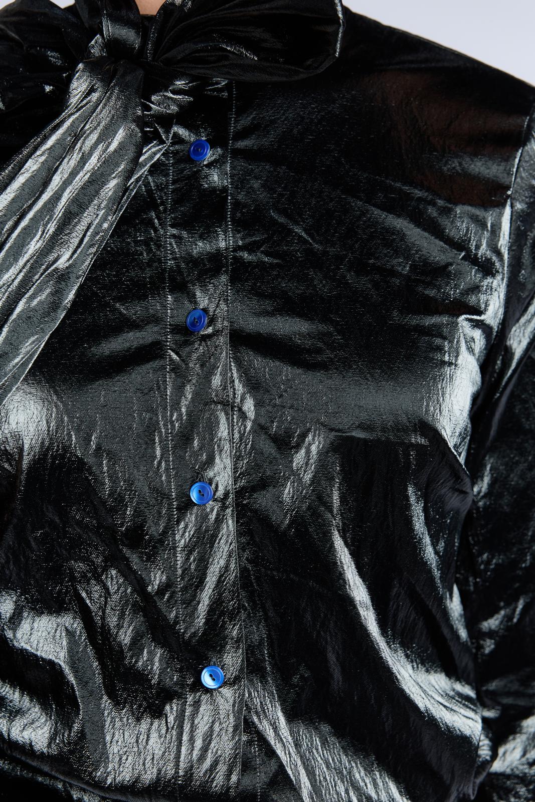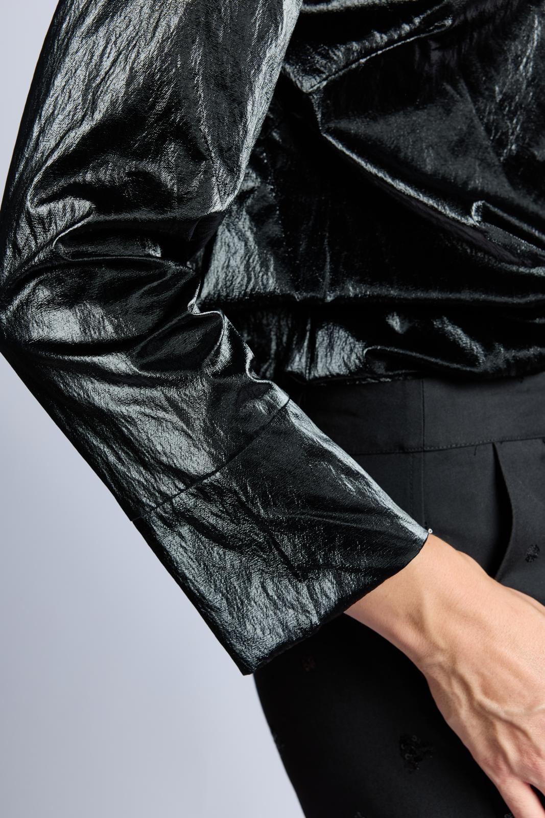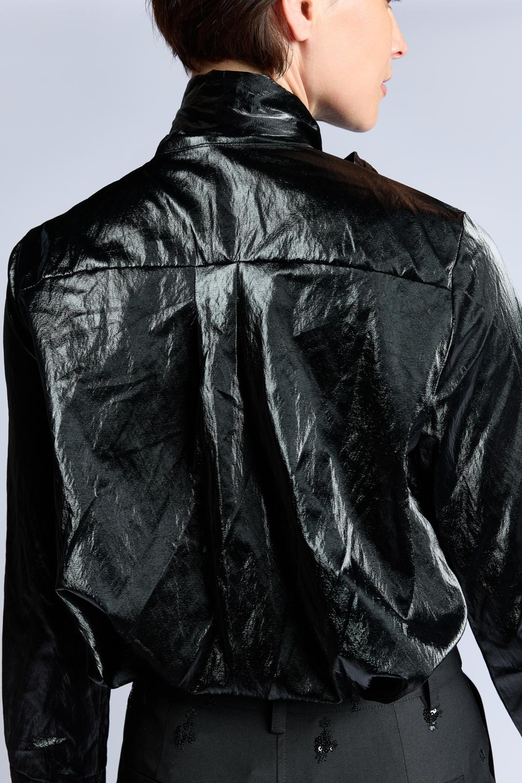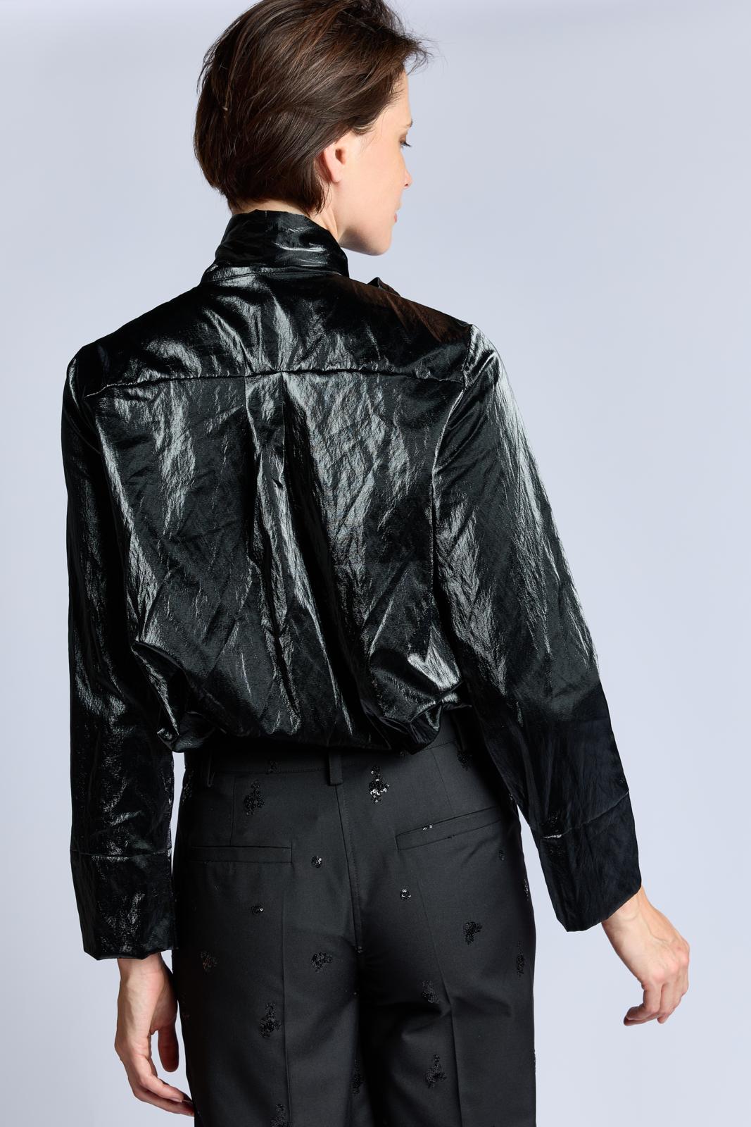 Deze blouse heeft middenvoor een knoopjessluiting die verdoezeld wordt door de grote strik. Een feestelijk item van glansstof. Van katoenen poplin maak je er een formeler exemplaar van, voor onder een vest of blazer.