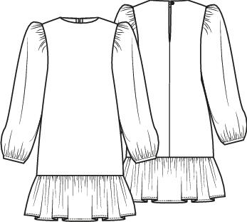 Zelf een feestjurk maken? Dit naaipatroon heeft een recht model met lange pofmouwen en een zwierige ruche onderaan én is niet al te moeilijk om te maken. De jurk komt prachtig tot z’n recht in jacquard of andere stevige feeststof.