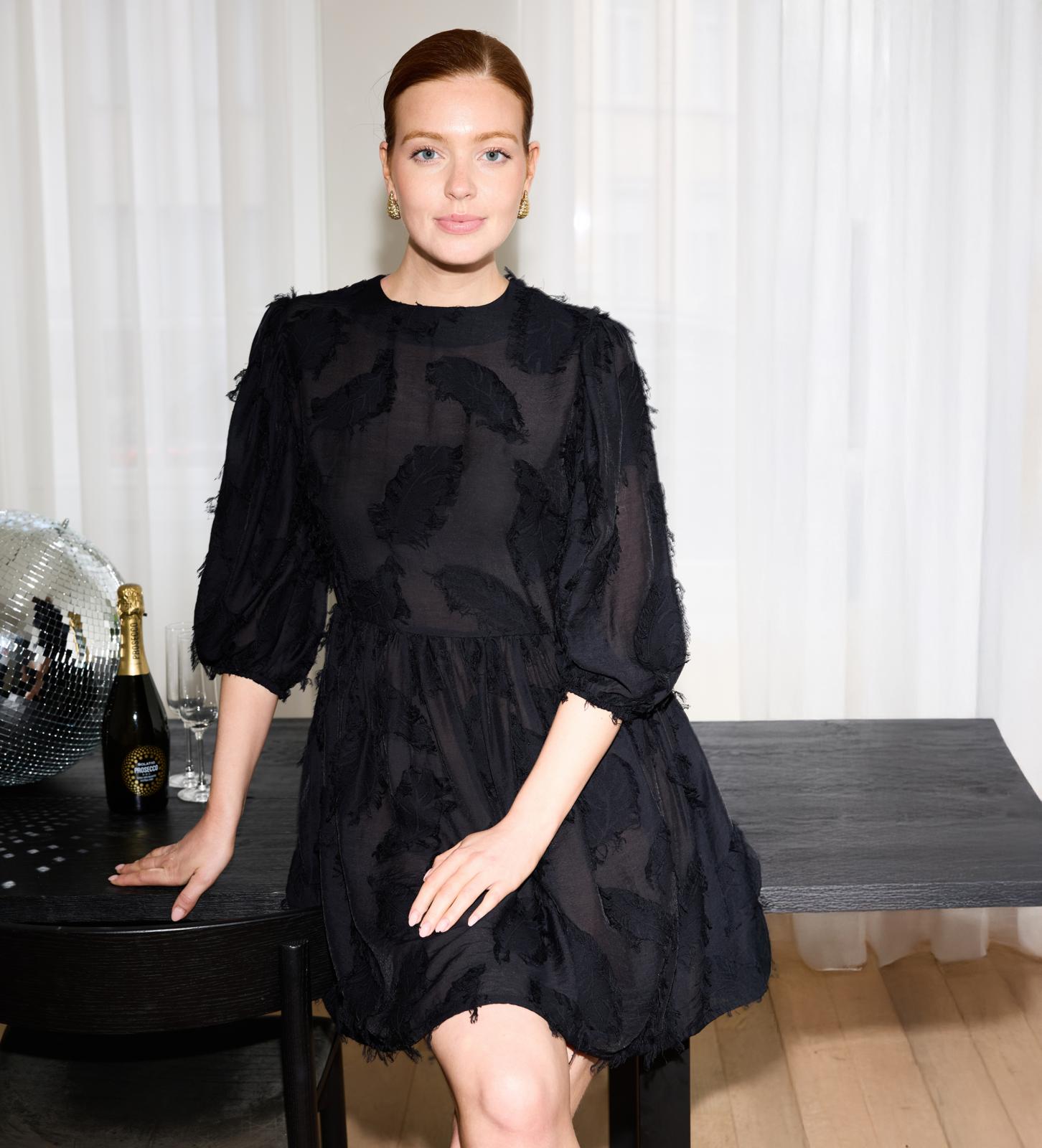 Deze zwarte jurk heeft alles in huis: een vrouwelijke pasvorm, elegante pofmouwen en een zwierig gerimpelde rok. Gemaakt van transparante structuurstof – met ingeweven bladmotief en fijne rafeltjes – voor een speelse look.