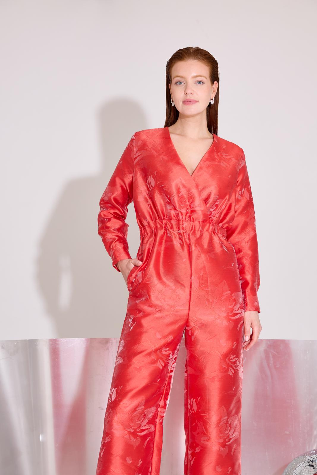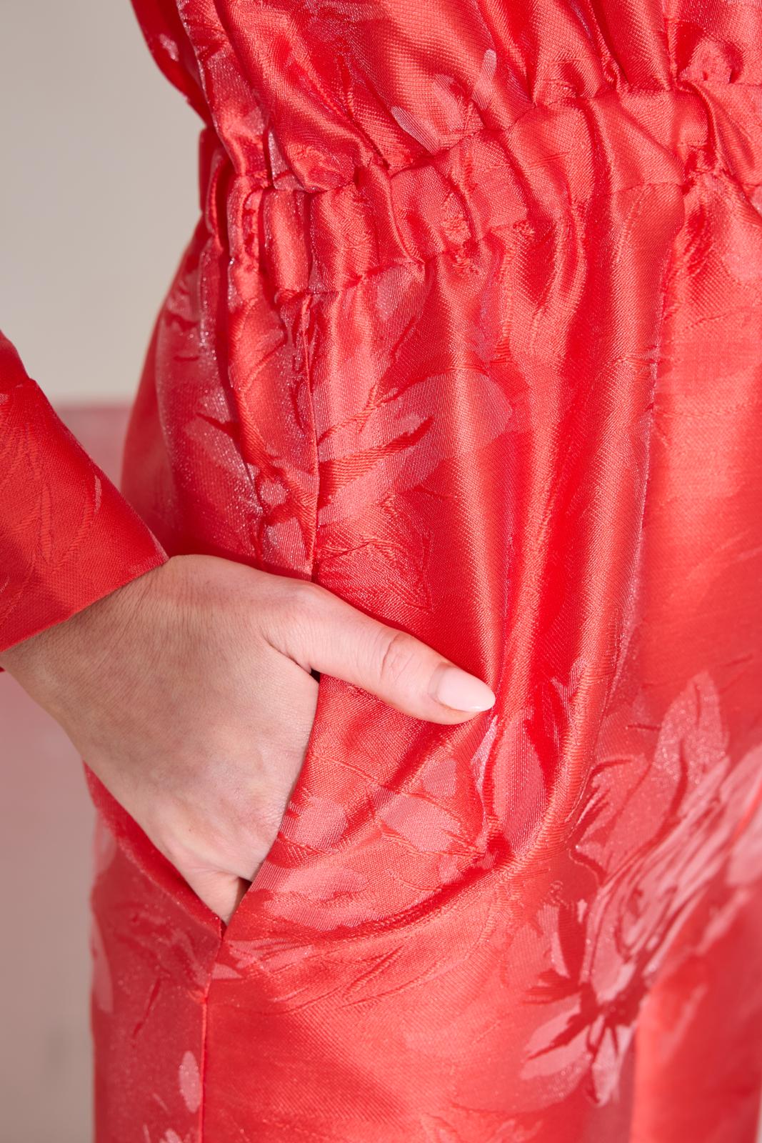 aan de voorkant, lange mouwen met manchetten en comfortabel elastiek in de taille. Het pak is gemaakt van een glanzende jacquardstof met bloemmotief.