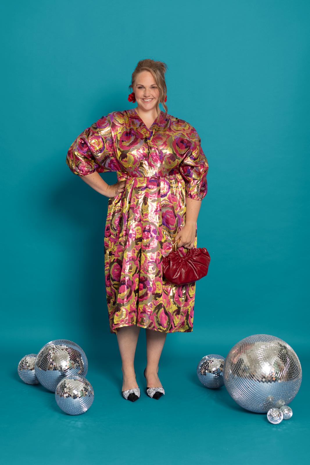 Statementjurk gezocht? In dit feestelijke model met V-hals, pofmouwen, wijde rok én een fantastisch brokaat, steel je gegarandeerd de show. Dankzij de brede strik­ceintuur accentueer je eenvoudig je taille.