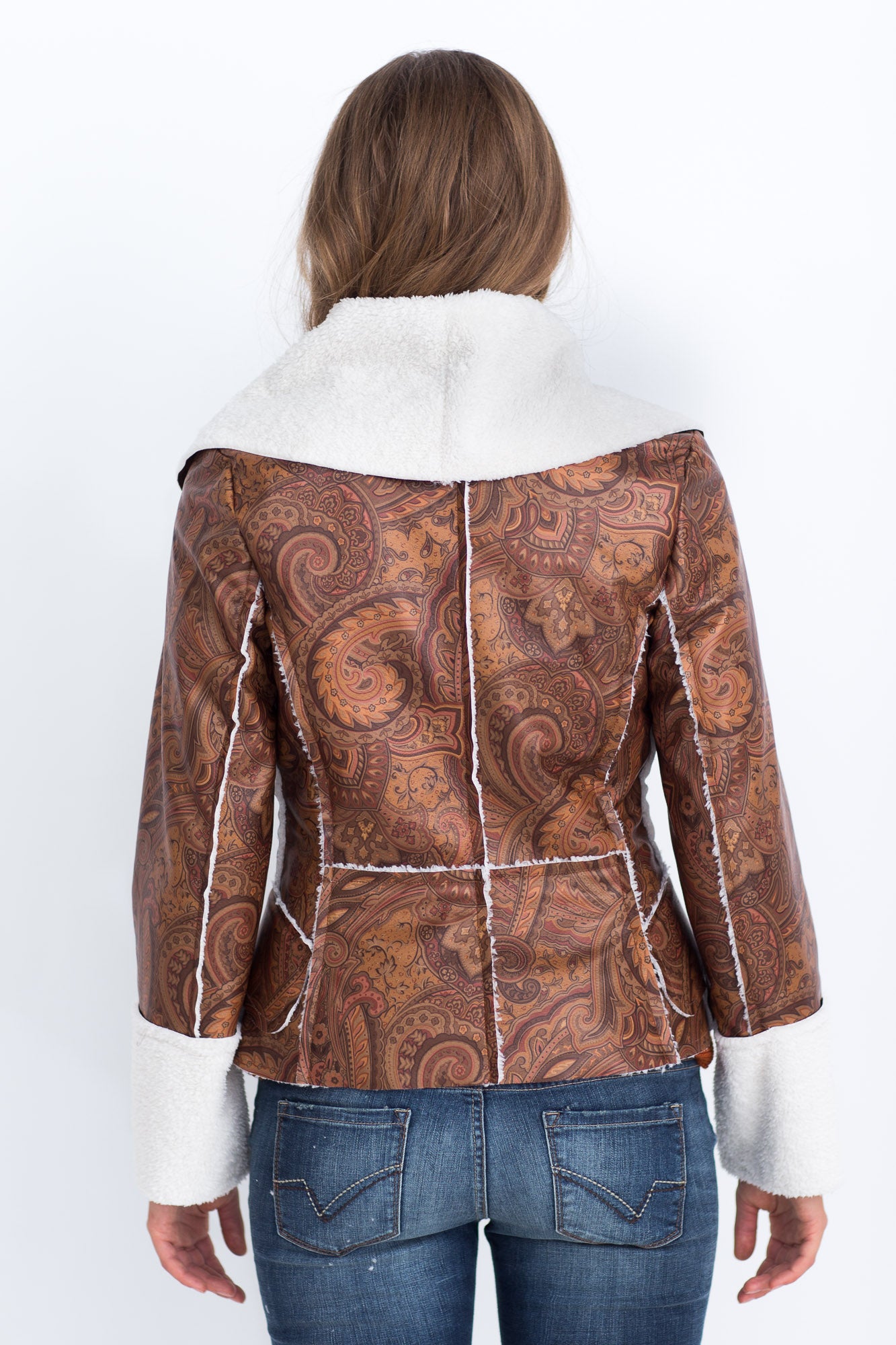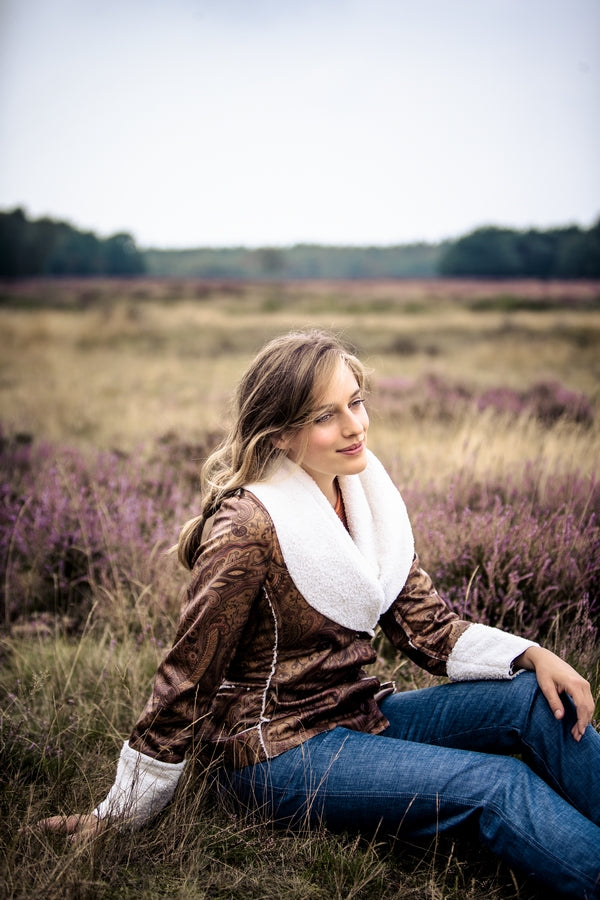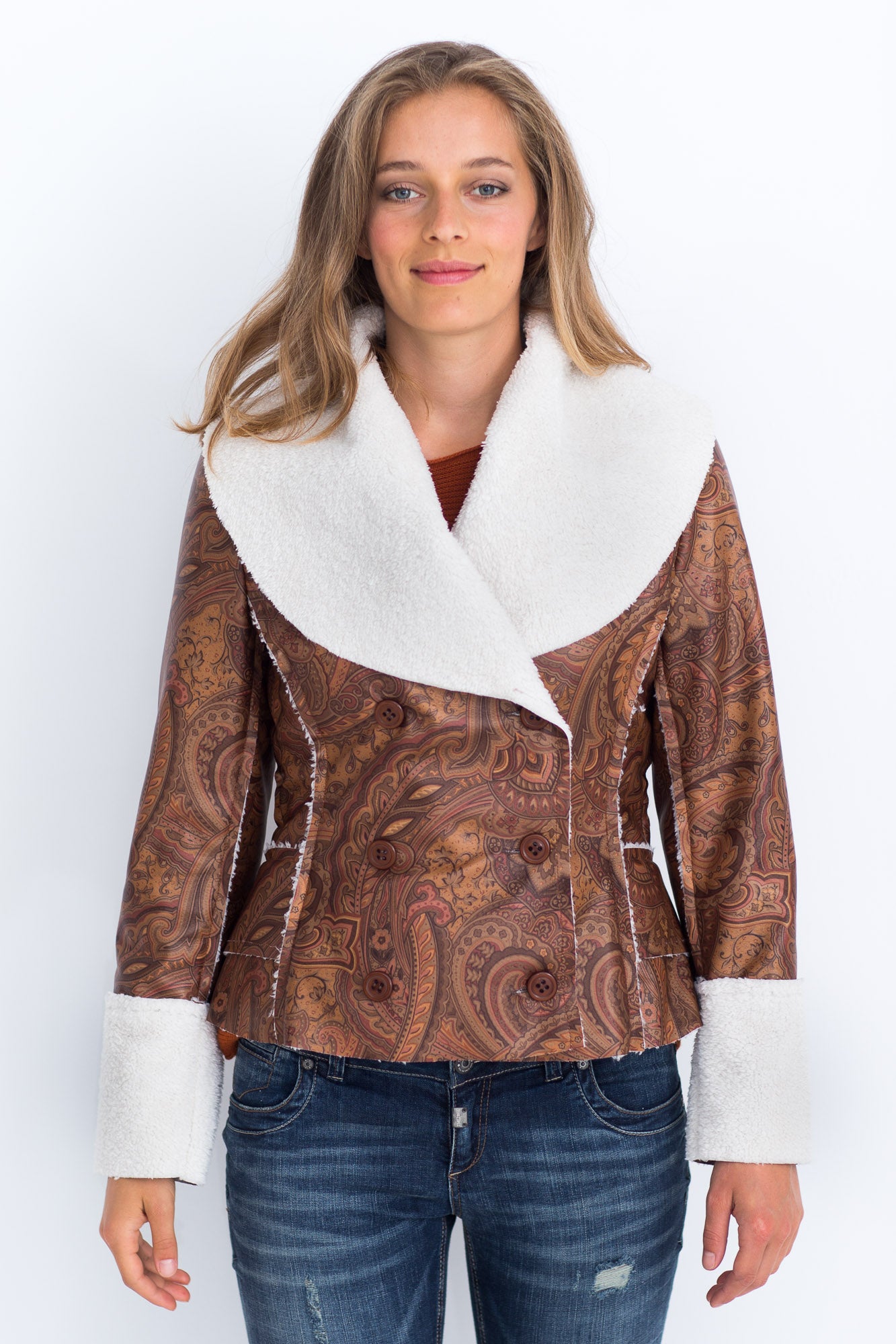 Het korte getailleerde winterjasje heeft een royale sjaalkraag, is double breasted en klepzakken die naar achter doorlopen.