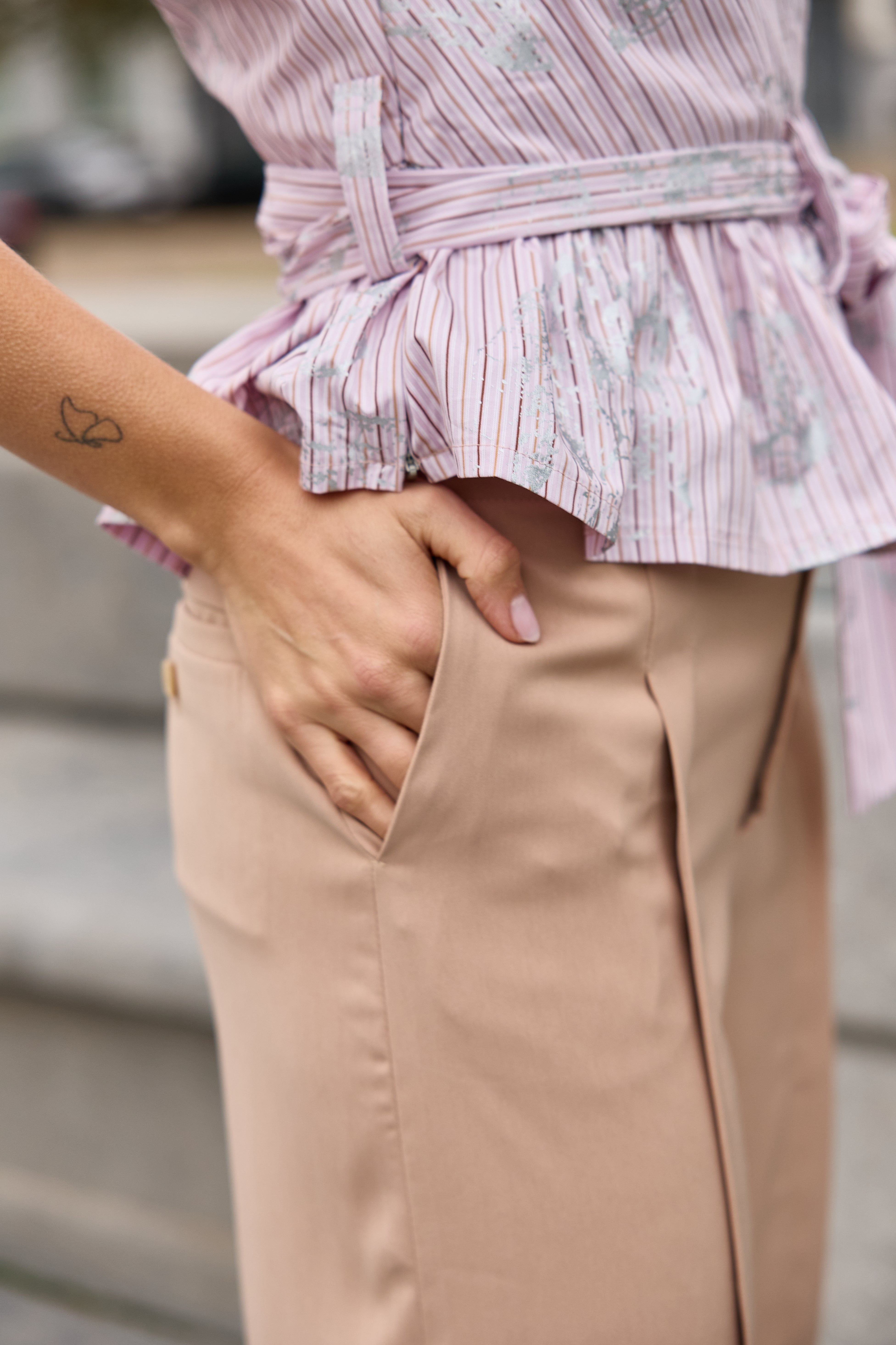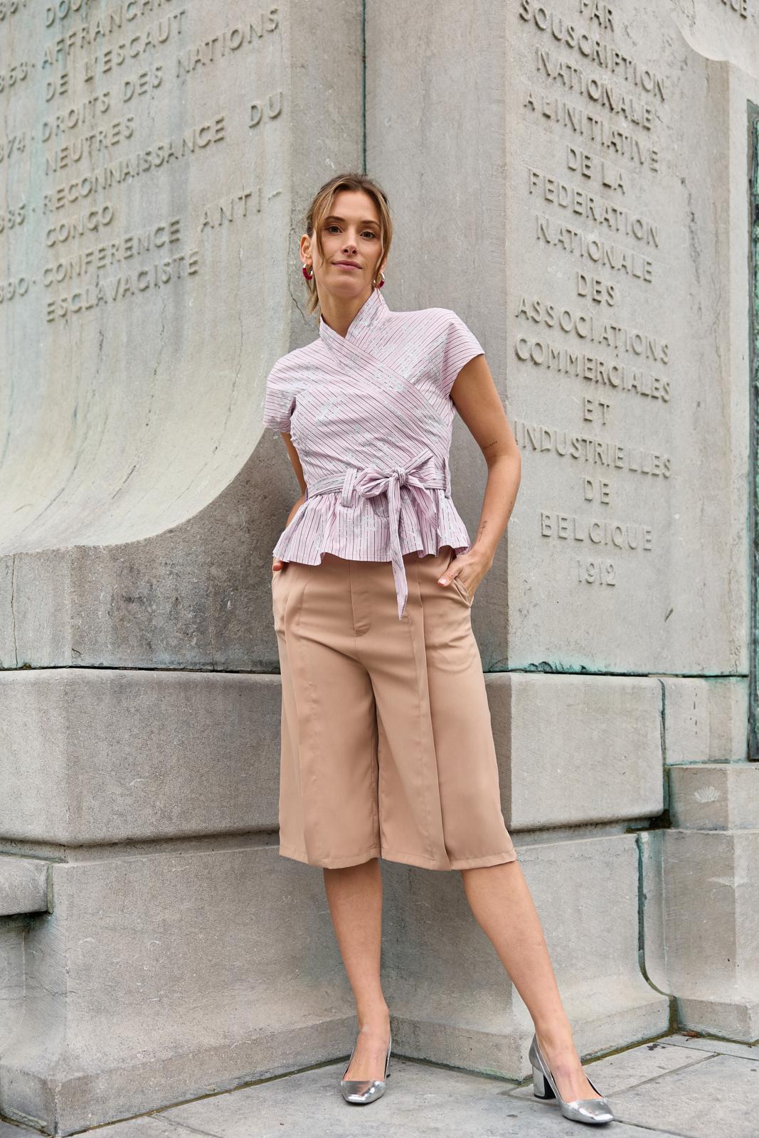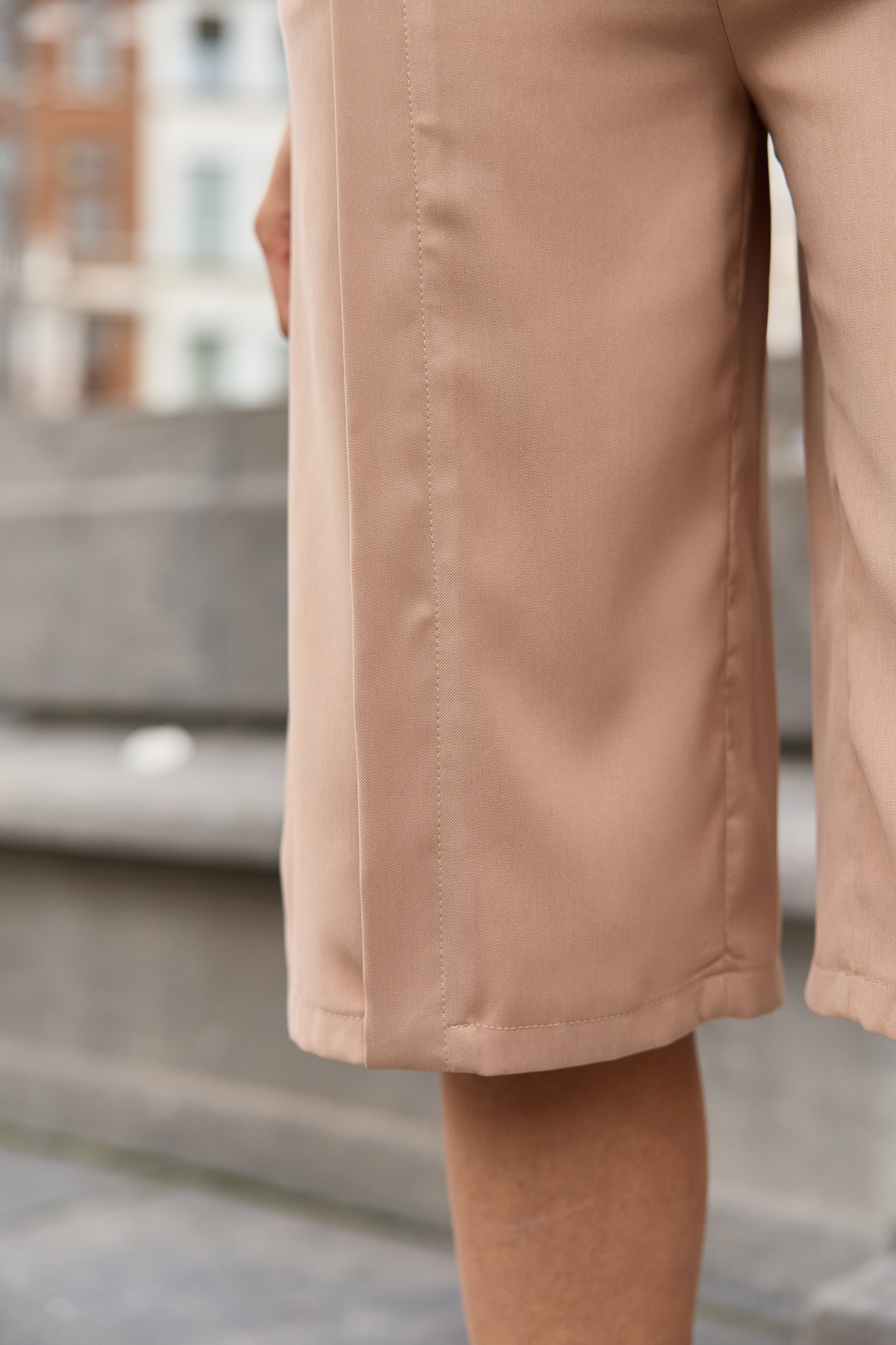 De culotte is bovenaan afgewerkt met een beleg in plaats van een tailleband. Een trenditem deze lente! Leuke details: de lummels met knoopjes in de taille en de sierplooi op de broekspijpen.