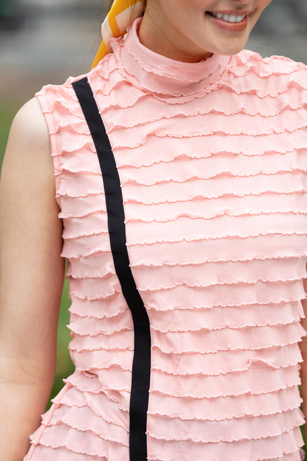 Deze eyecatcher van romantische ruchesstof - met rekbare tricot basis - heeft geen rits nodig. De tussengestikte zwarte bies kun je weglaten; knip het voorpand dan niet door.
