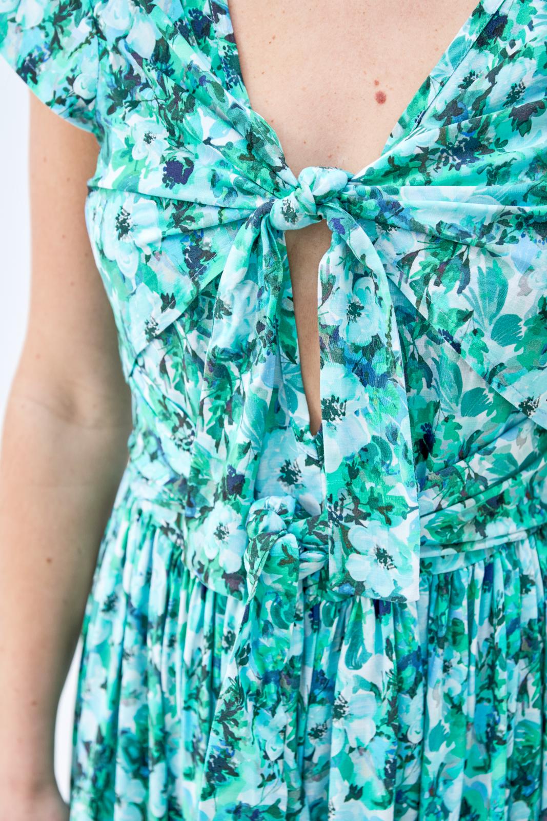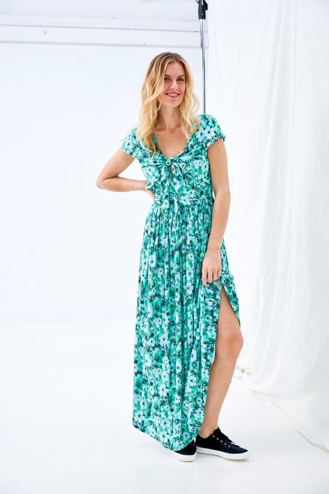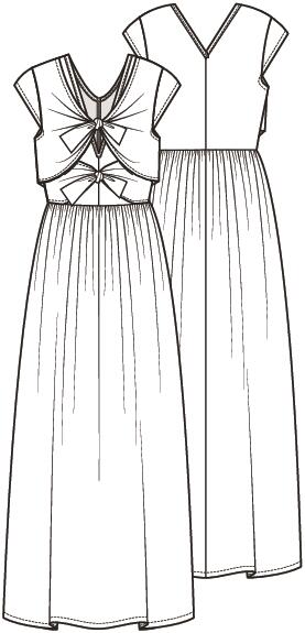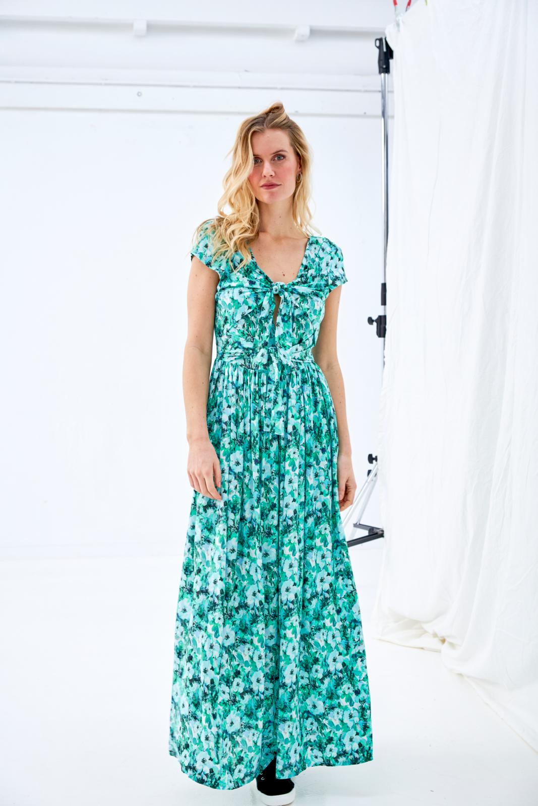 In deze ongecompliceerde jurk met zwierige, aangerimpelde rok zie je er meteen vrolijk en zonnig uit. Het lijfje heeft voor én achter een (diepe) V-hals en kleine kapmouwtjes. Vanuit de zijnaden komen twee paar knooppandjes, die aan de voorkant worden dichtgeknoopt. Het bovenste setje zorgt voor een bolero-effect.