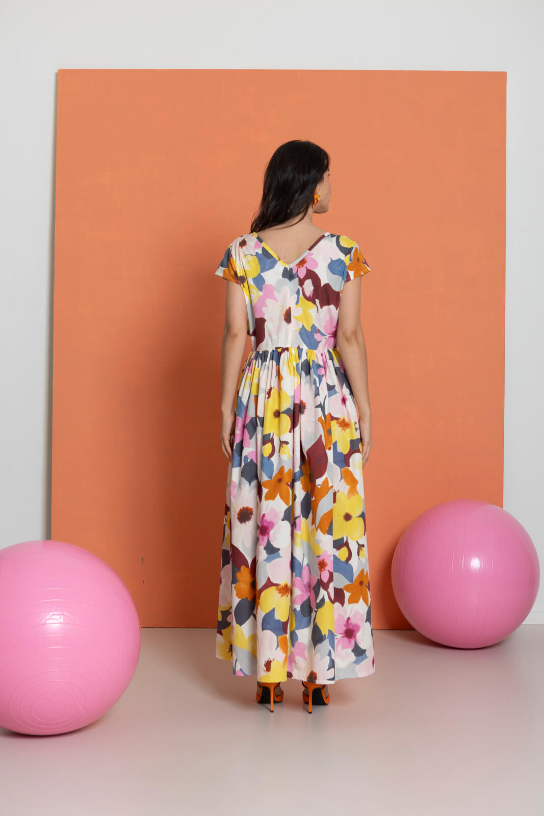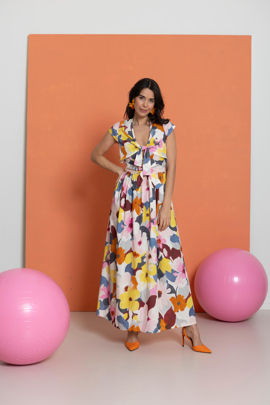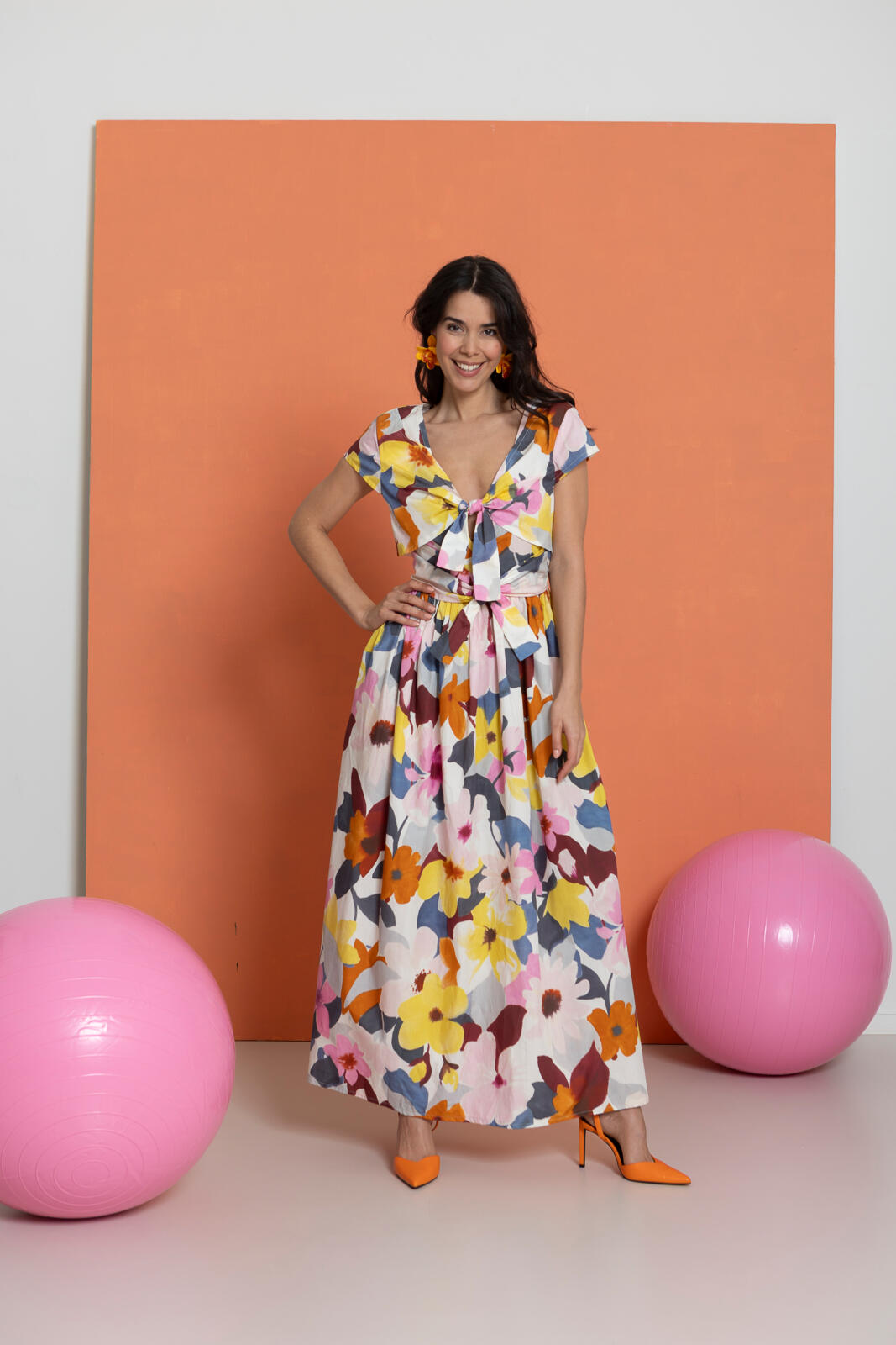 In deze ongecompliceerde jurk met zwierige, aangerimpelde rok zie je er meteen vrolijk en zonnig uit. Het lijfje heeft voor én achter een (diepe) V-hals en kleine kapmouwtjes. Vanuit de zijnaden komen twee paar knooppandjes, die aan de voorkant worden dichtgeknoopt. Het bovenste setje zorgt voor een bolero-effect.
