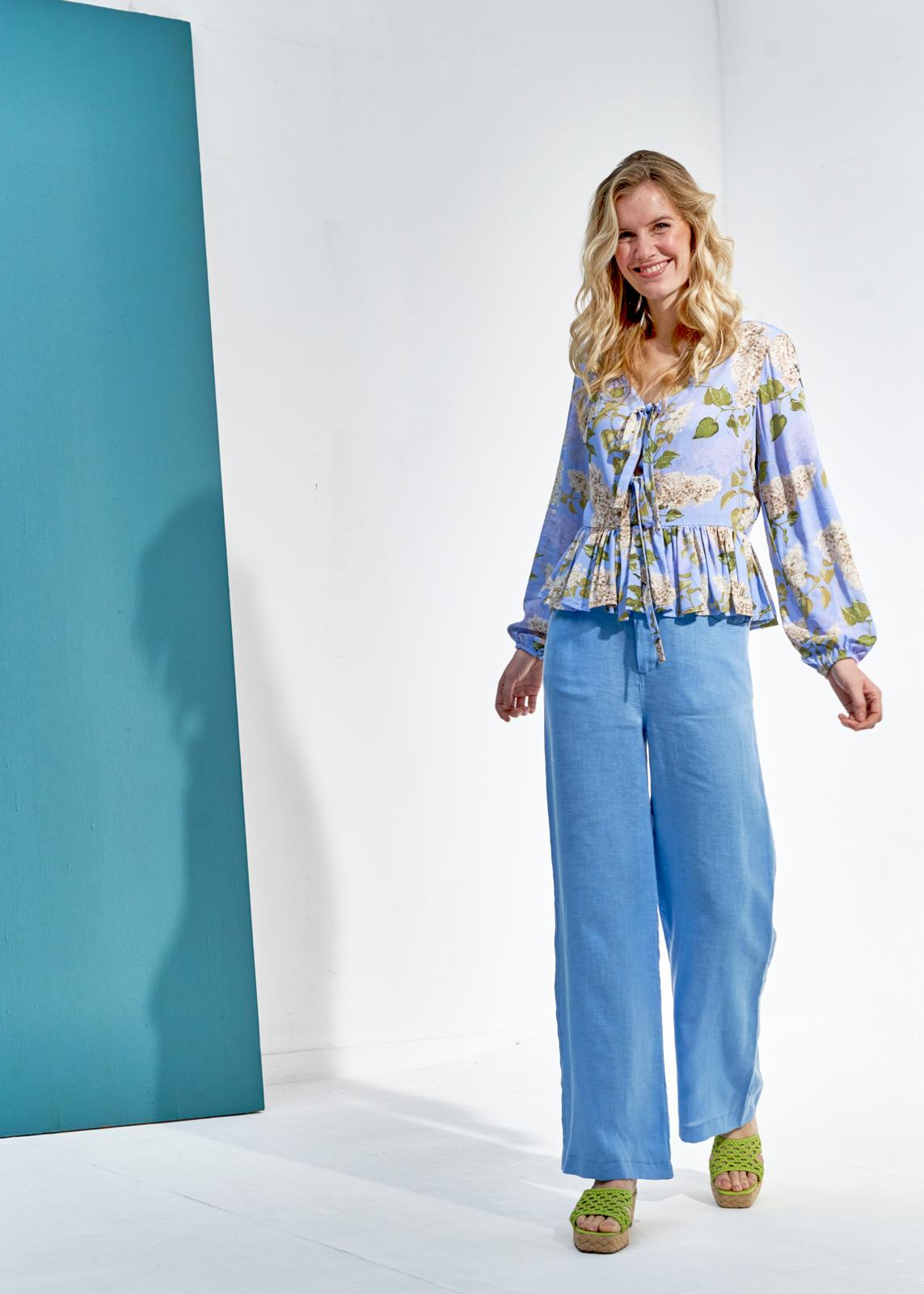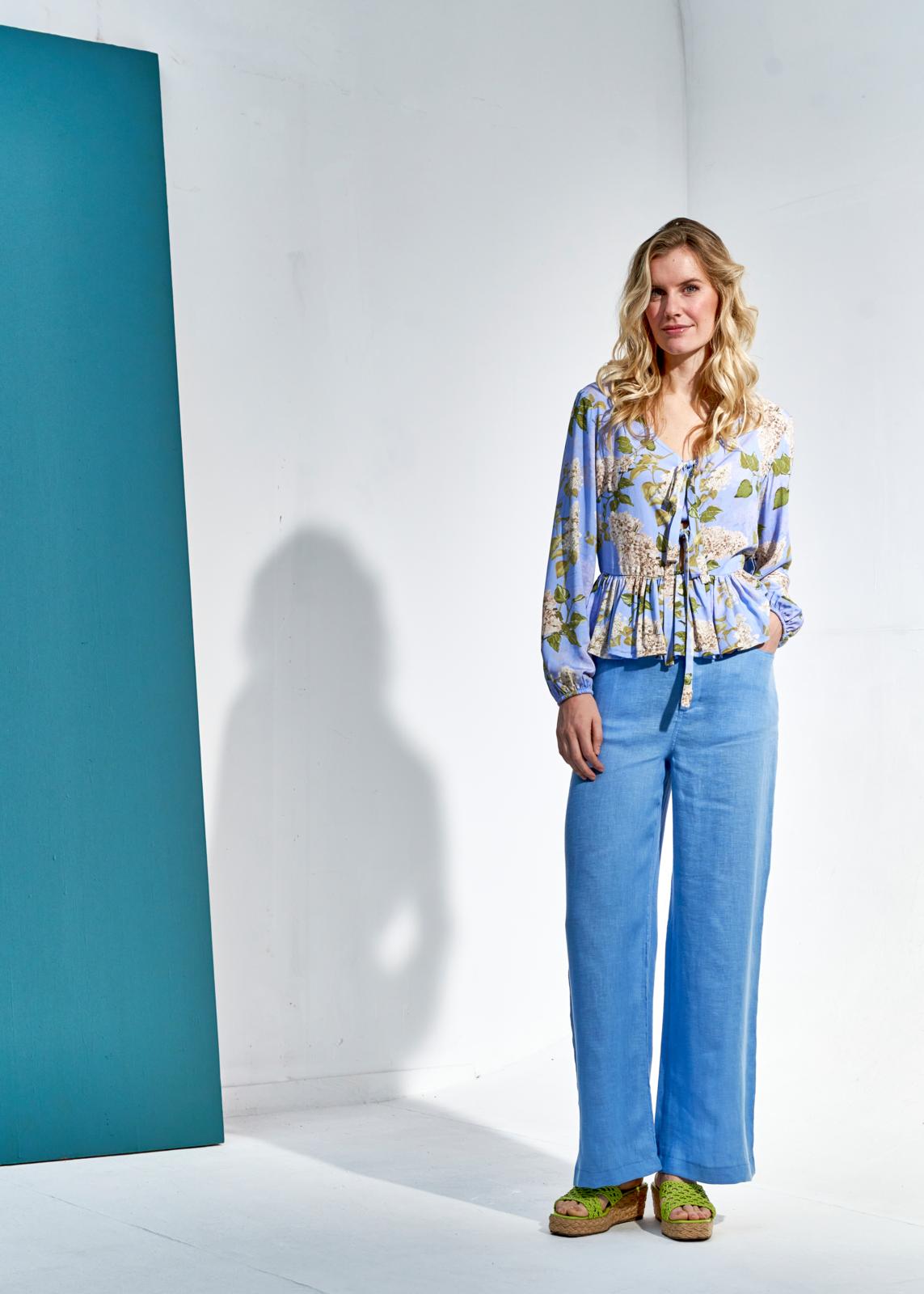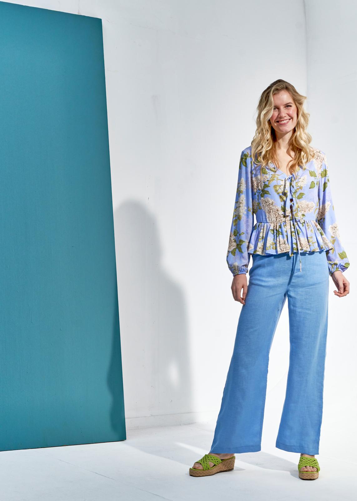 Deze sierlijke top met peplum heeft voor een diepe V-hals met striklinten voor de sier. Hij gaat aan met een lange blinde rits achter. De mouwen poffen door het elastiek onder in het zoompje.