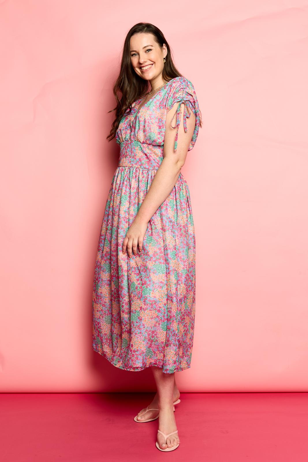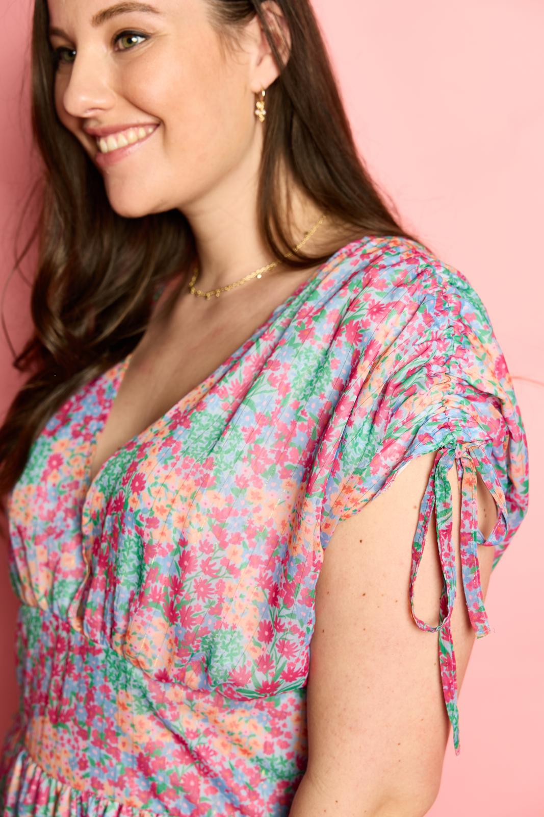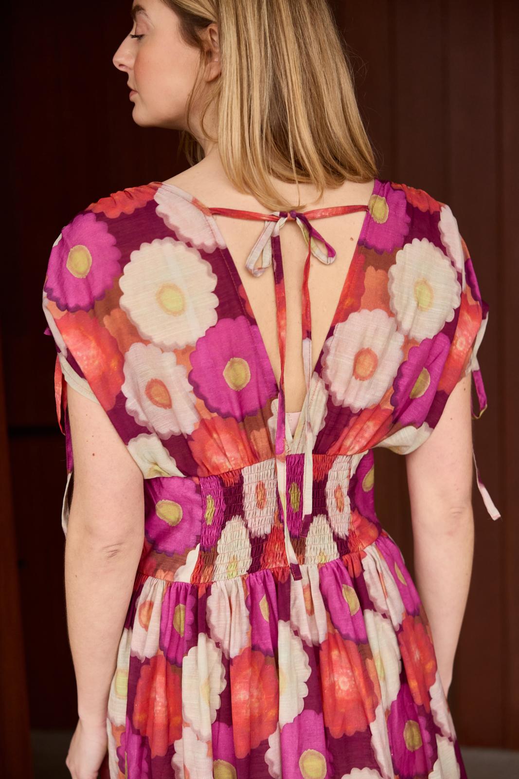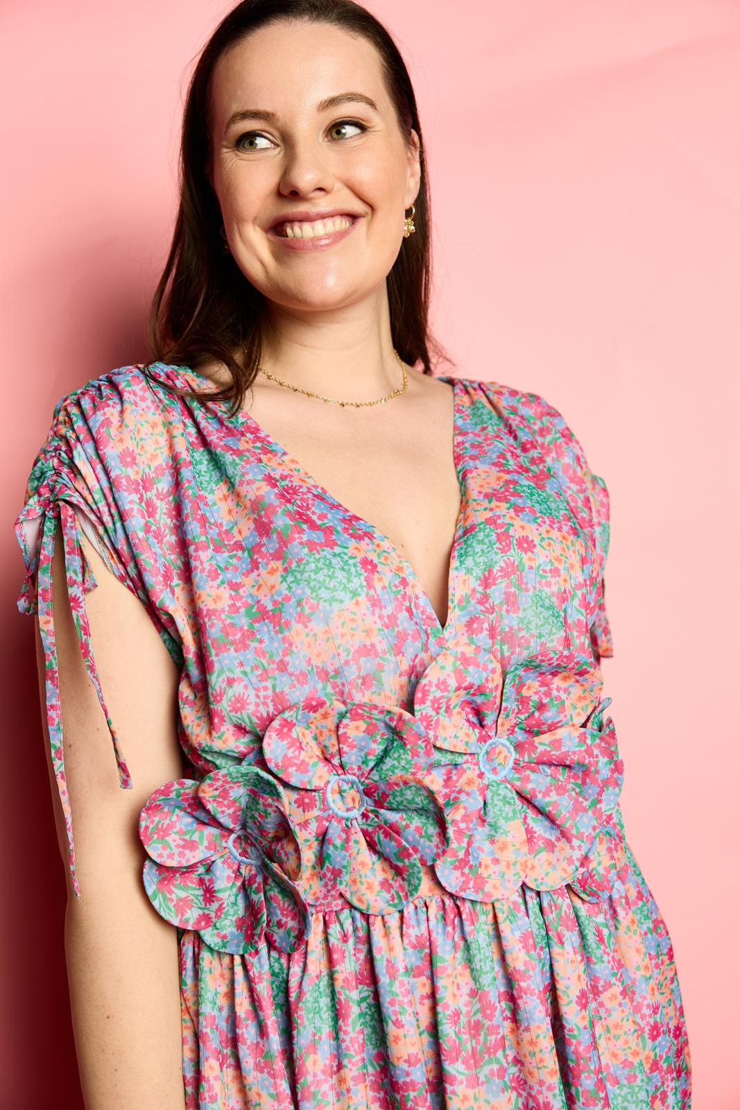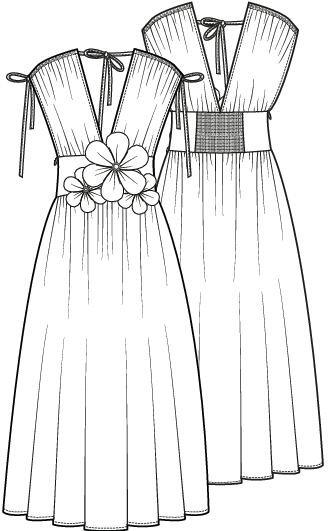 Een heerlijk zwierige jurk met voor en achter een diepe V-hals. Op de schouder zijn oprijgjes gemaakt. De hoge tailleband heeft achter een gesmokt deel (met fijn rimpelelastiek) voor veel draagcomfort. Superleuk om er bloemenbroches bij te maken van dezelfde stof. Daarmee maak je de stijl extra uitbundig.