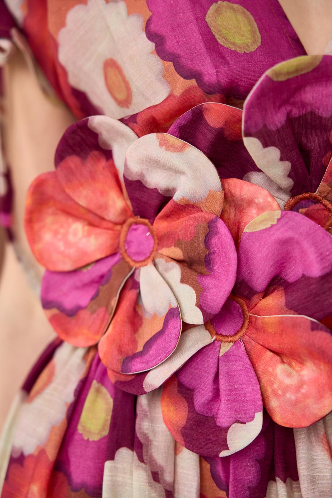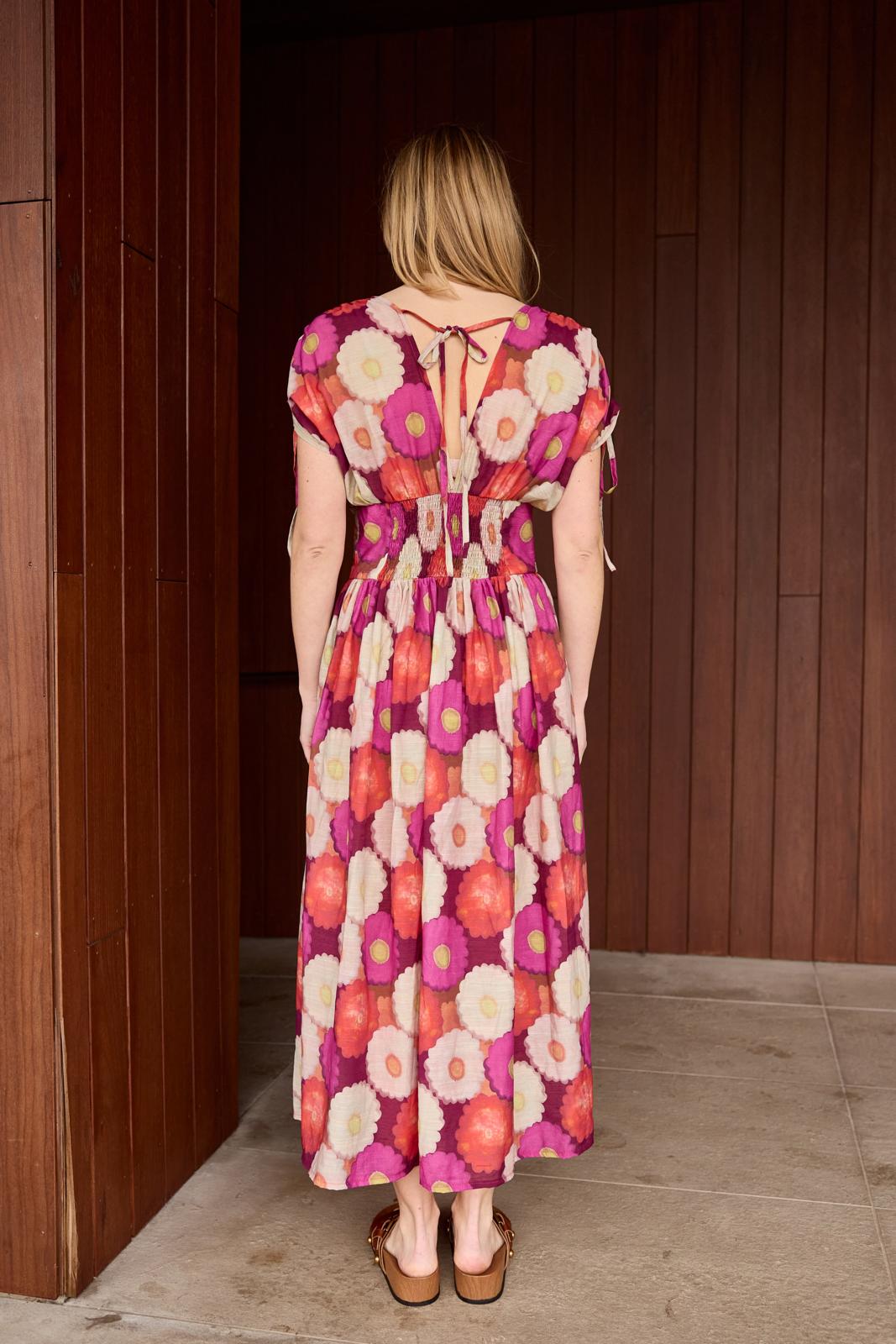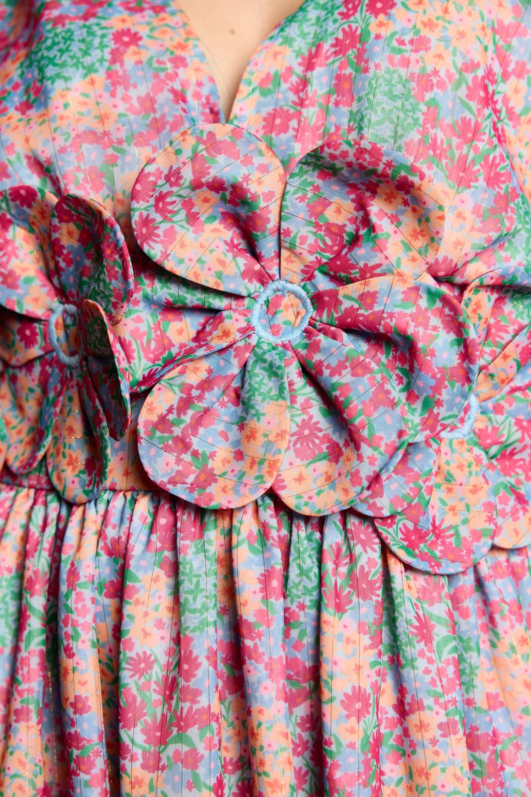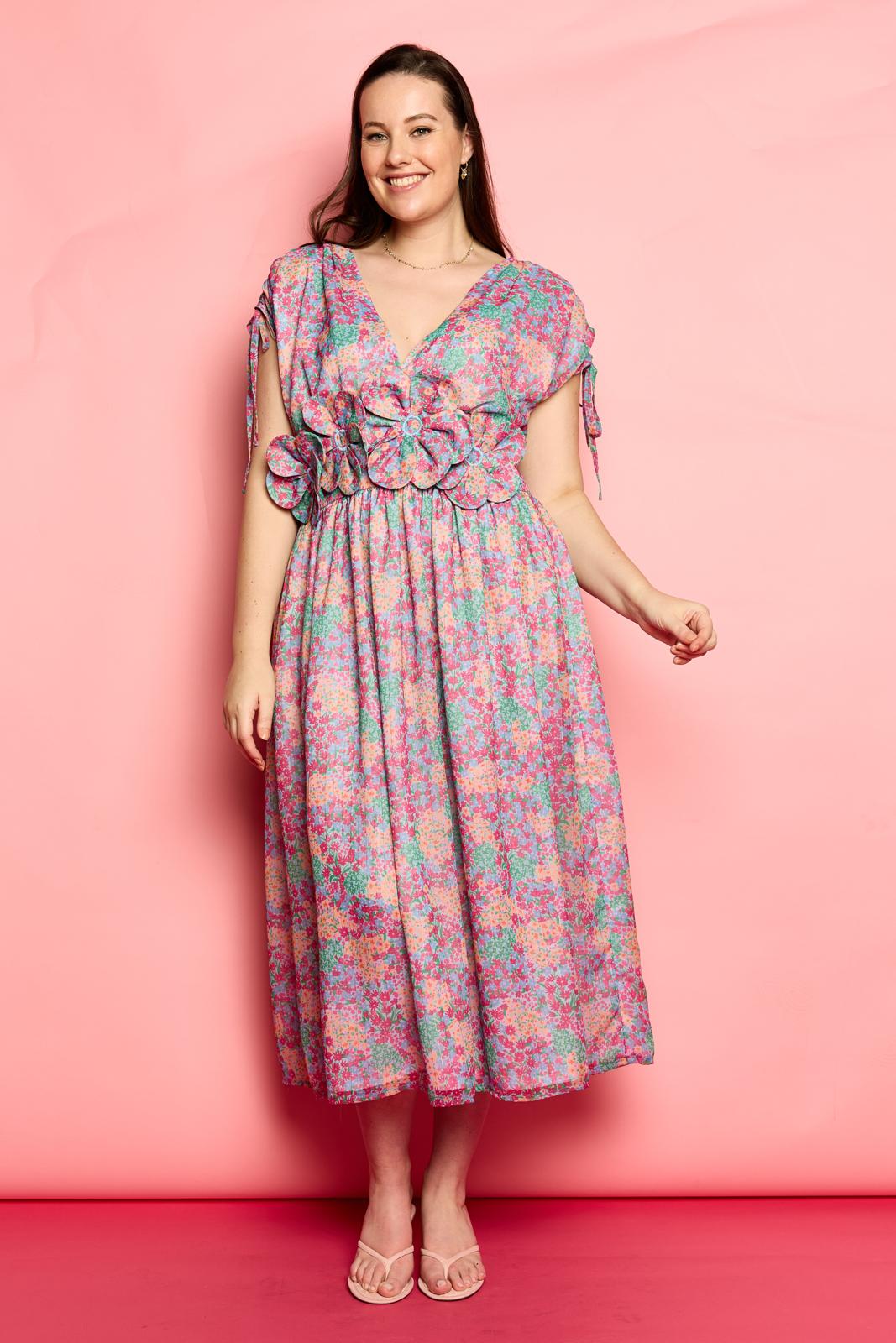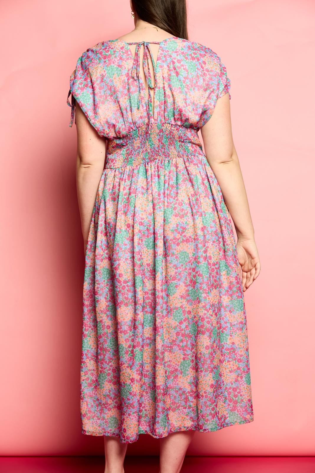Een heerlijk zwierige jurk met voor en achter een diepe V-hals. Op de schouder zijn oprijgjes gemaakt. De hoge tailleband heeft achter een gesmokt deel (met fijn rimpelelastiek) voor veel draagcomfort. Superleuk om er bloemenbroches bij te maken van dezelfde stof. Daarmee maak je de stijl extra uitbundig.