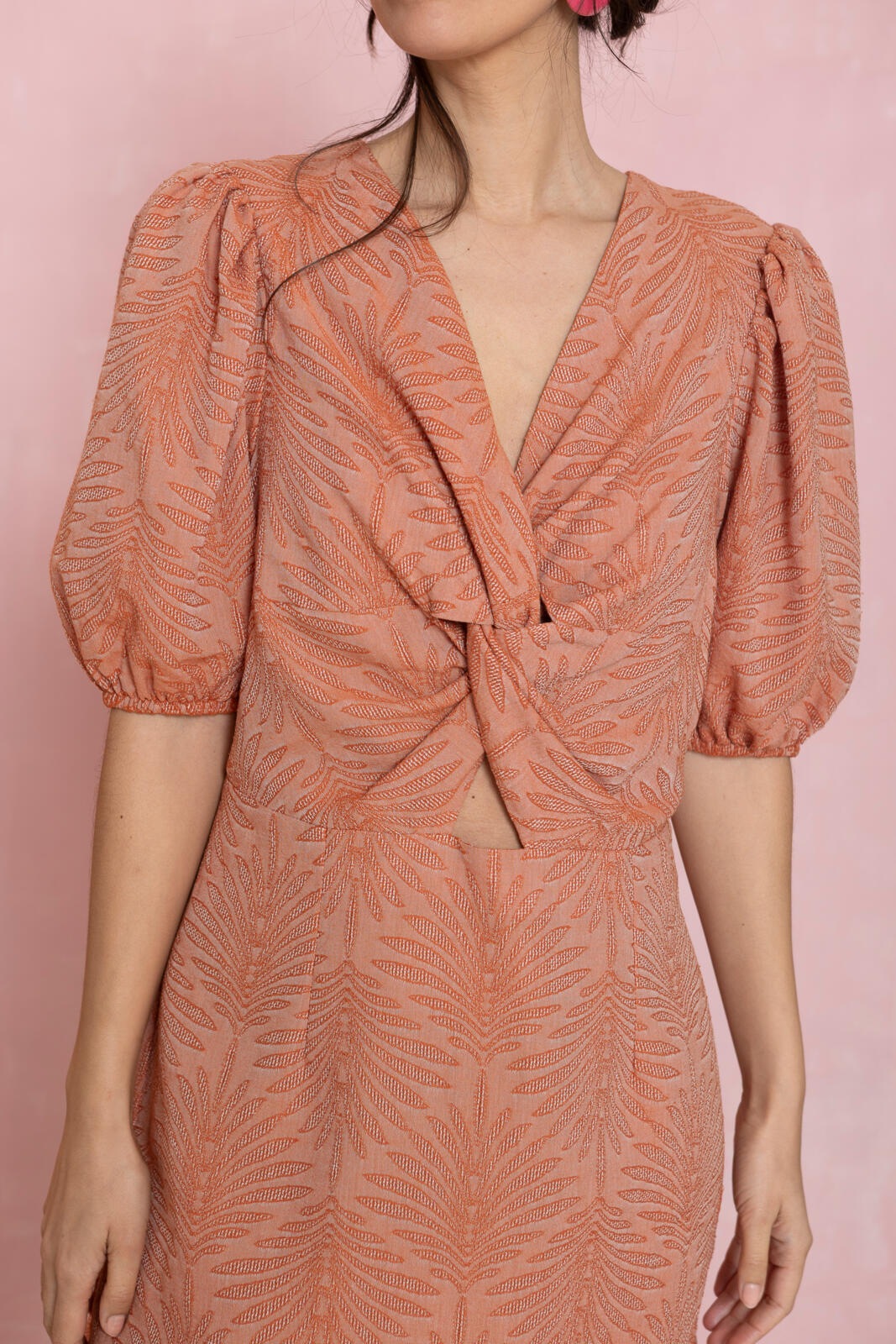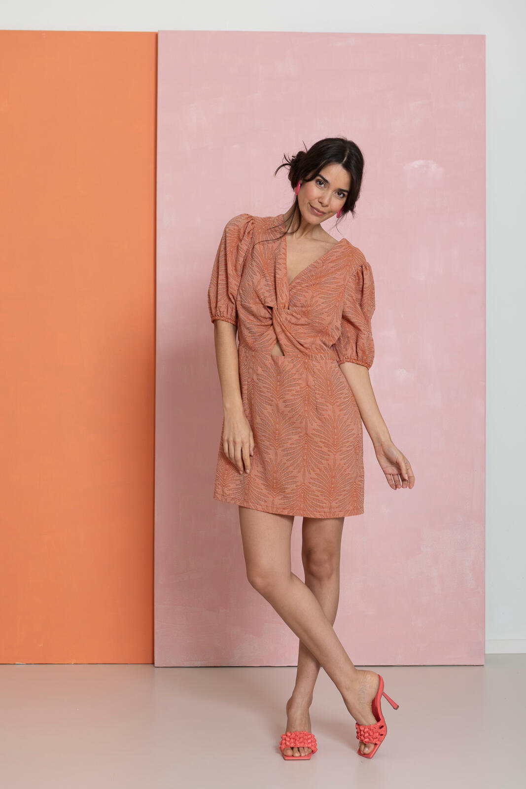 Geef er een draai aan! Deze getailleerde mini-jurk heeft een diepe V-hals met een bijzonder draaidetail en een kleine uitsparing eronder. Middenachter zit een blinde rits.
