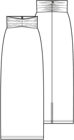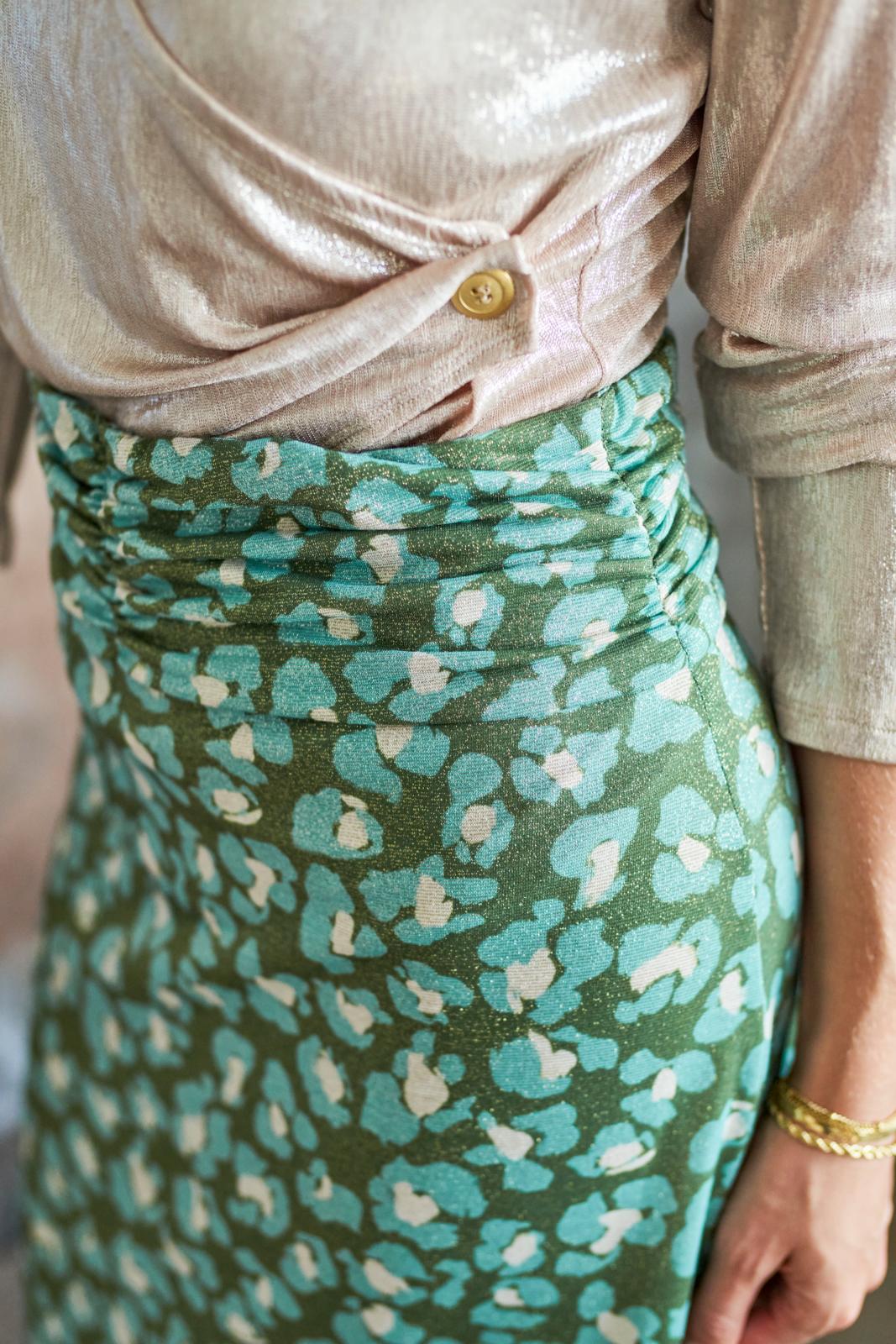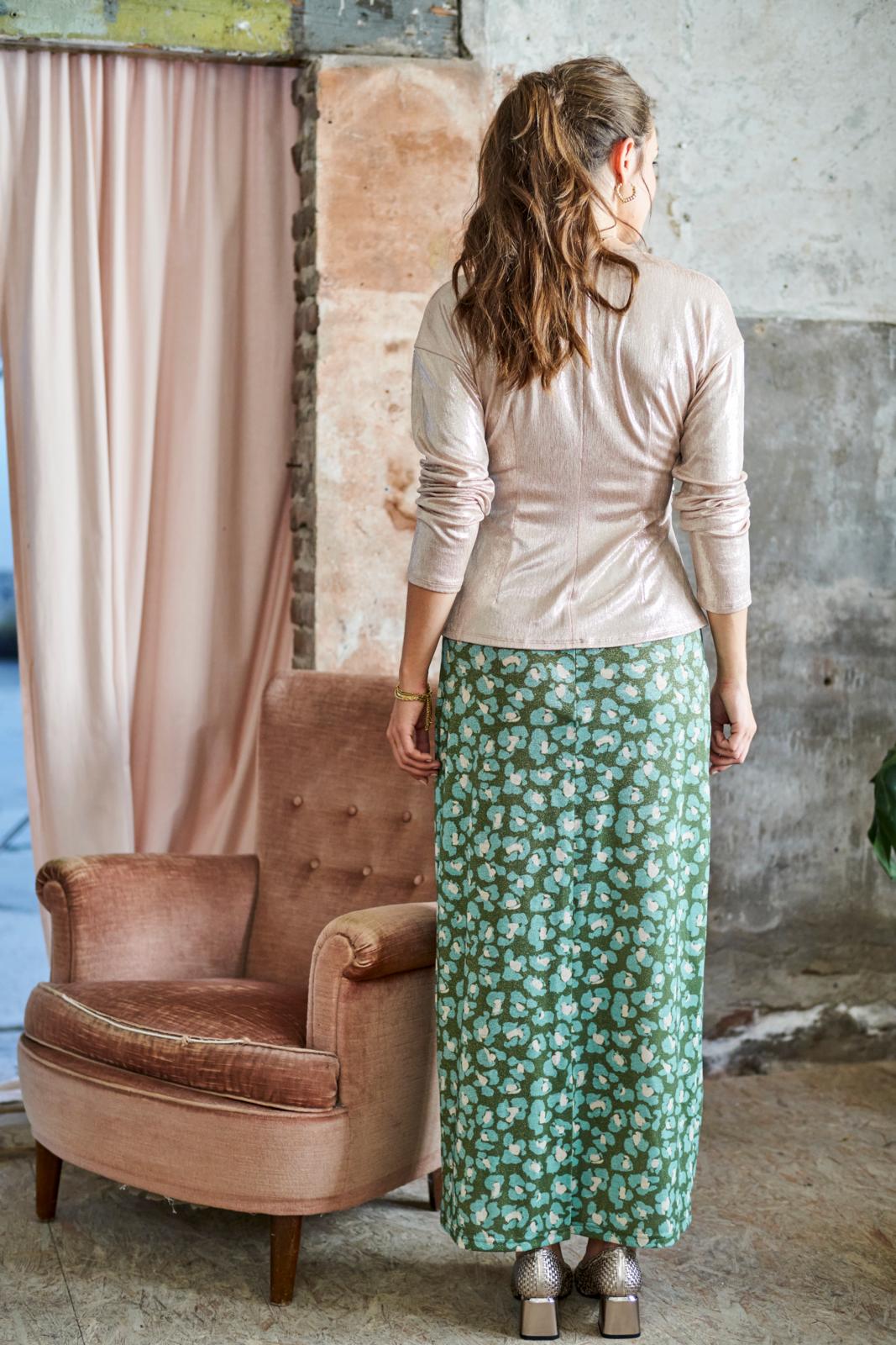 Deze kokerrok een gerimpelde 'tailleband' én blinde rits middenachter. De voorbeeldrok is uitgevoerd in jacquard-jersey met een glittertje, dat geeft vanzelf een feestelijk tintje.