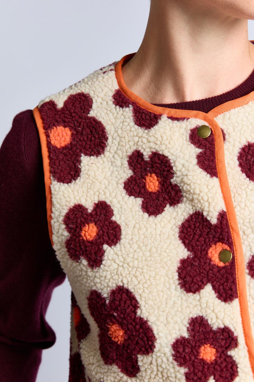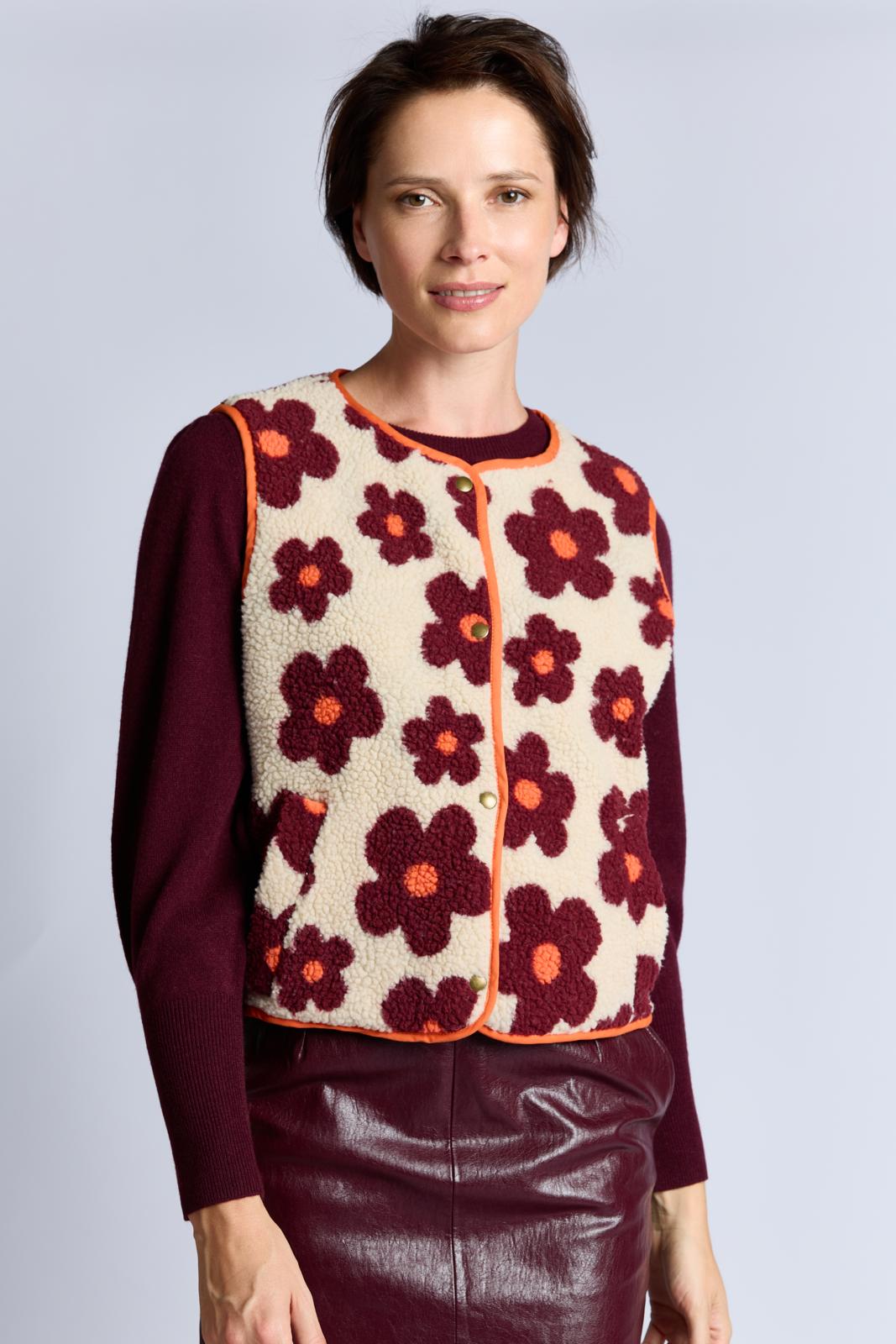 Of je dit mouwloze vest nu van langharig imitatiebont maakt of van teddy met een print, hier ga je zeker veel plezier van hebben. Dit exemplaar is langs de randen afgewerkt met oranje katoenen biaisband. Het heeft strookzakjes en sluit met drukknopen.