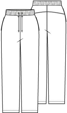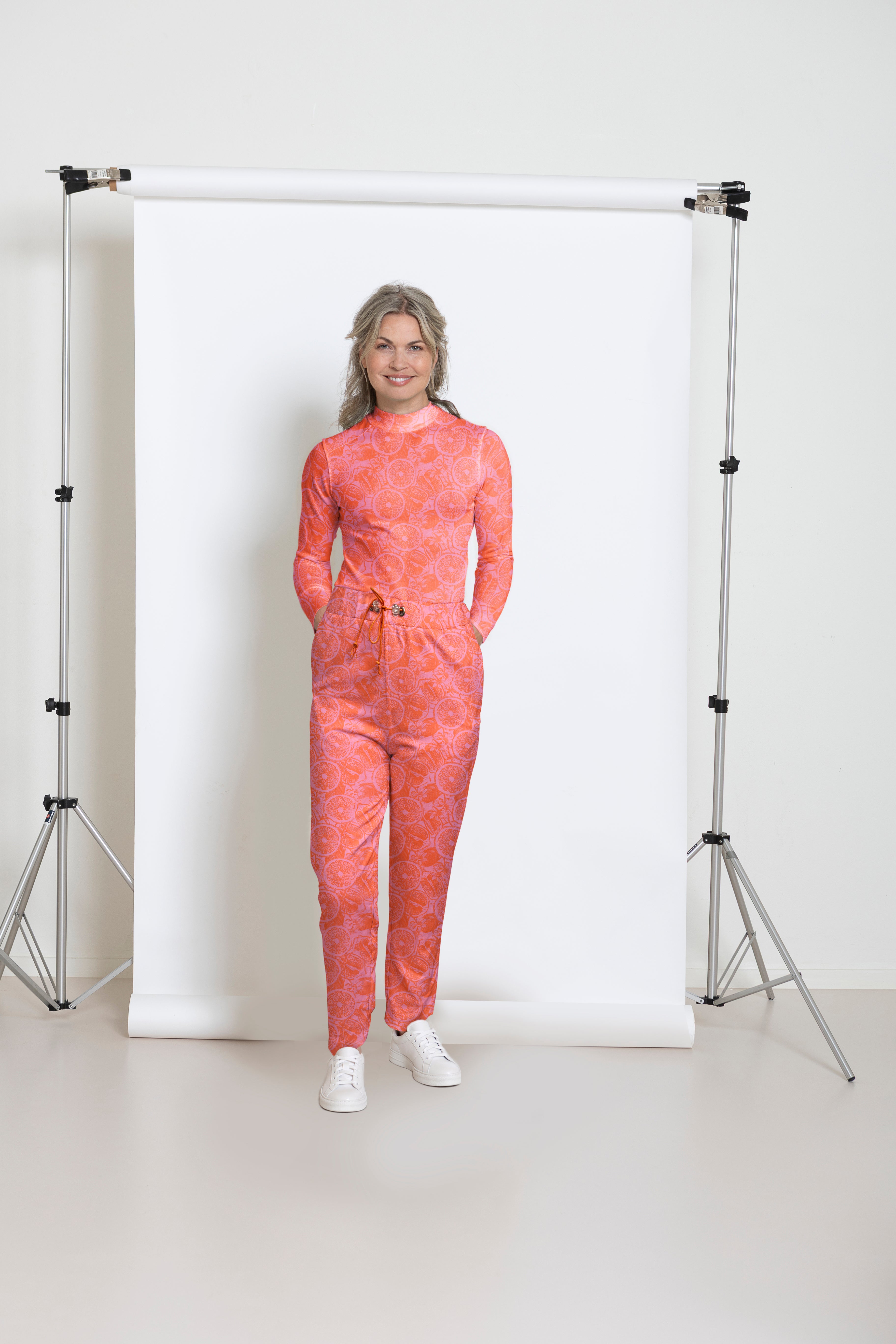 Een sporty broek met speciale details zoals een mooi gevormde heuppas achter, steekzakken voor en een band met tunneltjes met elastiek plus een strikkoordje.