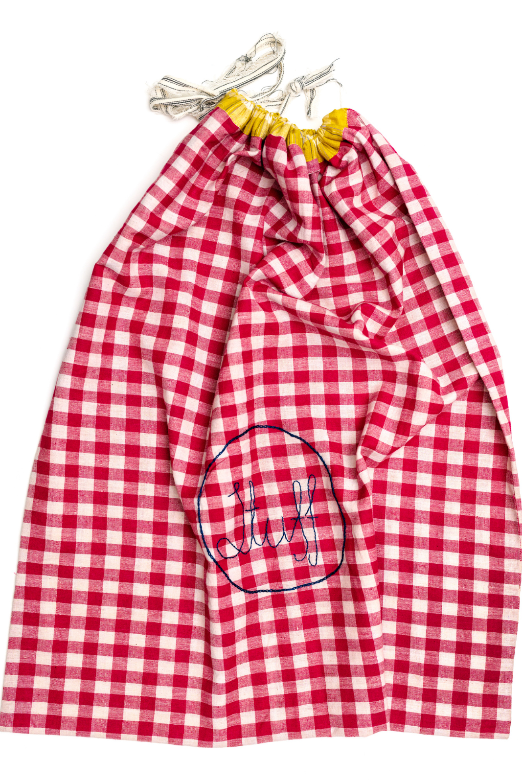 Maak een stijlvolle trekkoordtas met een contrasterende tunnel voor het koord. Dit patroon bevat daarnaast een sjabloon voor het geborduurde woord ‘Stuff’, wat de tas een speelse en persoonlijke uitstraling geeft. Ideaal als opbergzak of cadeautas.