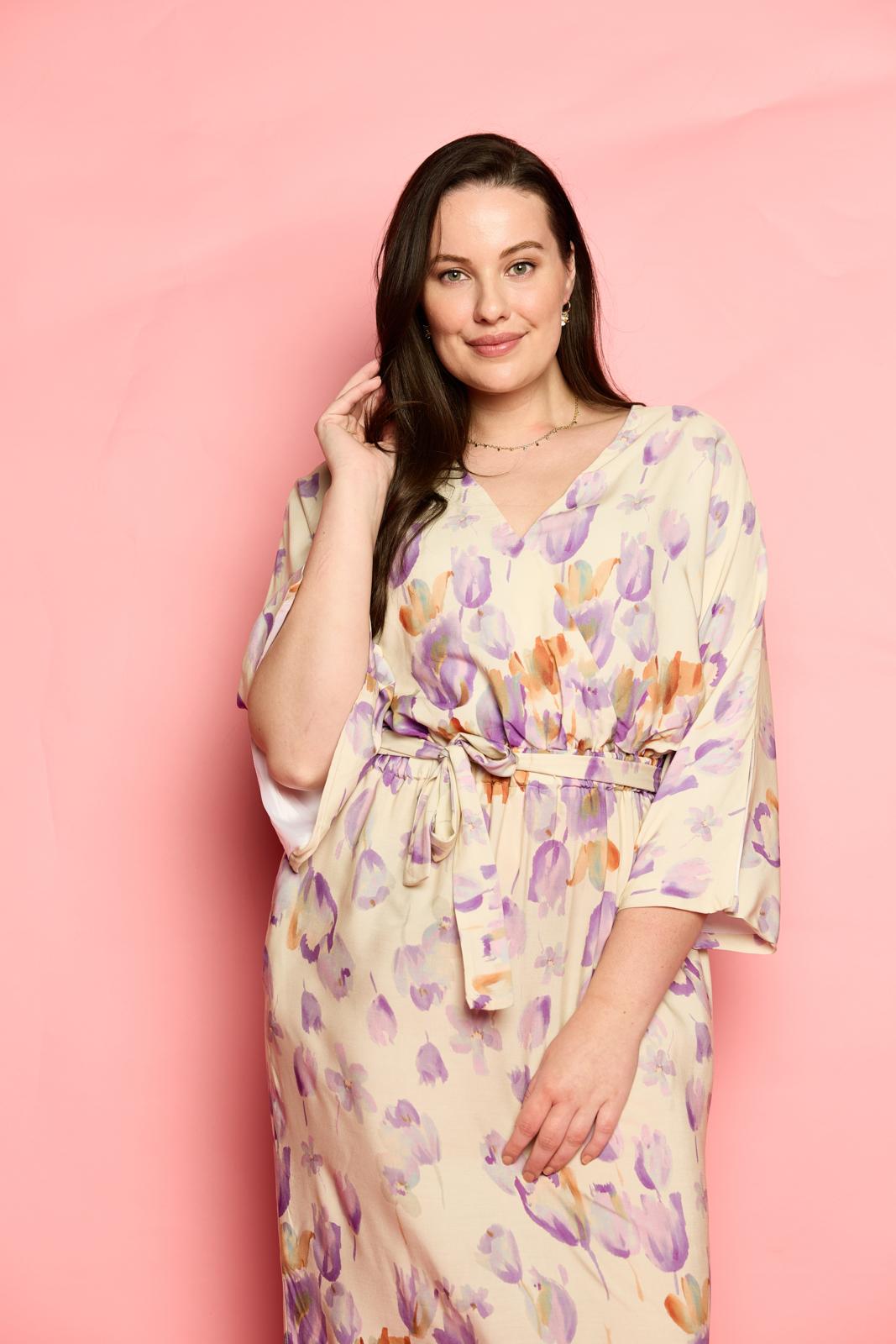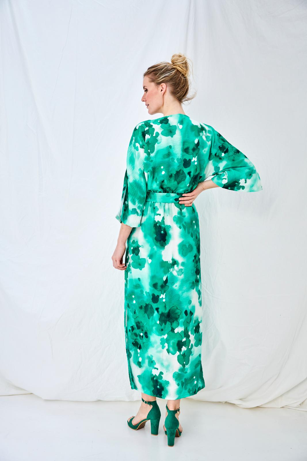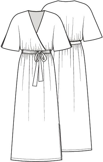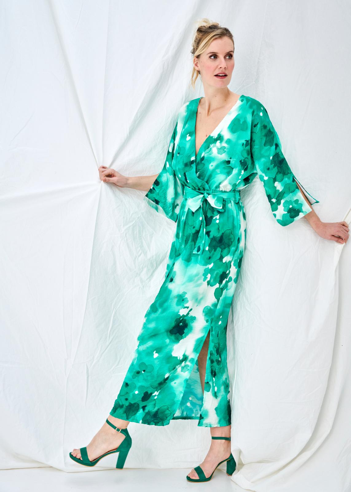 Dit kimonomodel is een typisch geval van ‘easy elegance’. Een eenvoudige jurk met veel uitstraling door het overslageffect en de grote splitten in de mouwen. Het lijfje (de bovenkant) van de jurk is gevoerd voor een mooie afwerking. In de taille wordt elastiek gezet. De bijpassende strikceintuur is optioneel.