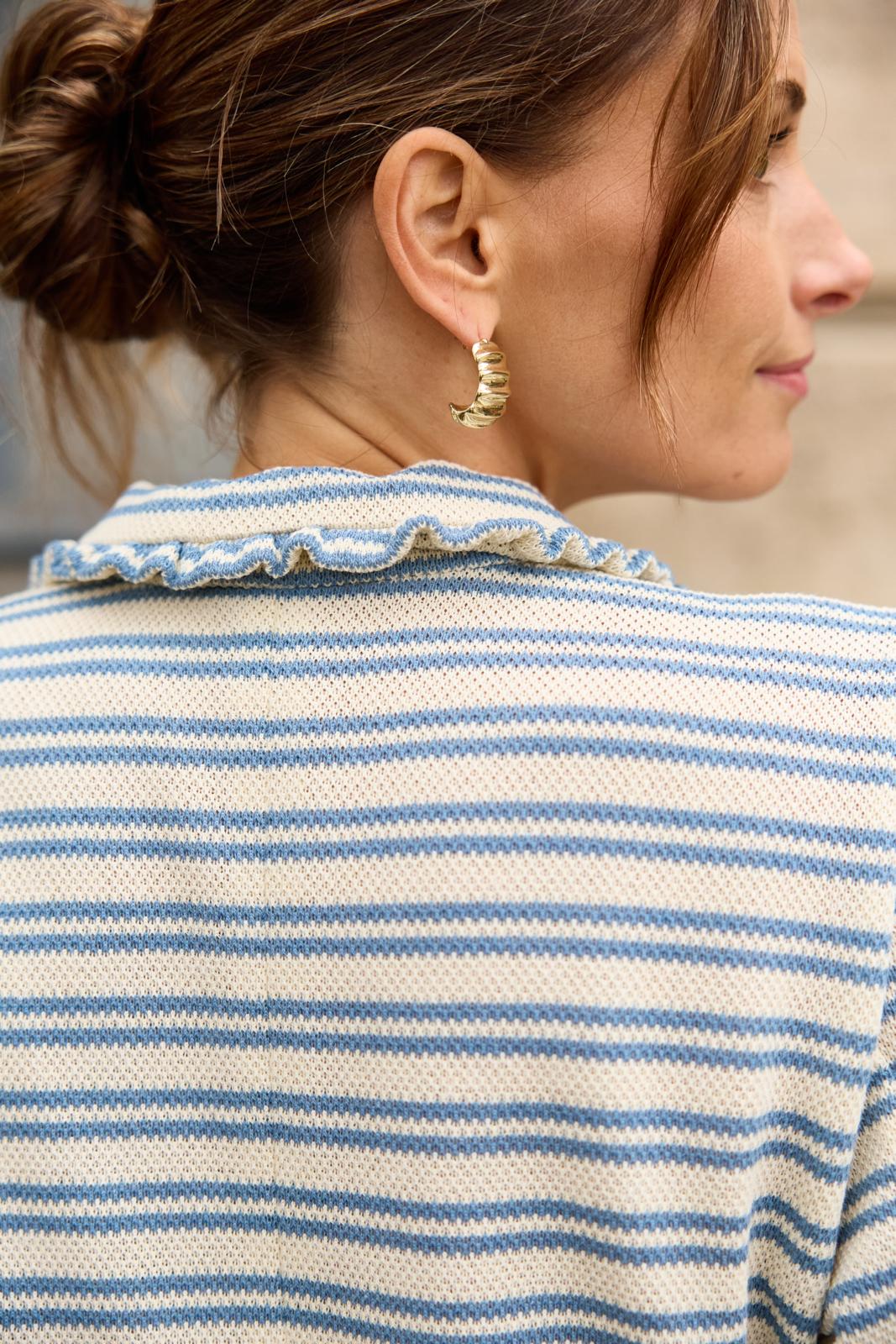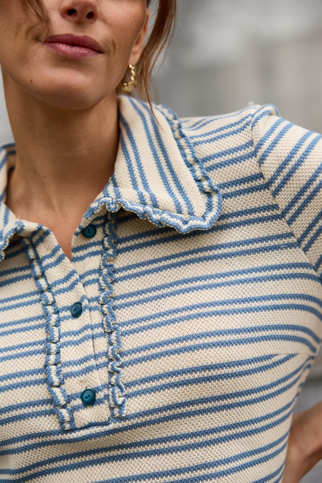 Dit polopatroon heeft coupenaadjes bij de buste voor een mooie fit. De gestreepte piquéstof en rucheskraag zorgen voor een retro-uitstraling. Laat eventueel de boord aan de onderkant weg voor een relaxte fit.