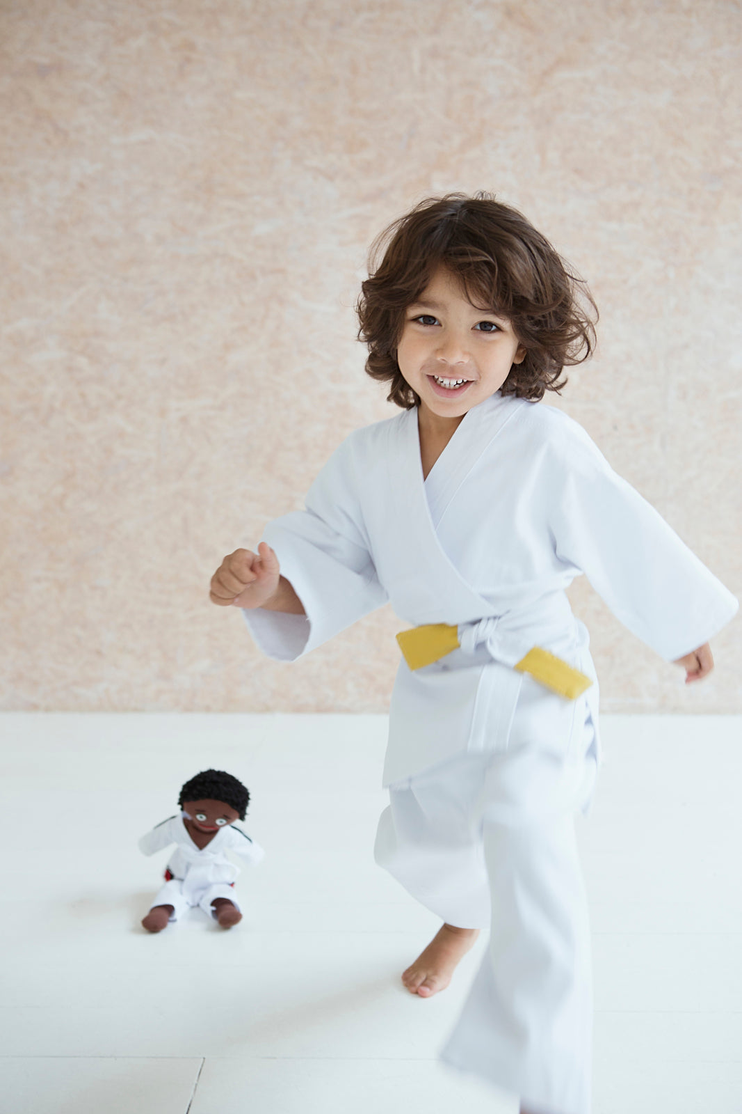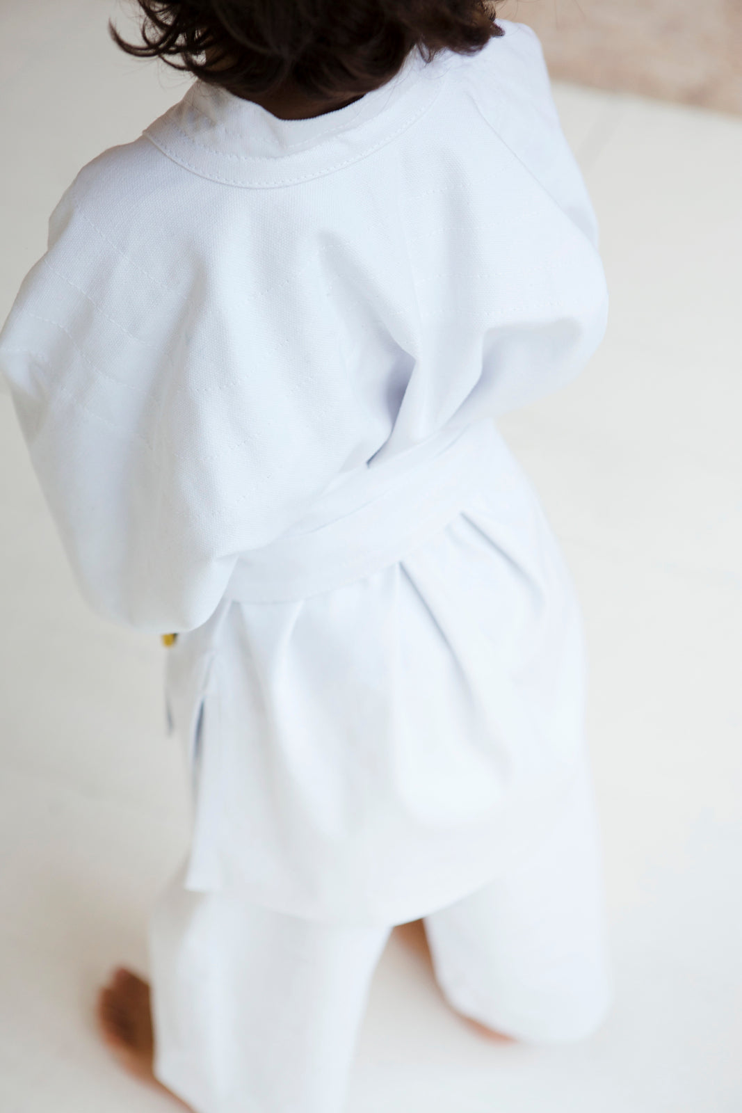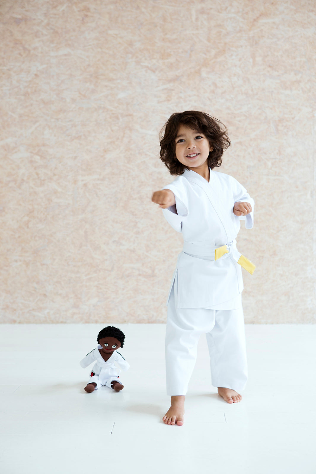 Stof voor de maten 80: 0, 30 m; 86/92/98: 0, 35 m; 104/110: 0, 40 m; 116/122: 0, 45 m; boordstof voor de maten 80 t/m 122: 0, 10 m