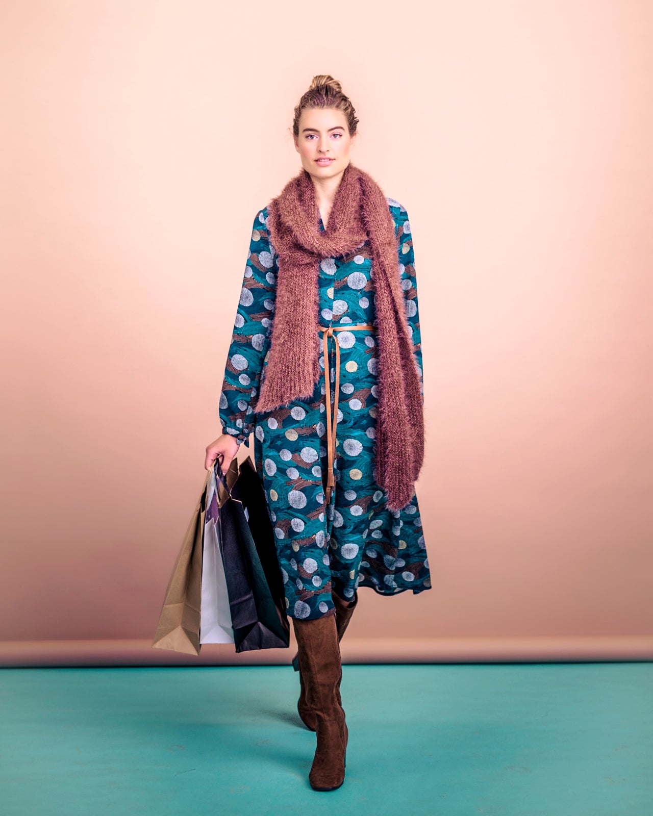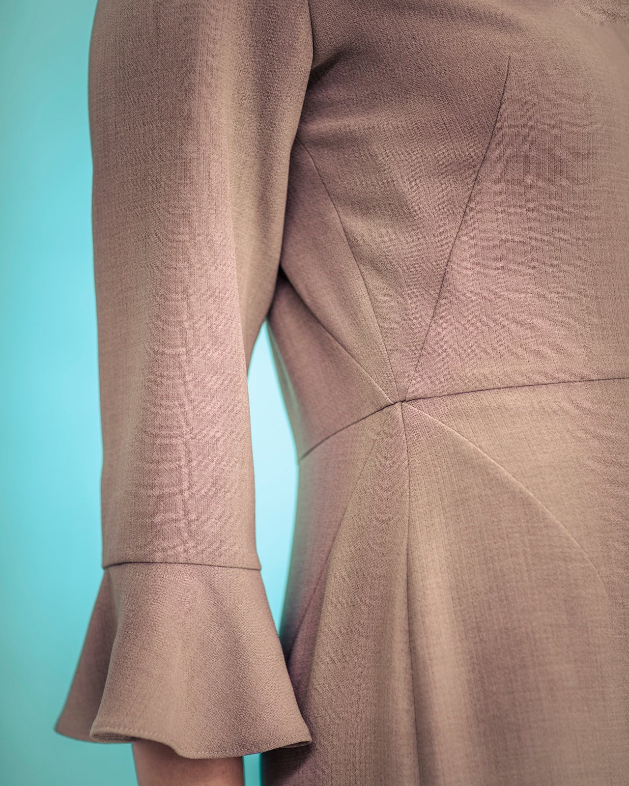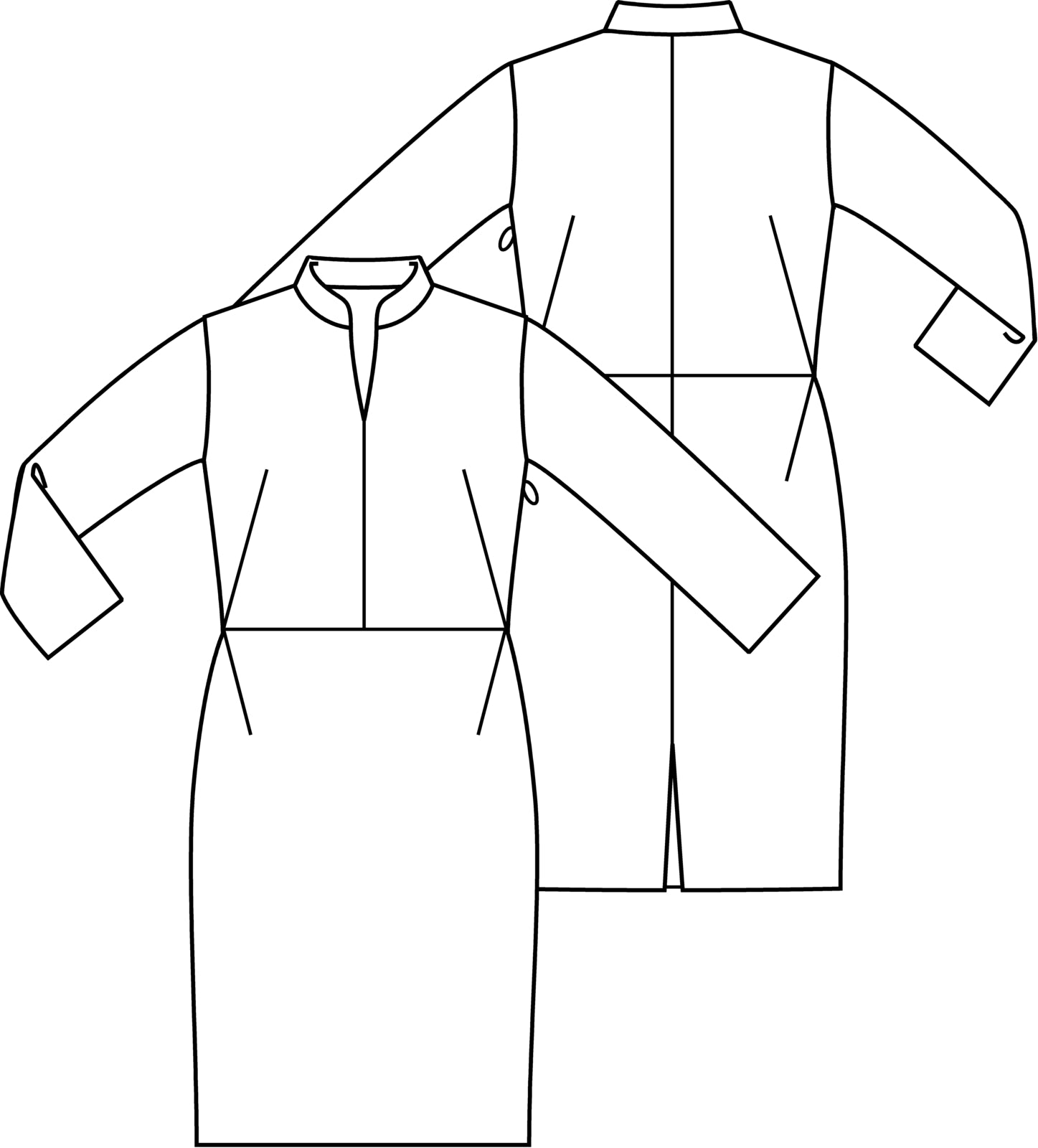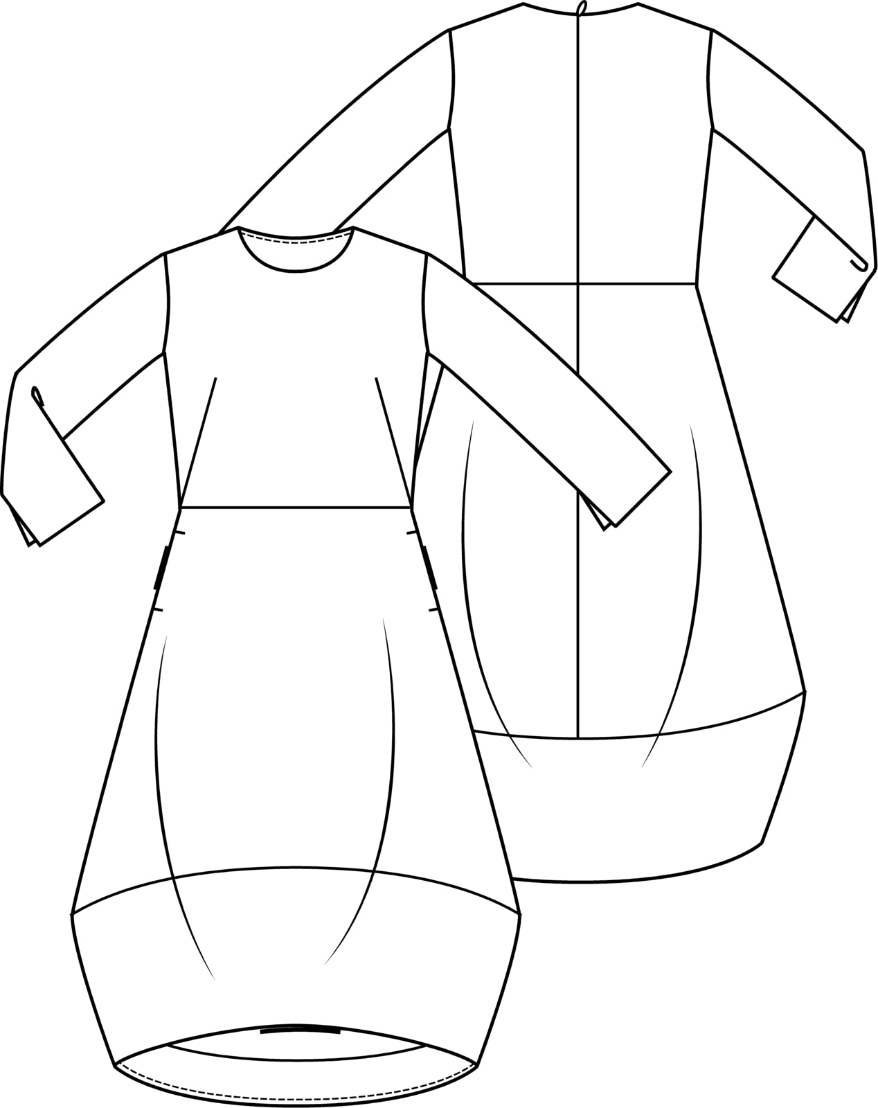 Dit model heeft driekwartmouwen met een splitje, een gerende rok met zakken en aan de onderzijde een brede strook die weer naar binnen valt.