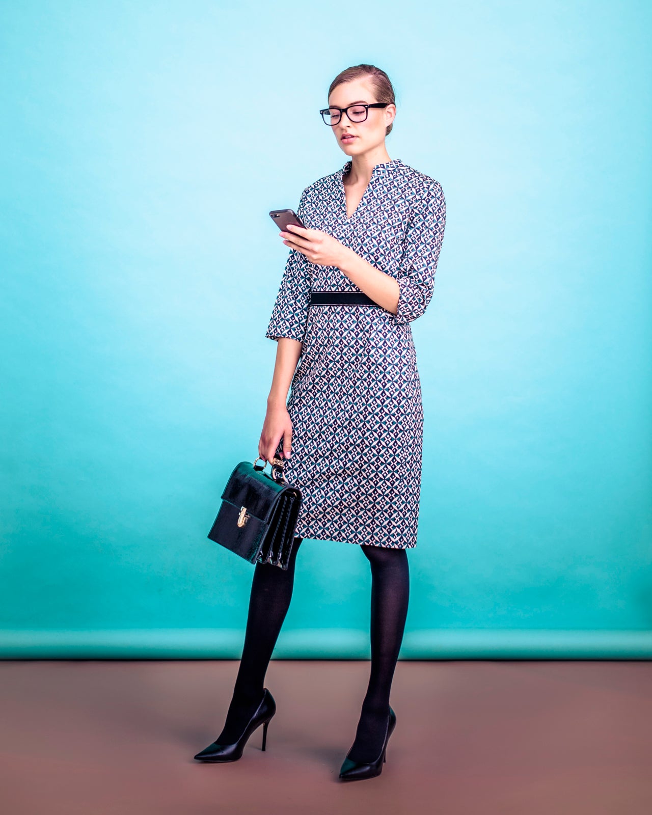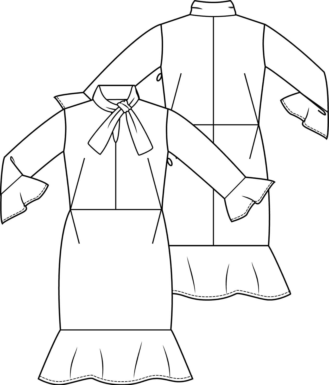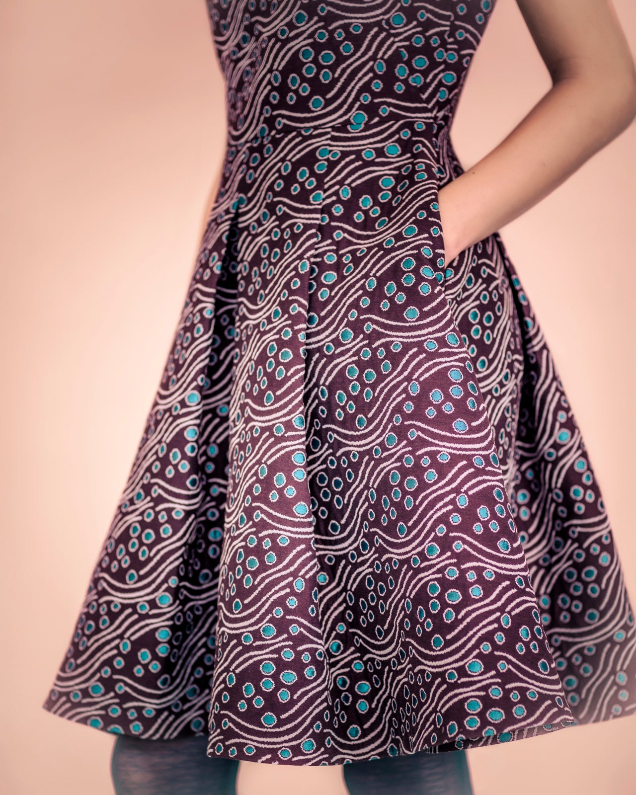 Dit model heeft driekwartmouwen met een splitje, een gerende rok met zakken en aan de onderzijde een brede strook die weer naar binnen valt.