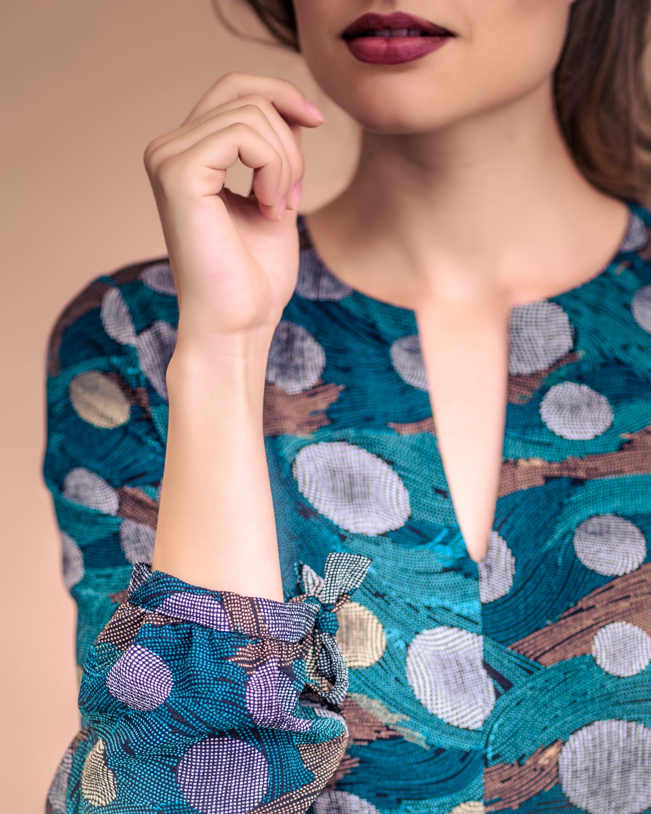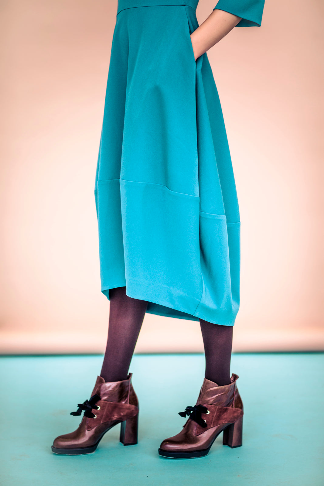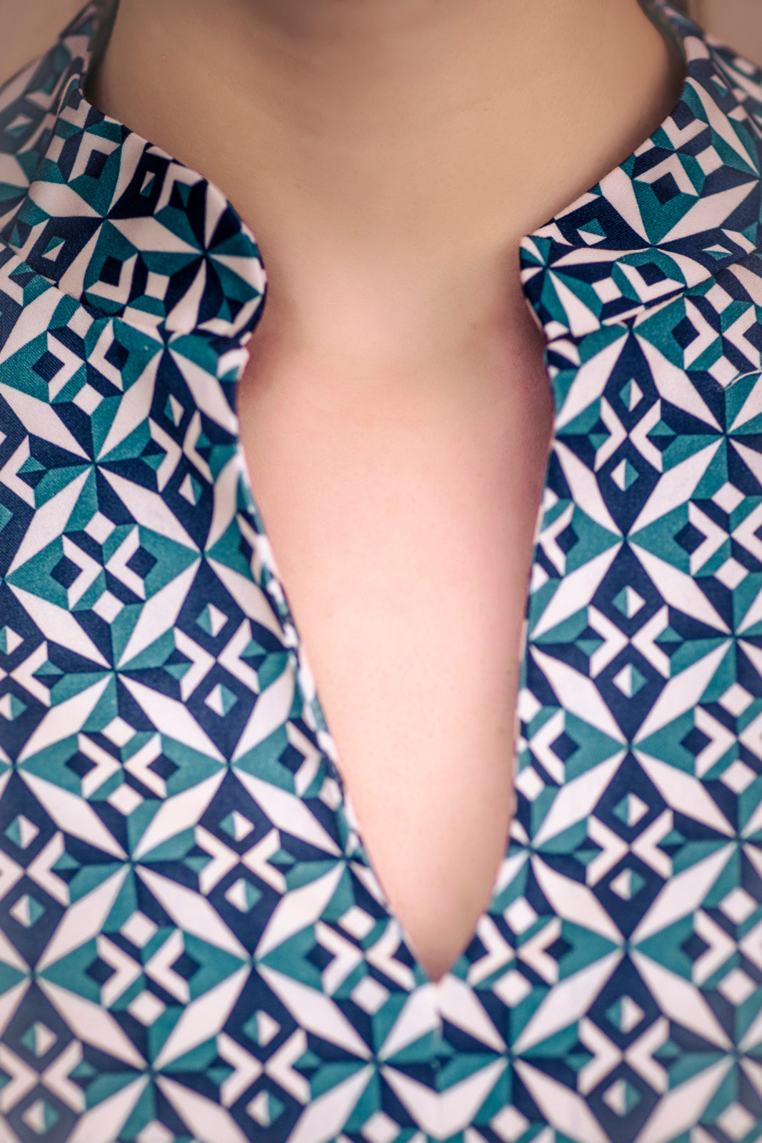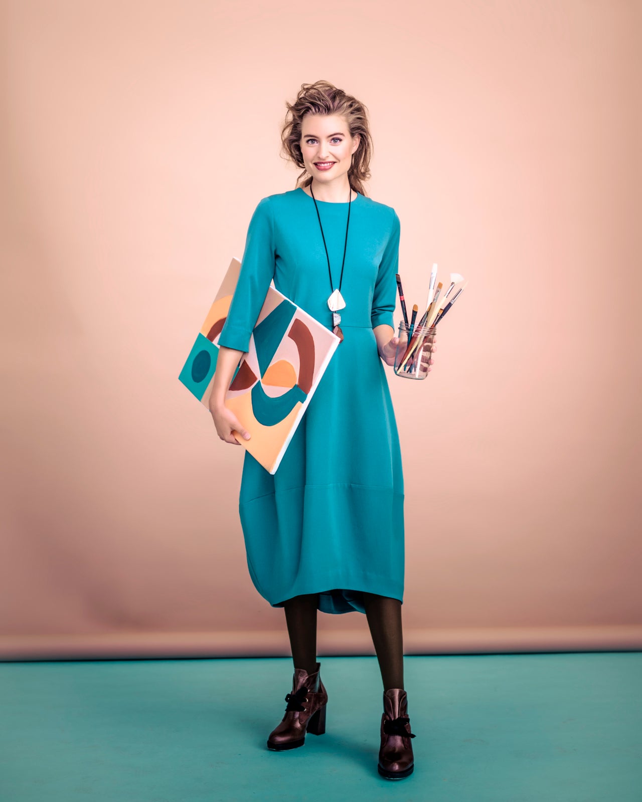Dit model heeft driekwartmouwen met een splitje, een gerende rok met zakken en aan de onderzijde een brede strook die weer naar binnen valt.