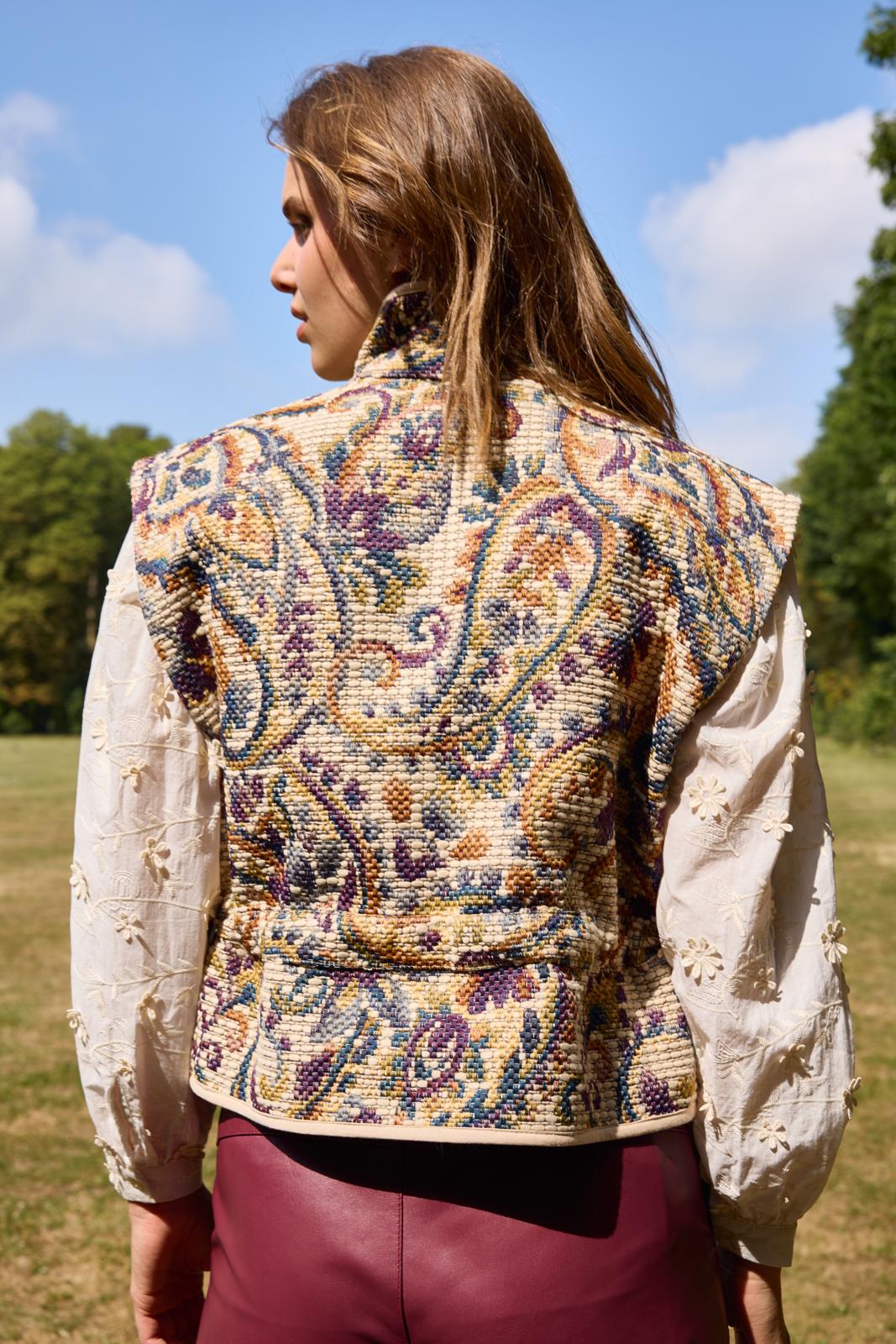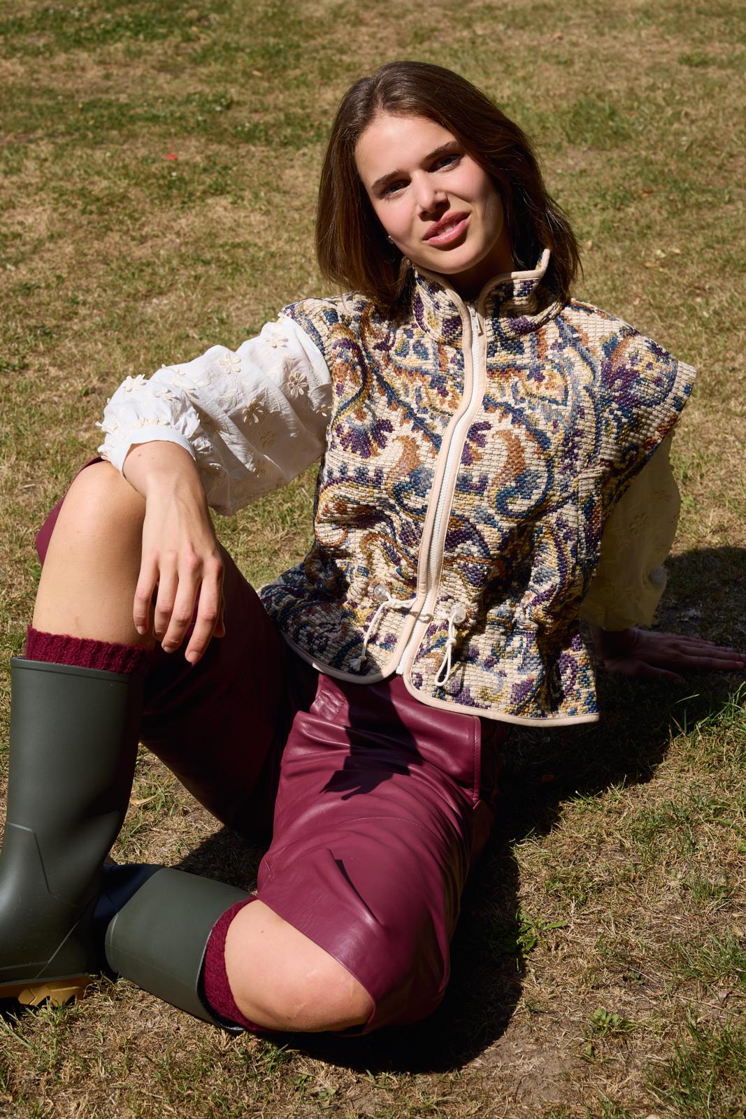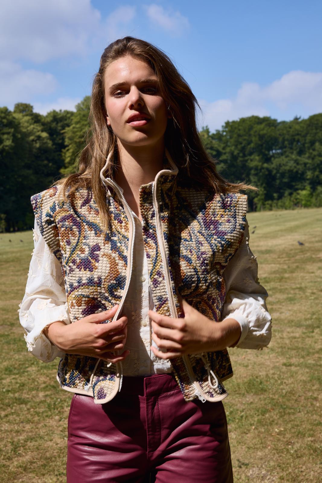 Deze bodywarmer heeft die leuke eighties vibe door het aangeknipte kapmouwtje met schoudervulling. Je kunt hem stoer uitvoeren maar ook klassiek. Het model is gevoerd en heeft een trekkoord met stoppers in de taille voor een mooie pasvorm. De randen zijn afgewerkt met biaisband.