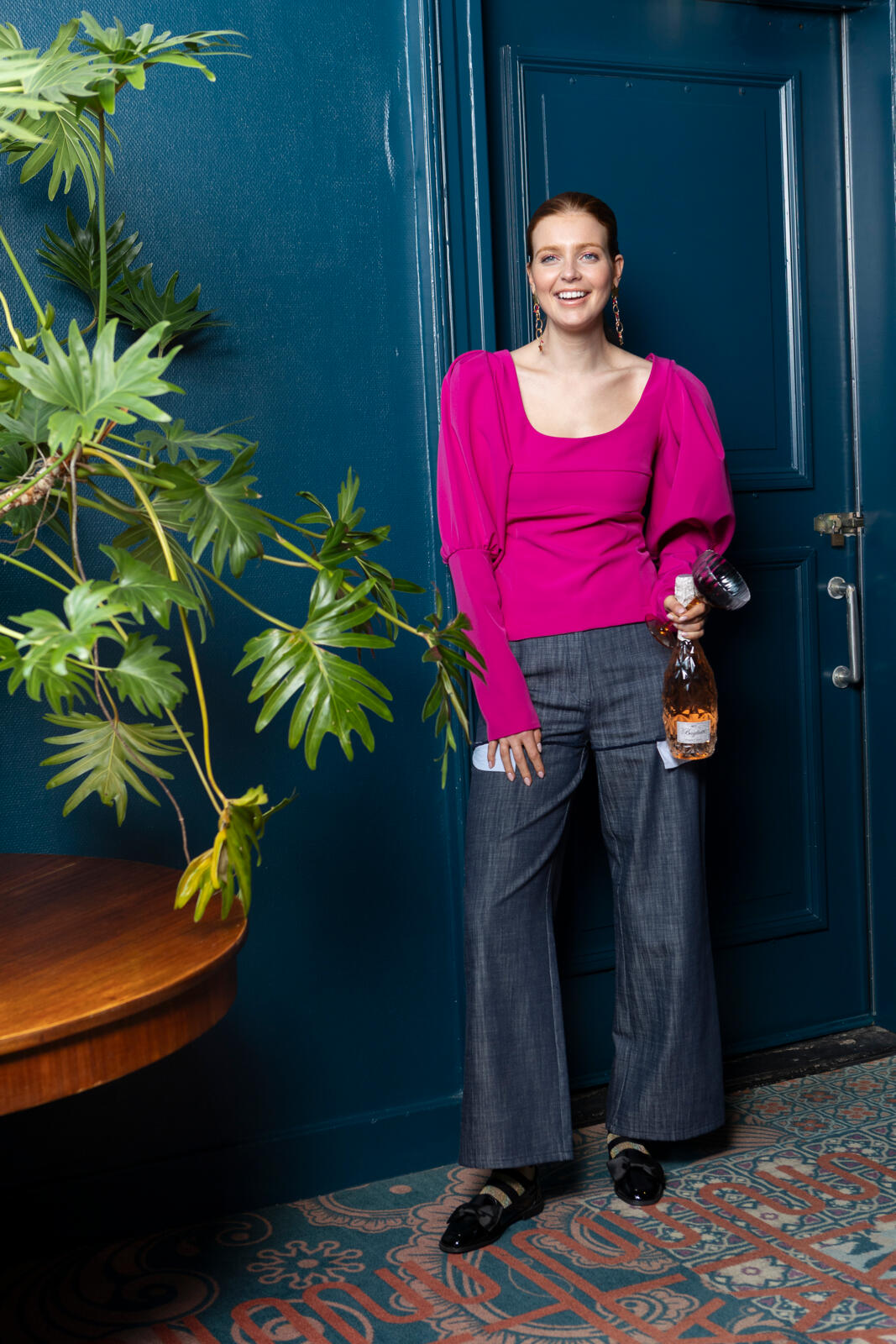 De broek is een recht jeansmodel met zakken in de deelnaad van de pijpen. De zakklepjes zijn gemaakt van een gestreept oud overhemd. Achter heeft-ie een heuppas en twee opgestikte zakken.