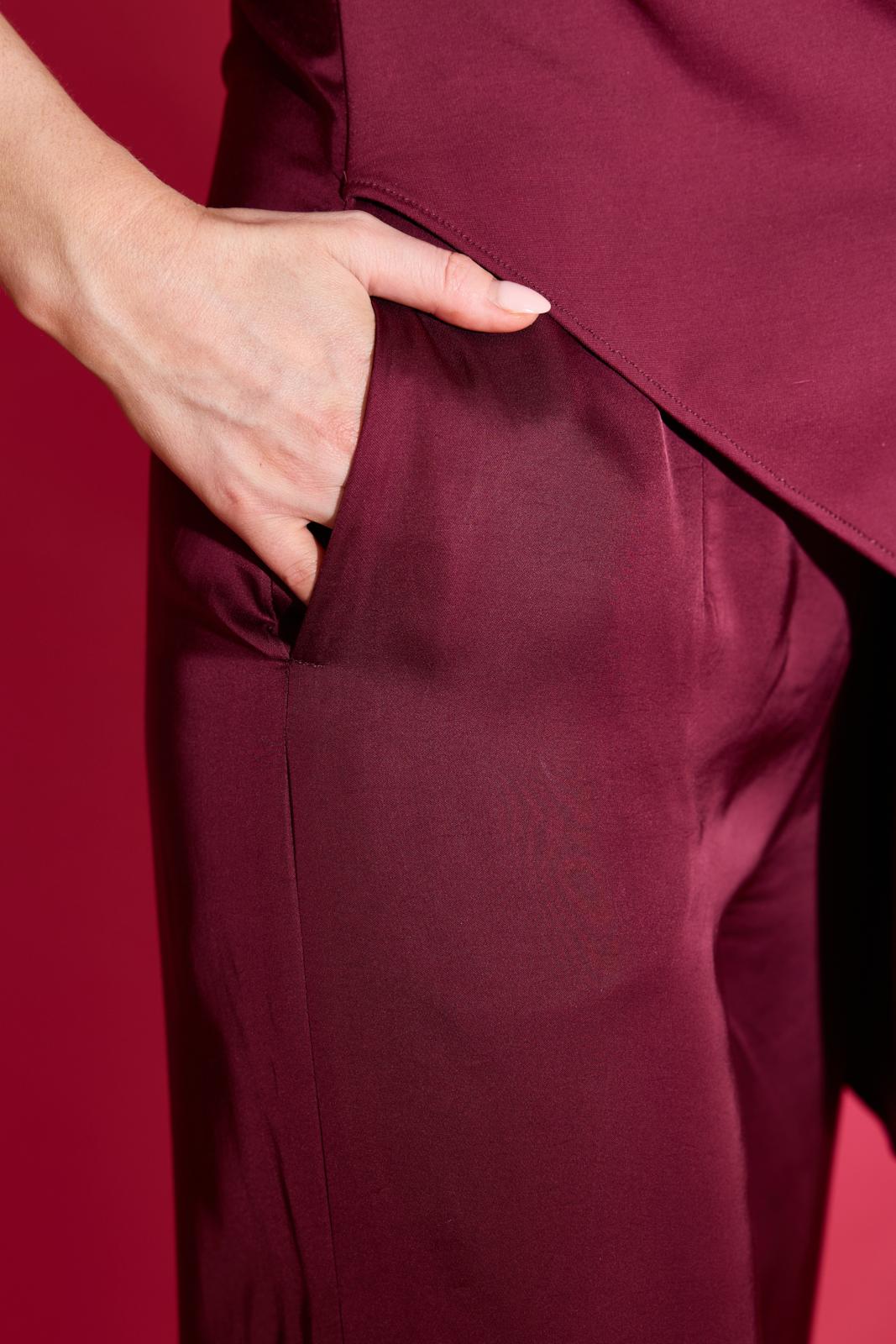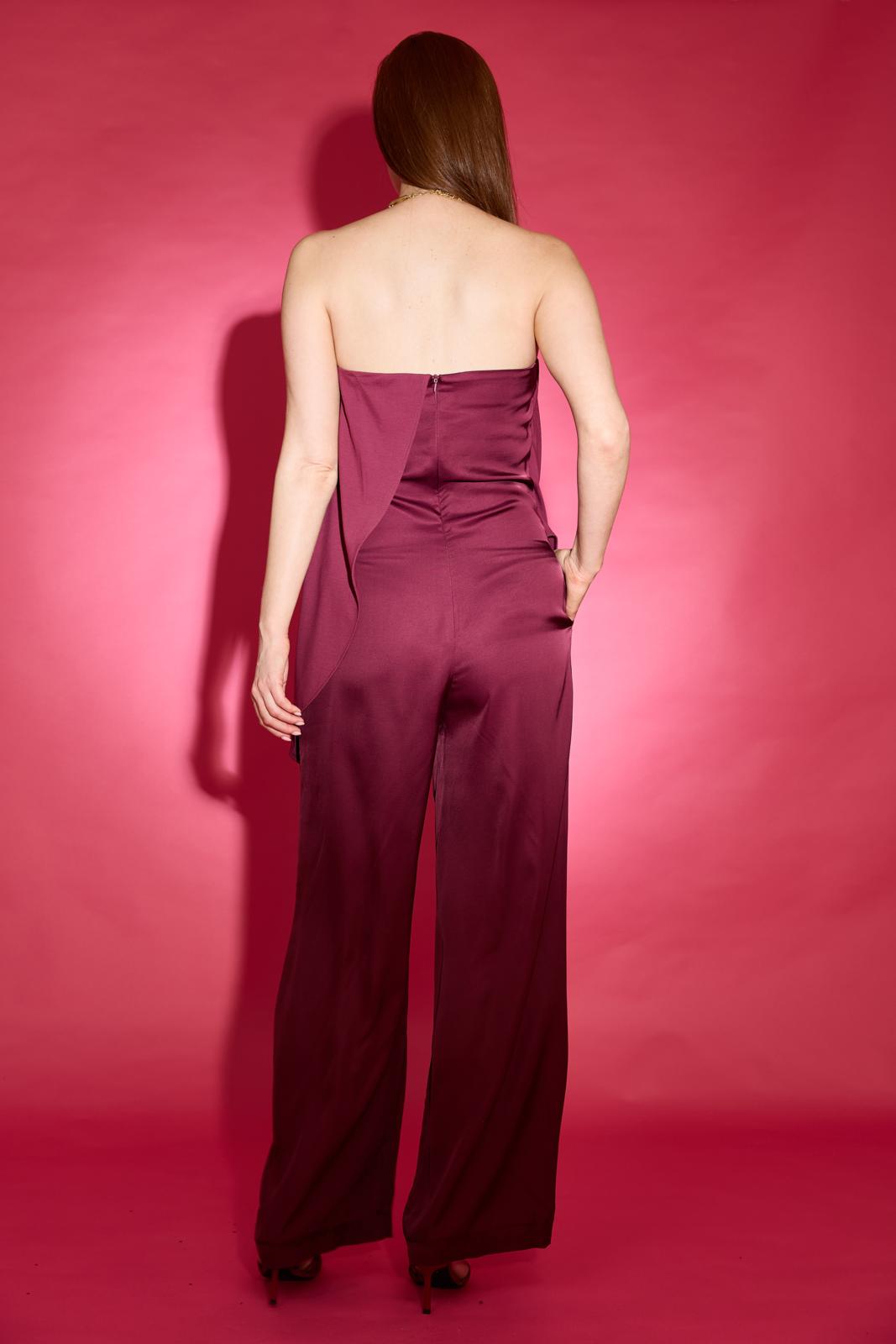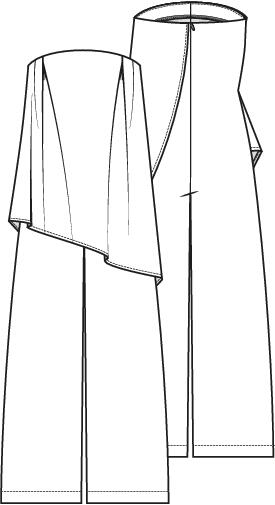 Deze stylish jumpsuit, van licht glanzende satijn, bestaat uit een eenvoudige sluike basis met een los vallend asymmetrisch pand erover. Stik eventueel antislipband – aan de binnenkant - tegen de bovenrand. Het pak gaat aan met een lange blinde rits achter.