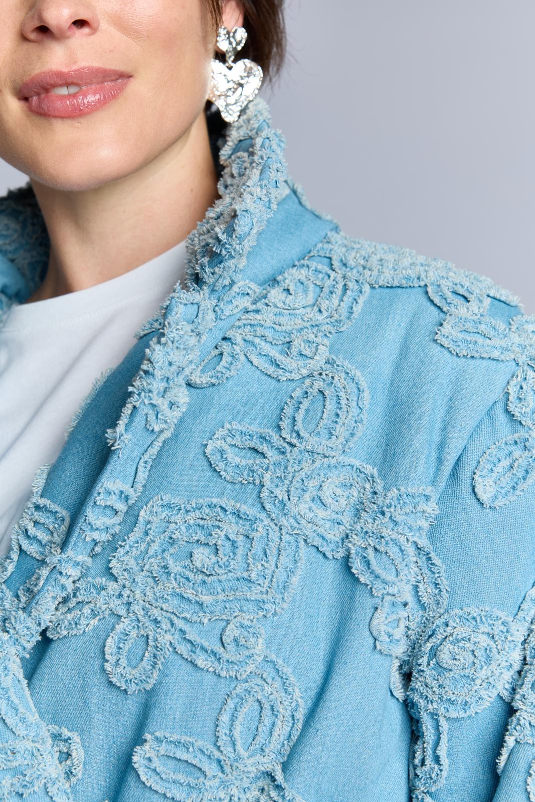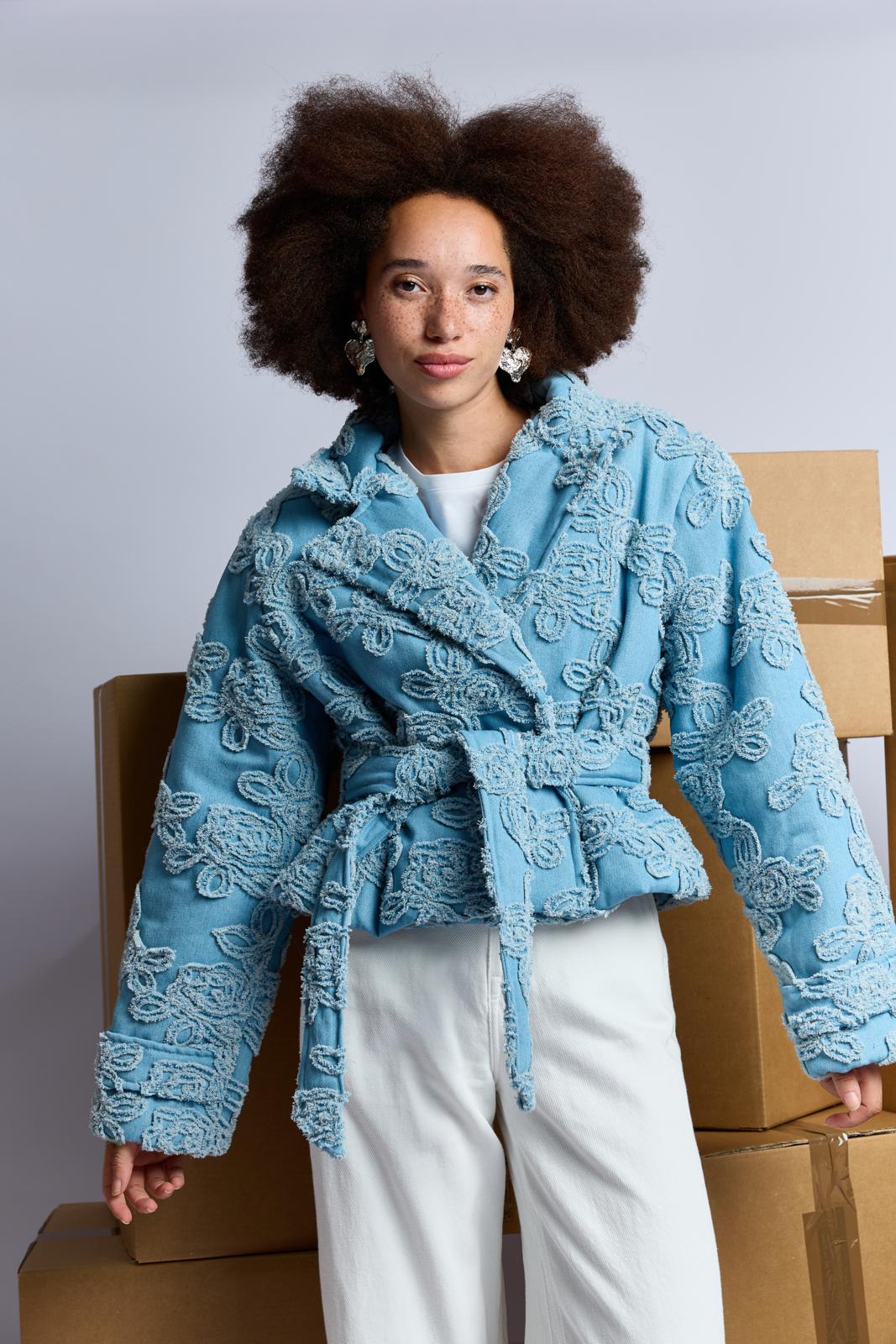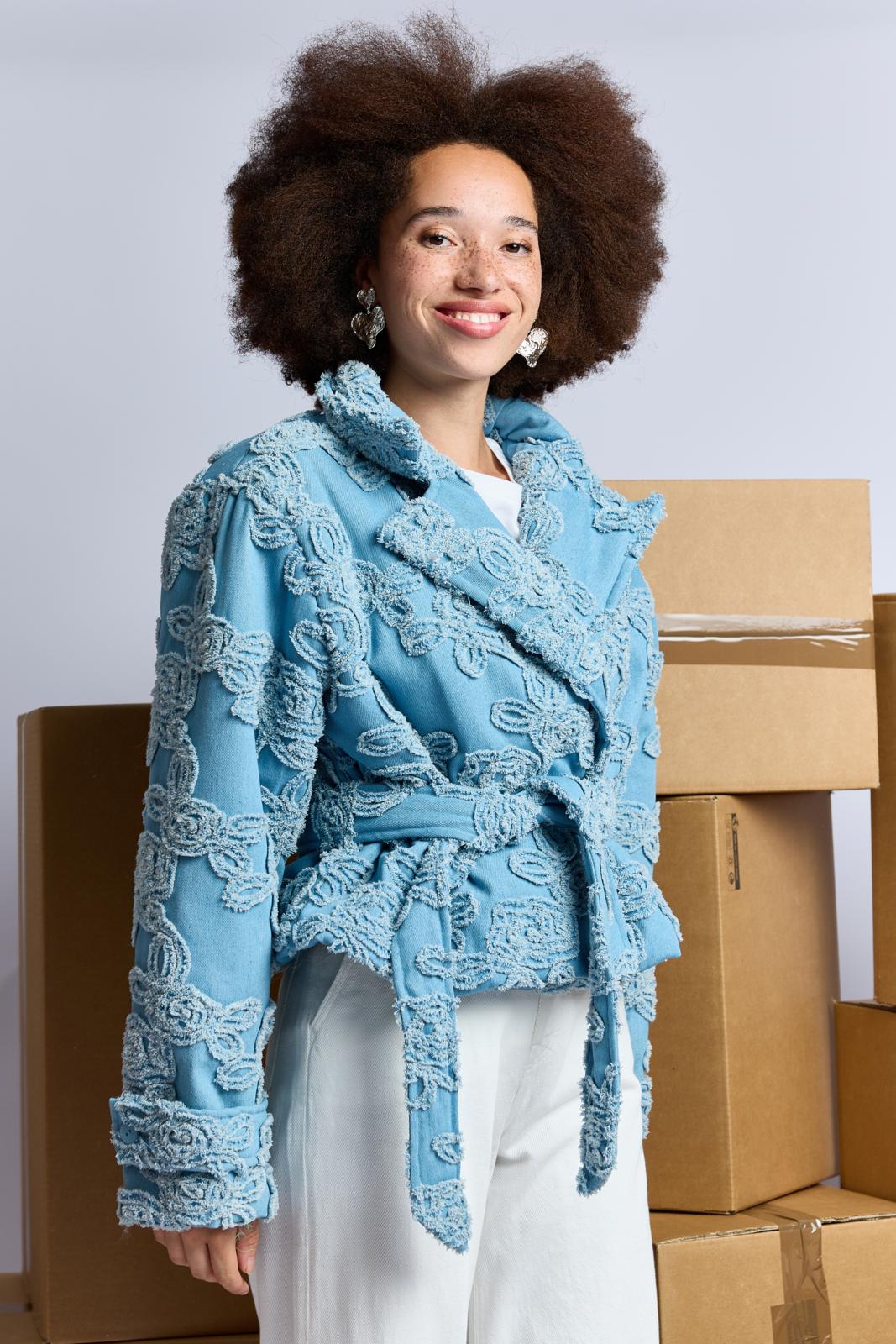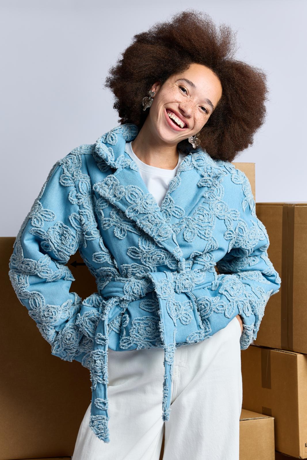 Een kort, stoer jasje dat sluit met twee knopen. Het is gemaakt van hippe geappliqueerde denim. Dit jasje is bovendien zelf gewatteerd. Hiervoor gebruik je fiberfill tussen de stoflagen. Je kunt ook kiezen voor een kant-en-klaar gewatteerde stof.