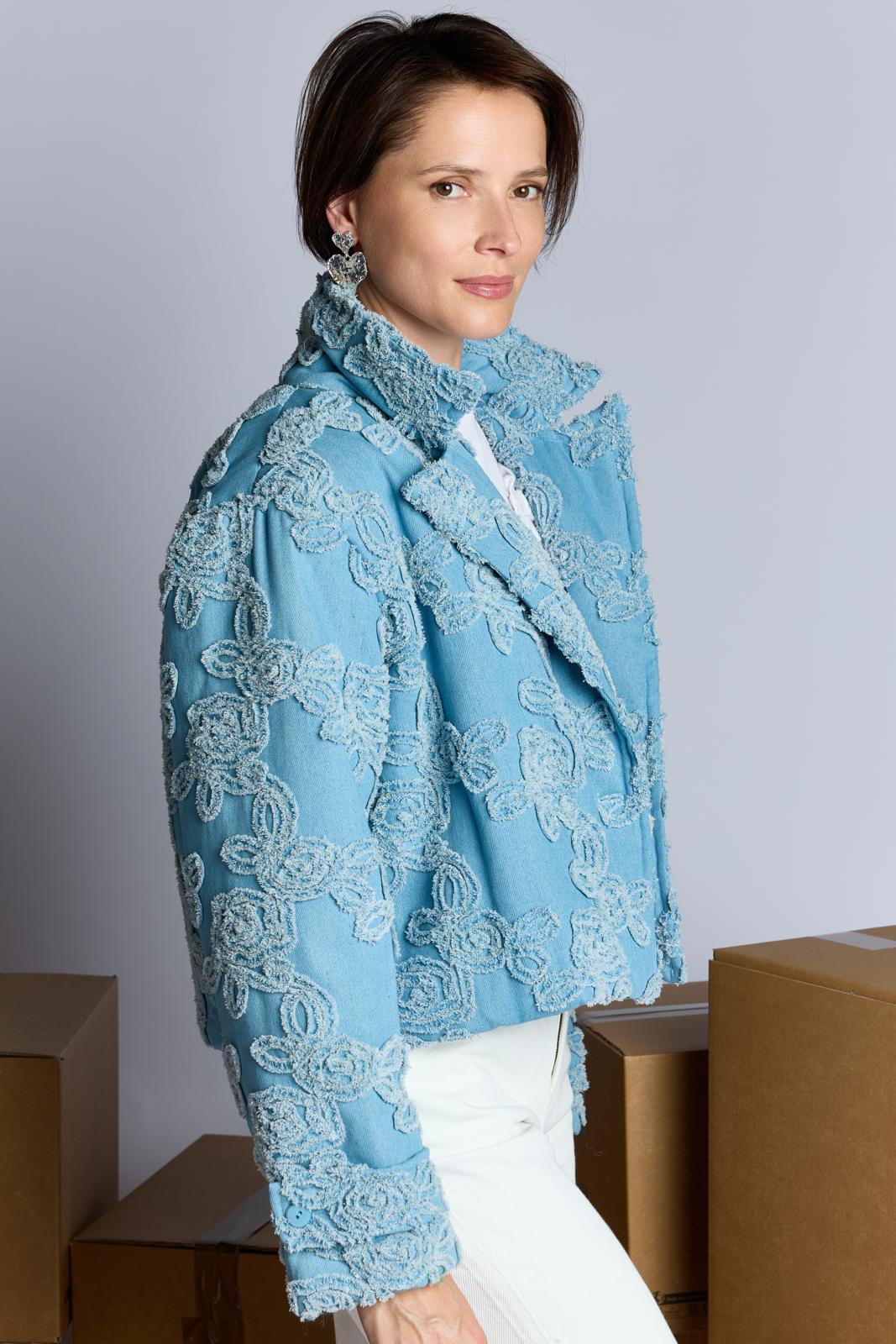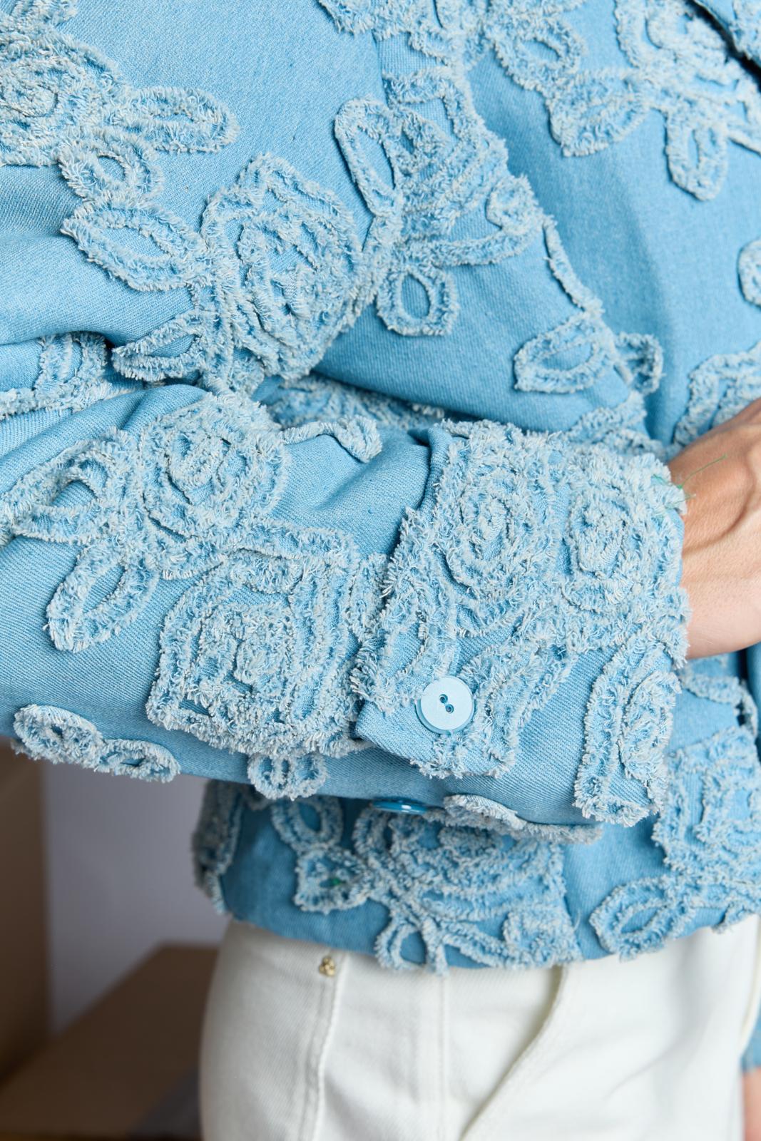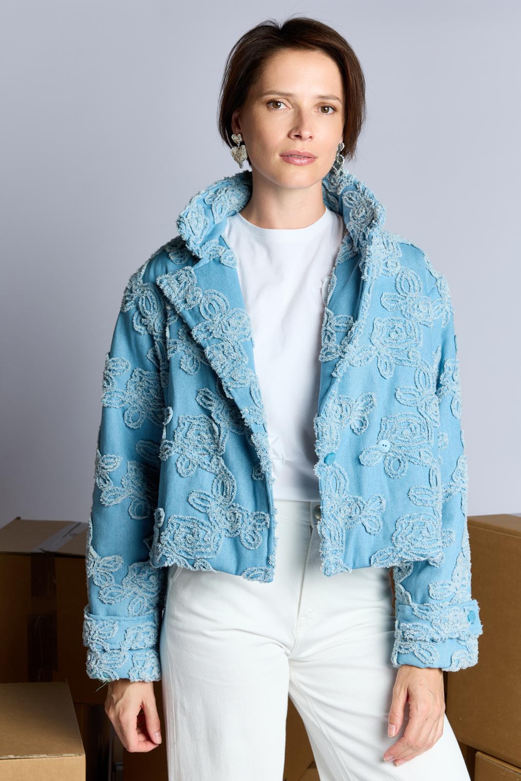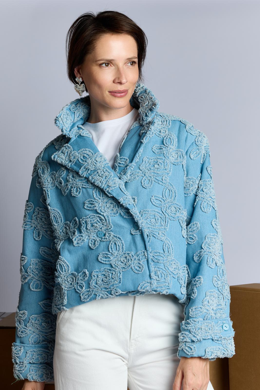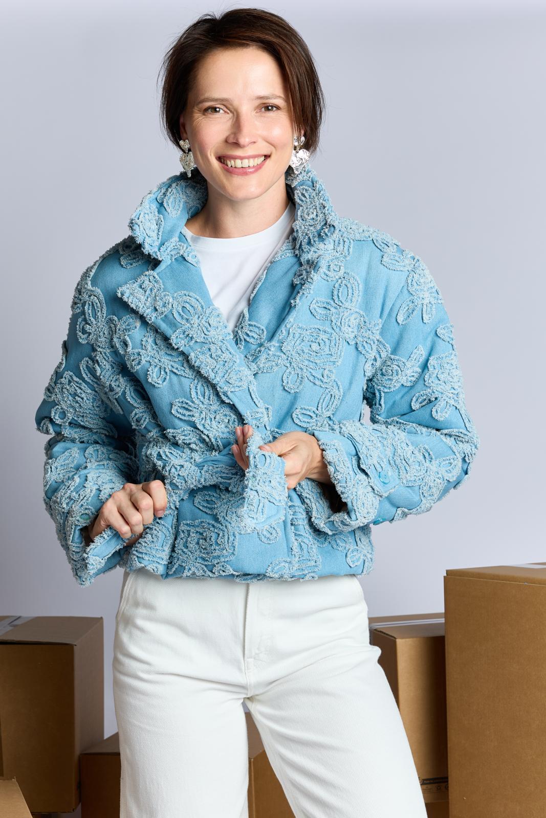 Een kort, stoer jasje dat sluit met twee knopen. Het is gemaakt van hippe geappliqueerde denim. Dit jasje is bovendien zelf gewatteerd. Hiervoor gebruik je fiberfill tussen de stoflagen. Je kunt ook kiezen voor een kant-en-klaar gewatteerde stof.
