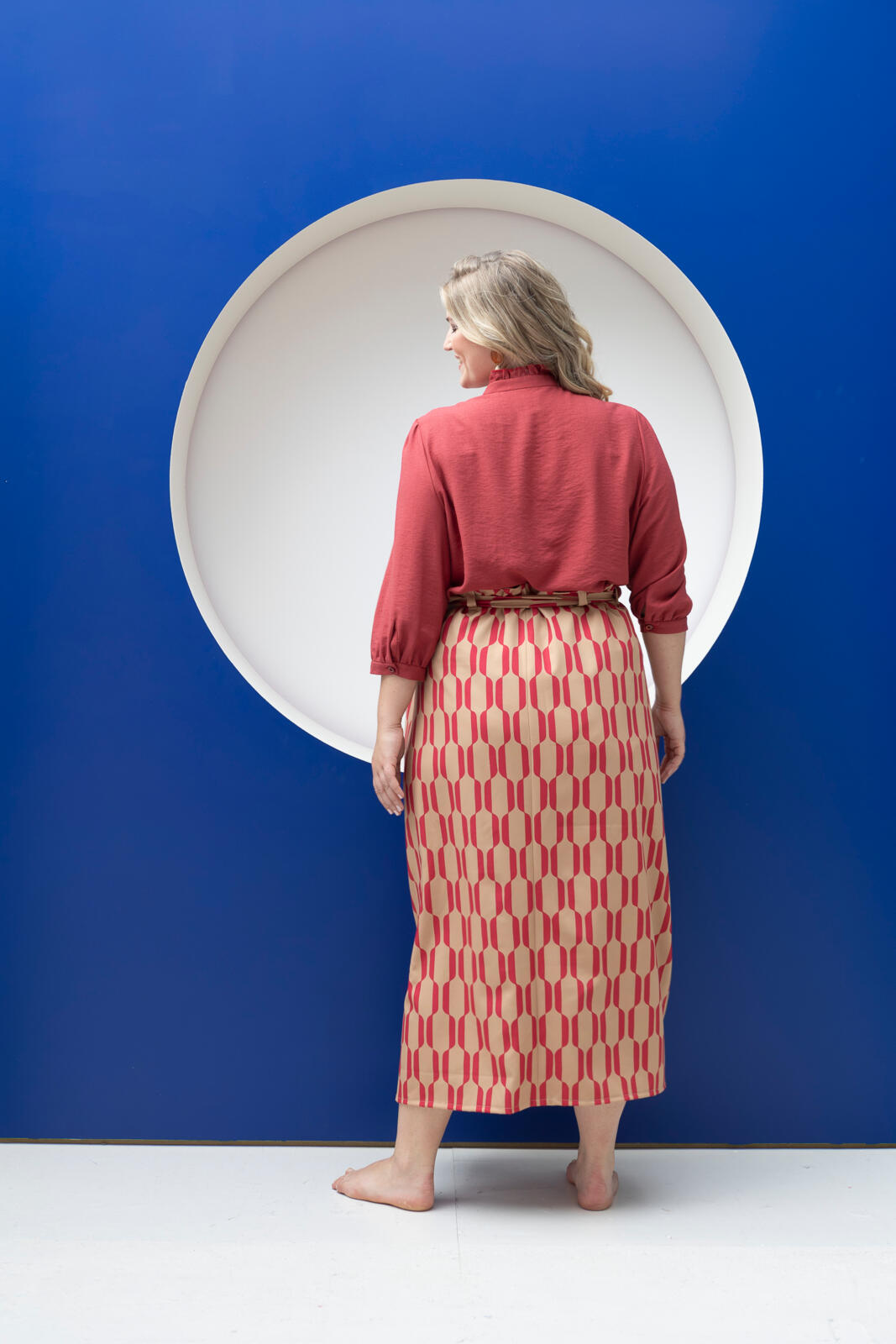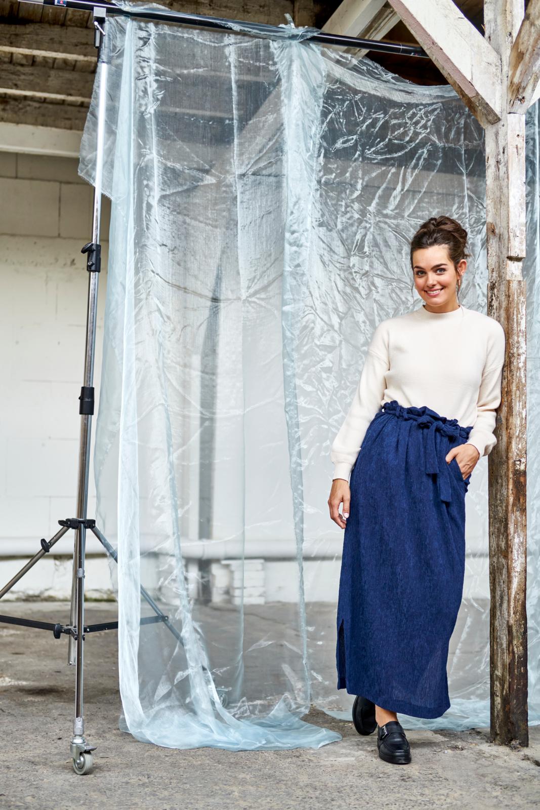 Deze rok is snel elkaar gezet dankzij het paperbag-effect: de wijde rechte bovenkant snoer je aan tot de goede wijdte met de ceintuur.