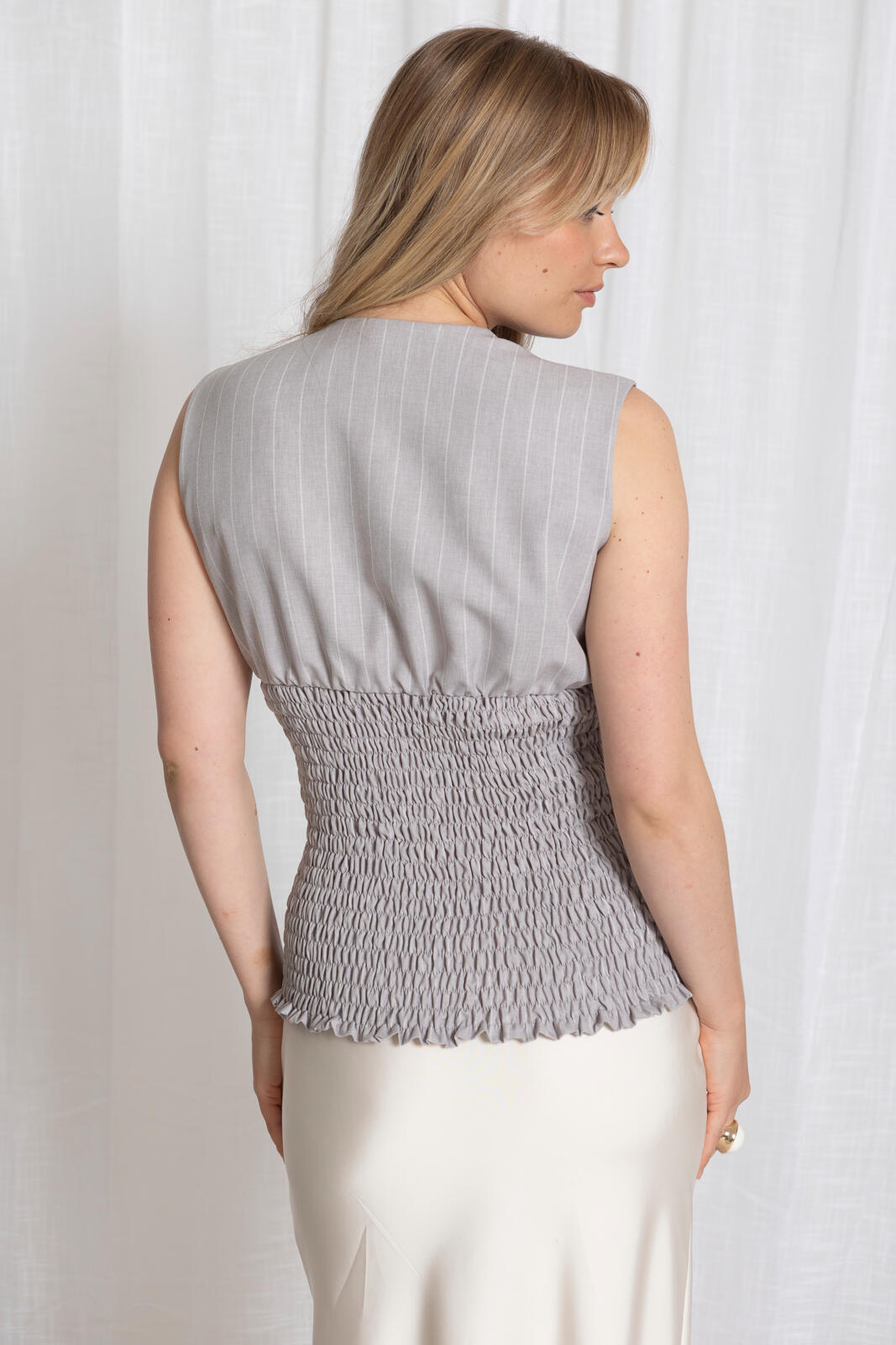 Smokken is weer hot. Dus leef je uit met deze top waarvan het taillestuk gemaakt is met deze nostalgische (naaimachine)techniek.