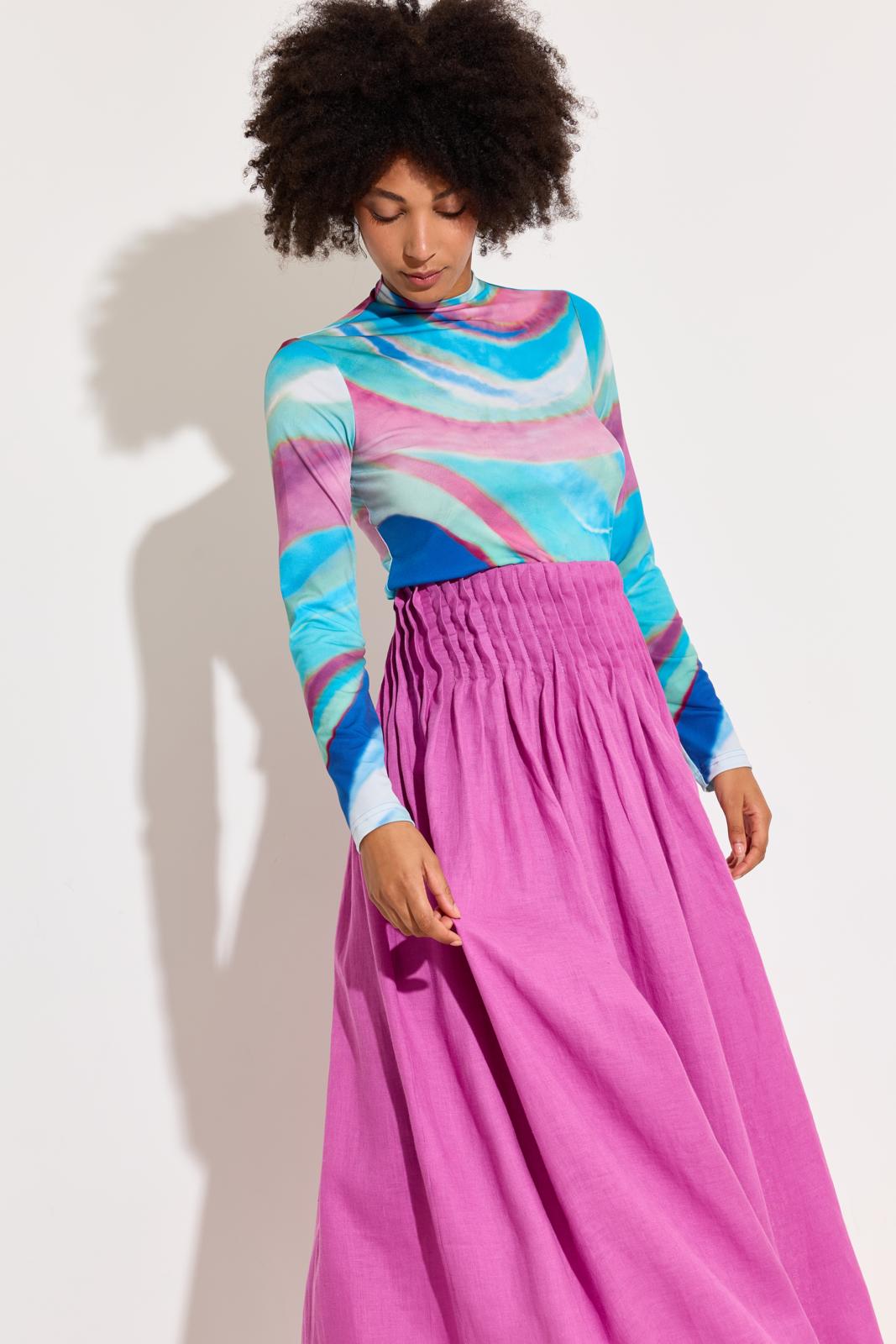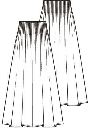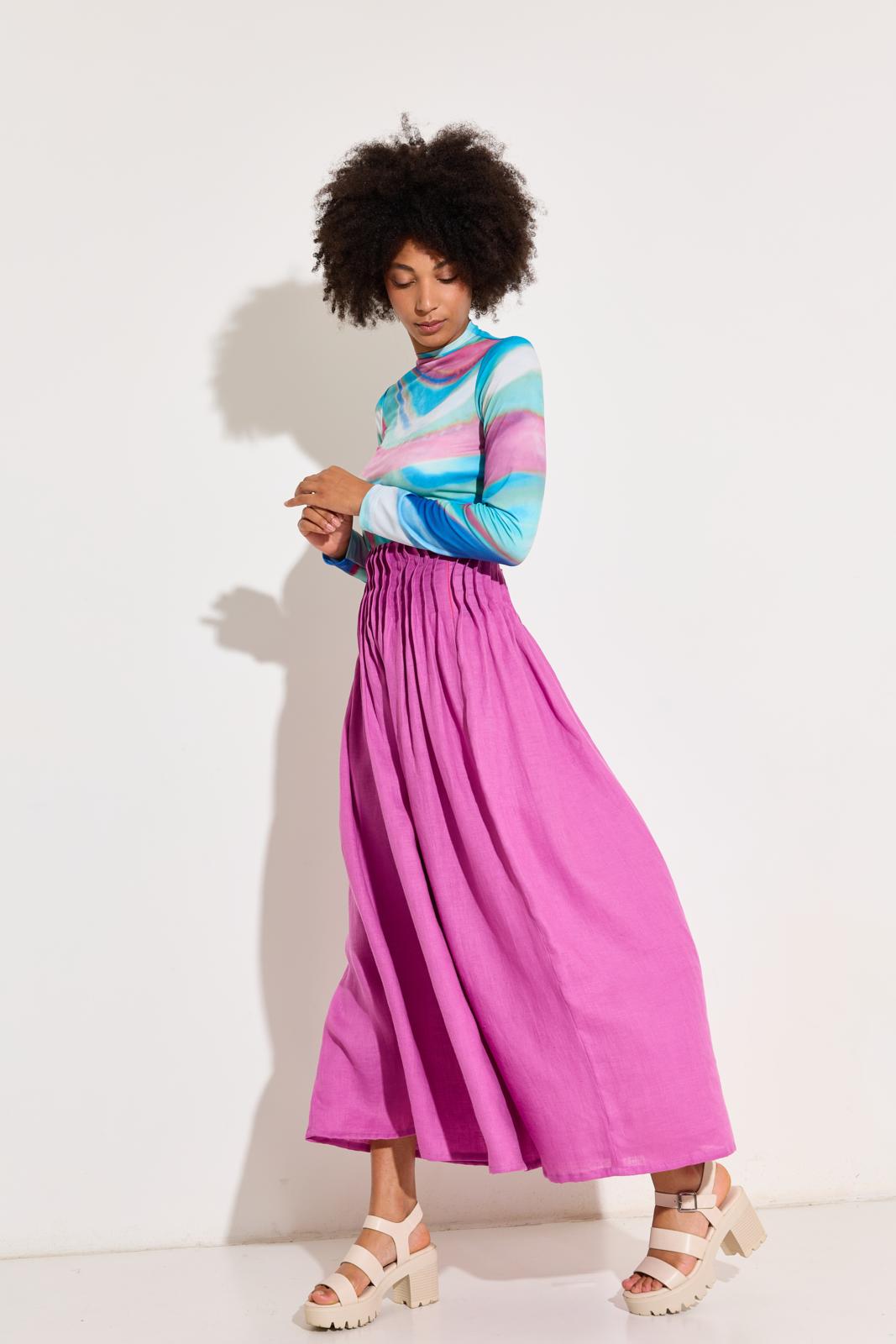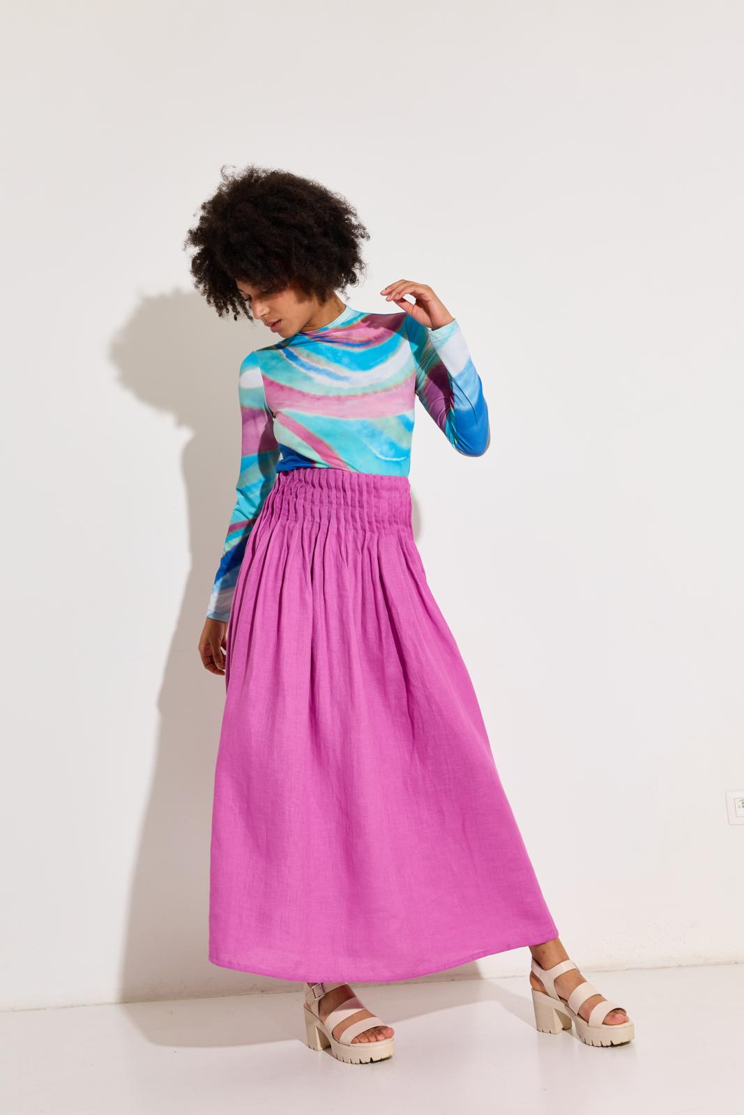 De rok is van zuiver linnen en heeft rondom de taille platte plooitjes. De bovenrand is afgewerkt met een beleg en er zit een rits in de zijnaad. Door de vele plooitjes vraagt deze rok om een soepele, niet te dikke stof.