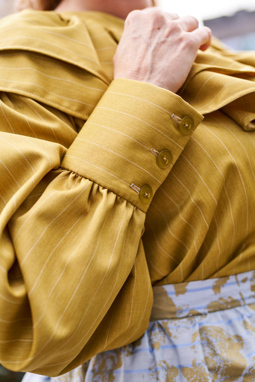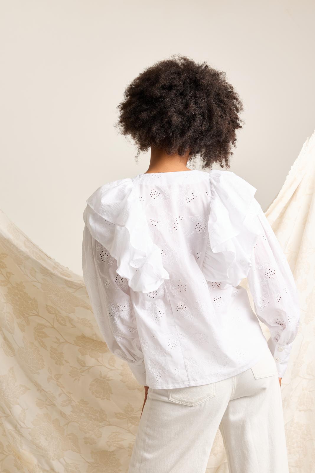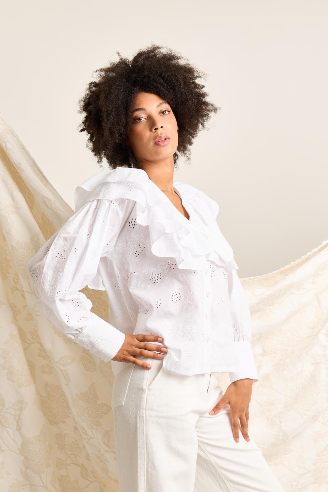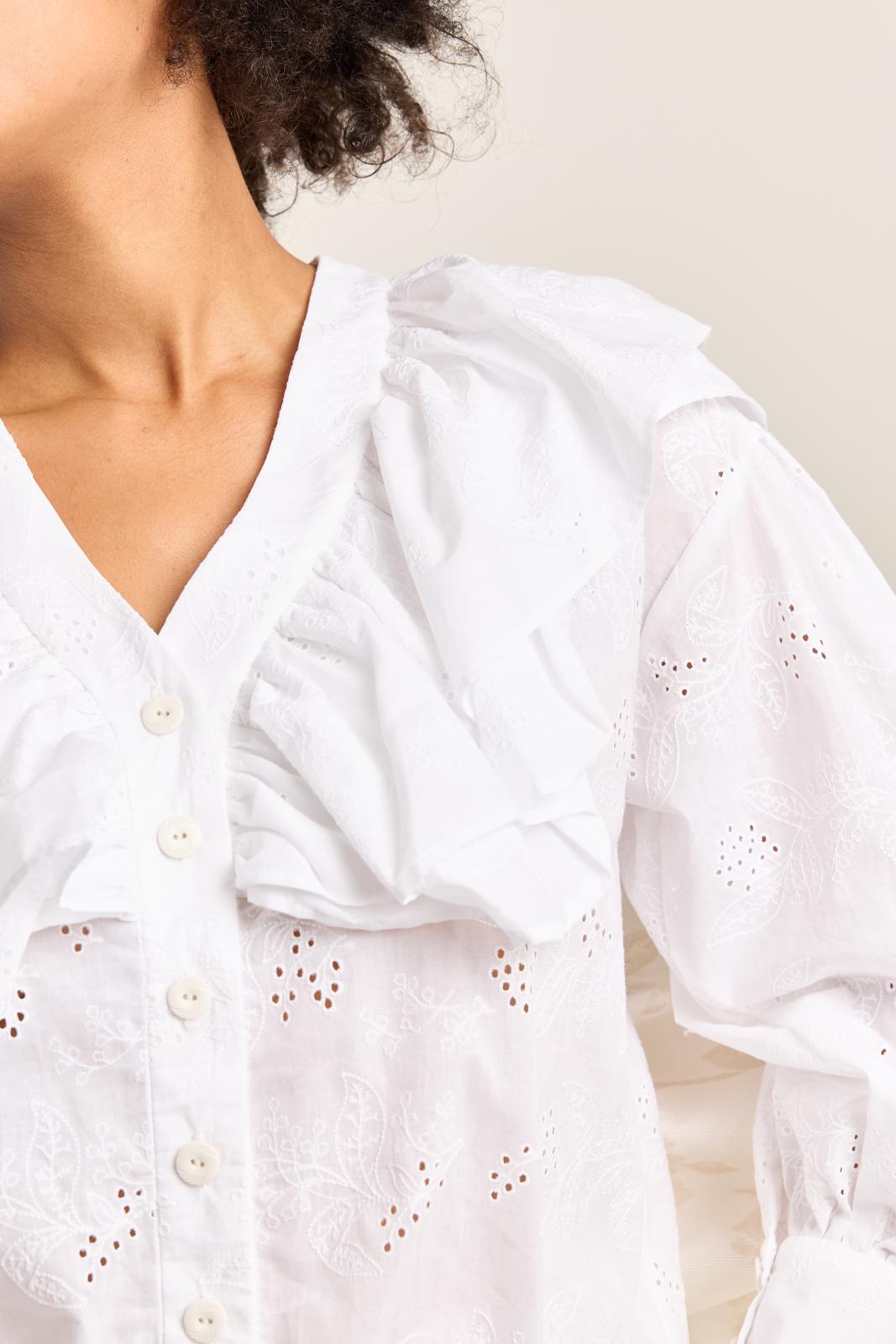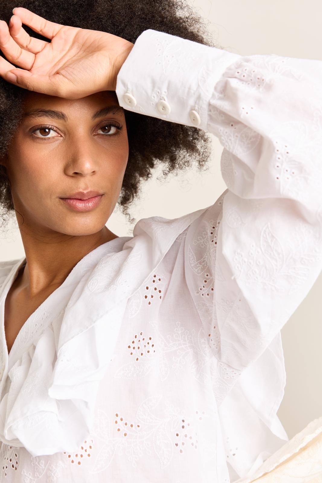 Ga all the way romantisch met ruches, plooi- en rimpeldetails in je outfit. Deze blouse met een dubbele ruche als kraag is daar perfect voor! De dubbele ruche loopt naar achter door en wordt tussen de deelnaden gestikt. De lange manchetten sluiten met drie knoopjes.