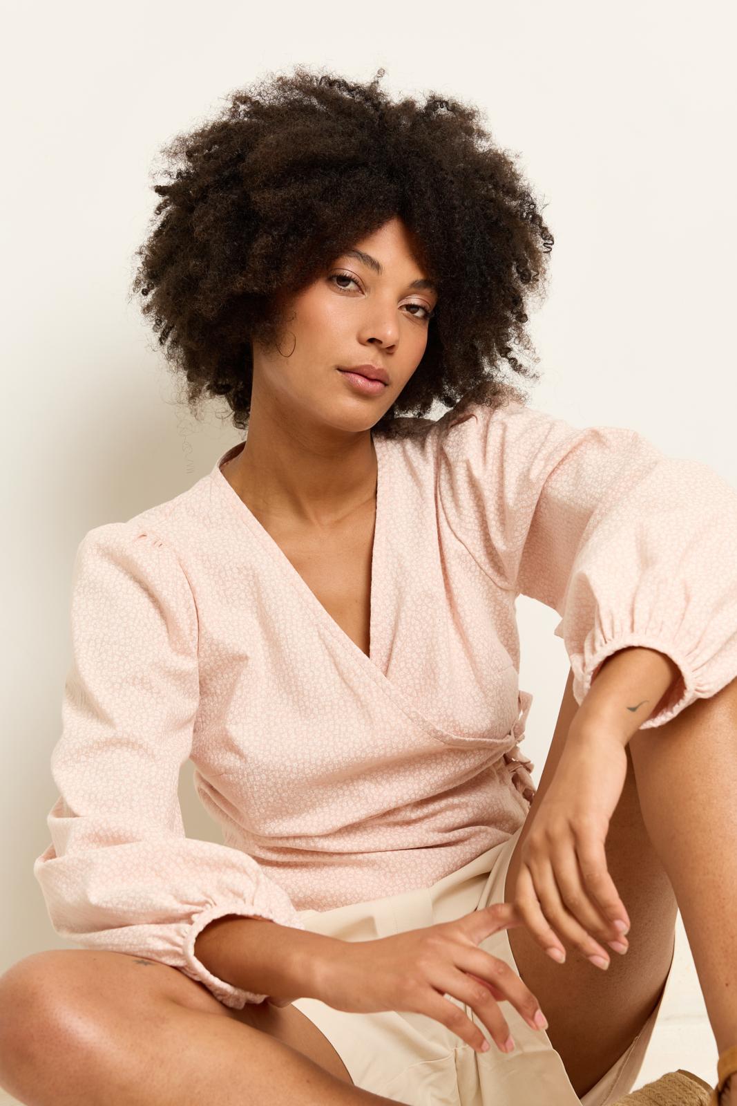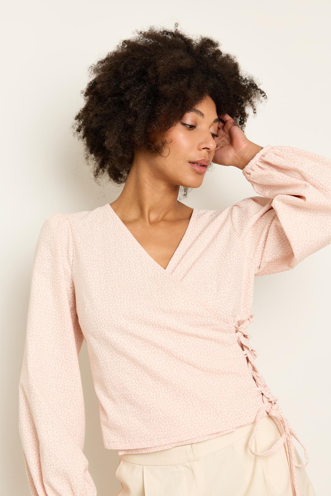 Deze top met ruime poffende mouwen heeft een overslageffect met lintsluiting. Het pastelroze en de florale microprint zorgen voor een extra romantische stijl.