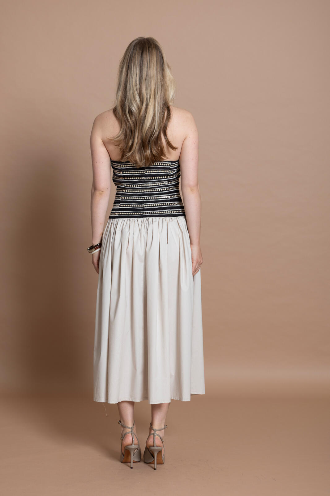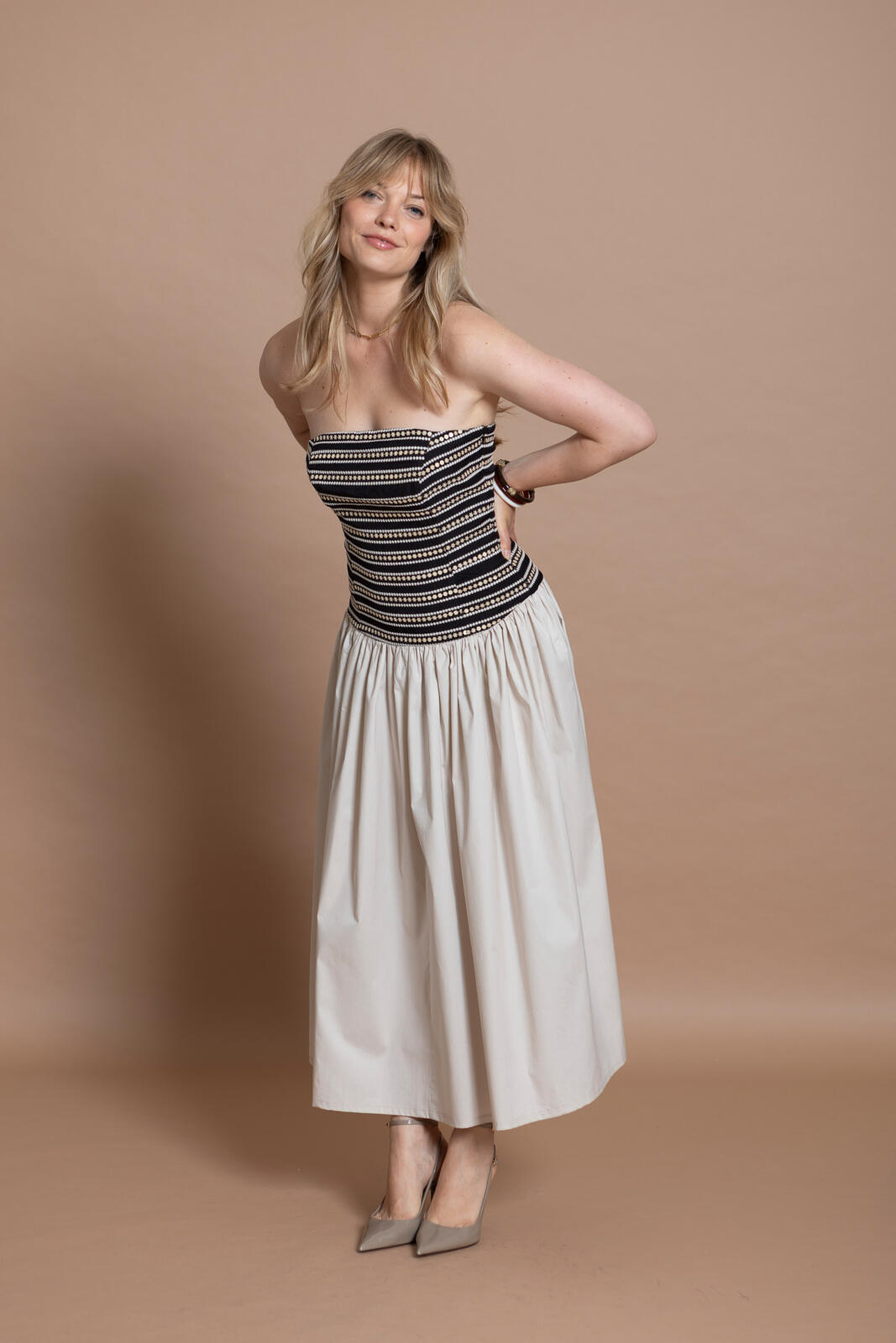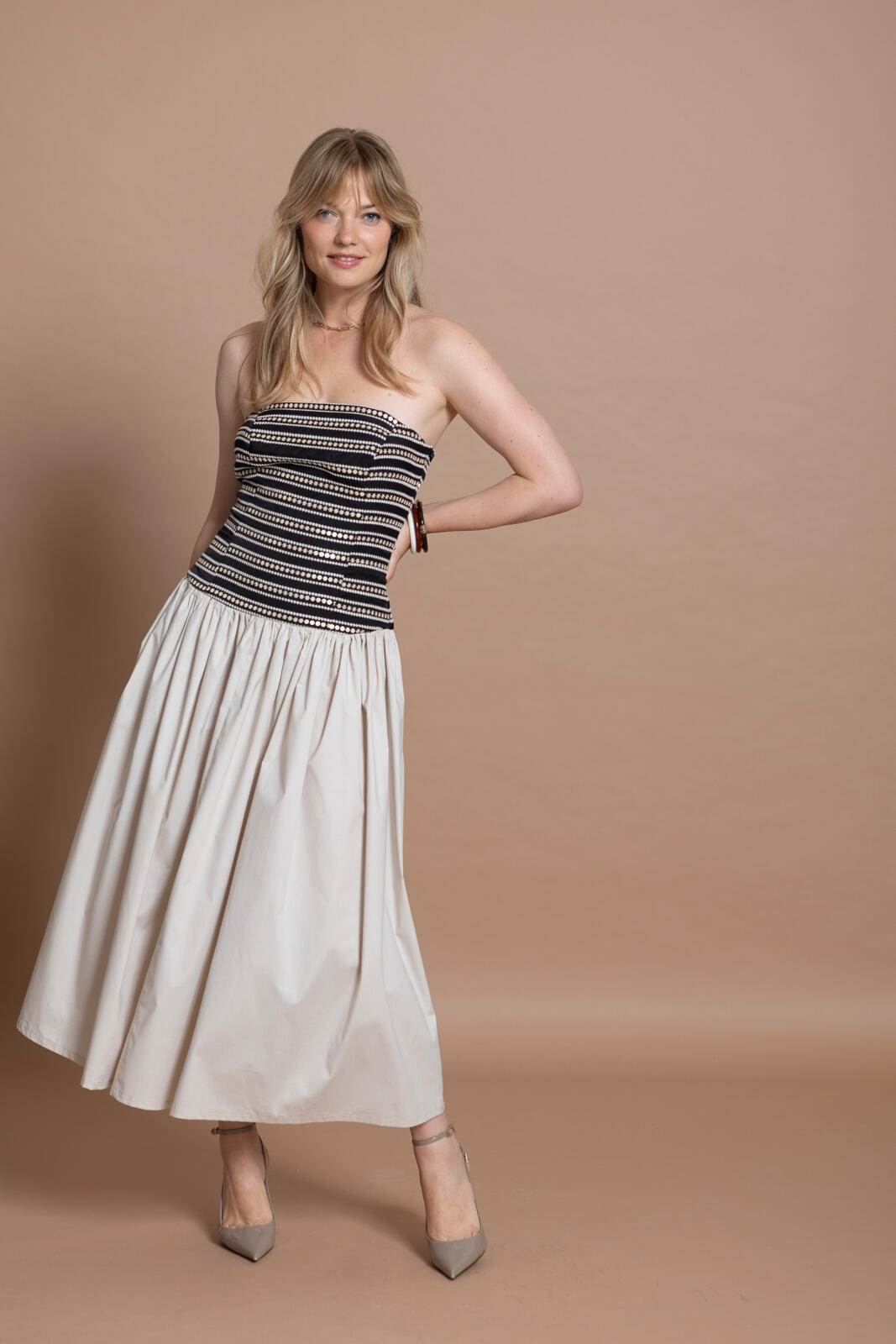 Zo’n elegante strapless jurk oogt zowel nonchalant als gekleed. Het lijfje is van geborduurde paillettenstof, de rok van uni katoen. Dat staat goed met hakken maar ook met een kort jack en sneakers.