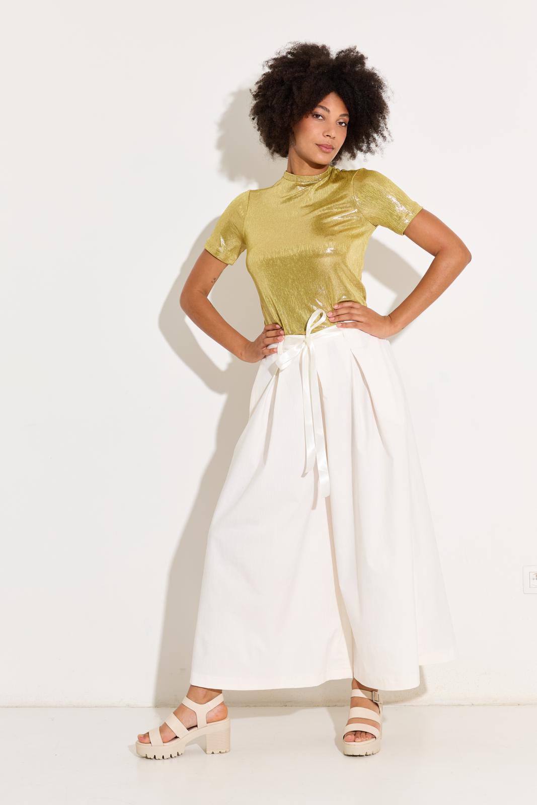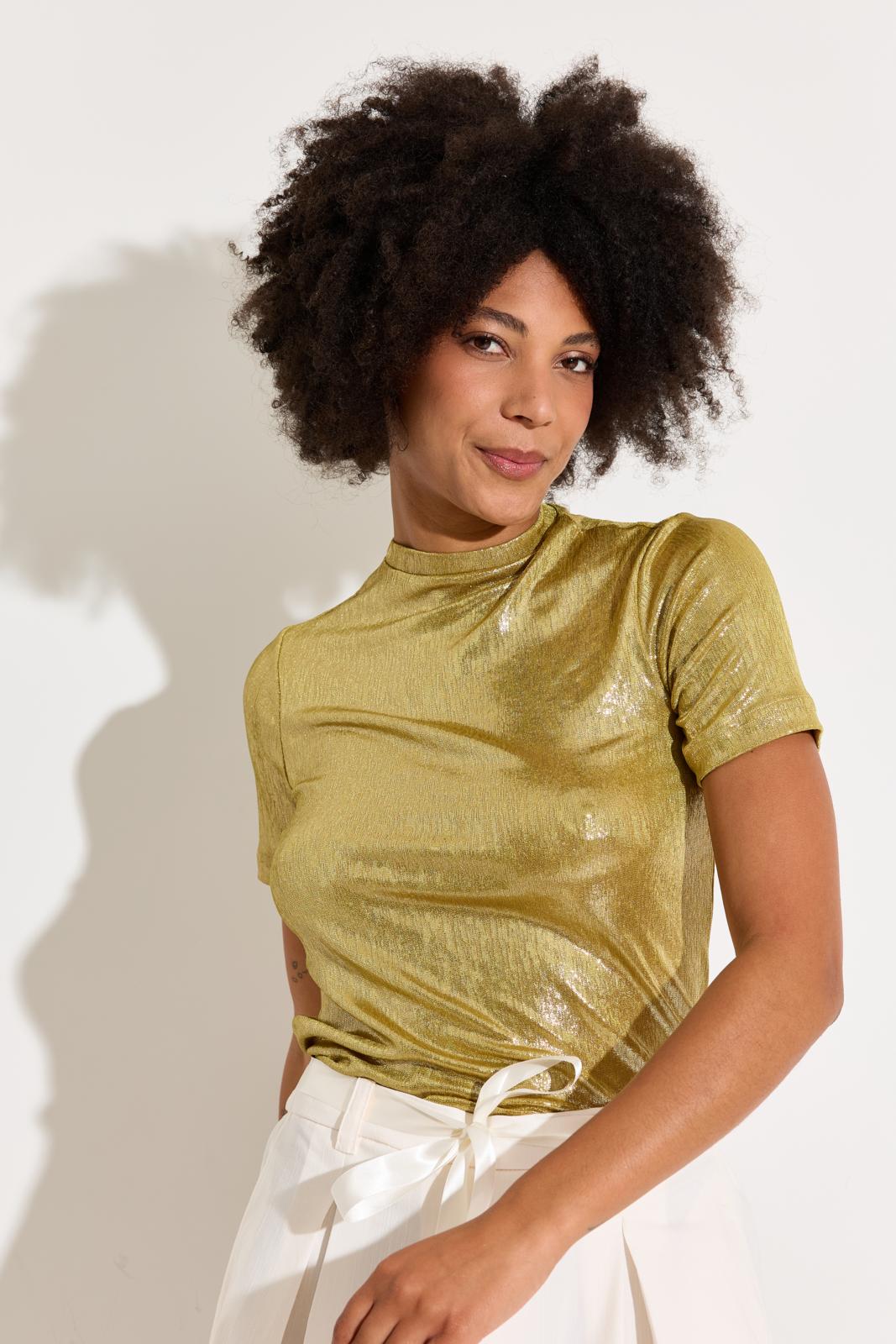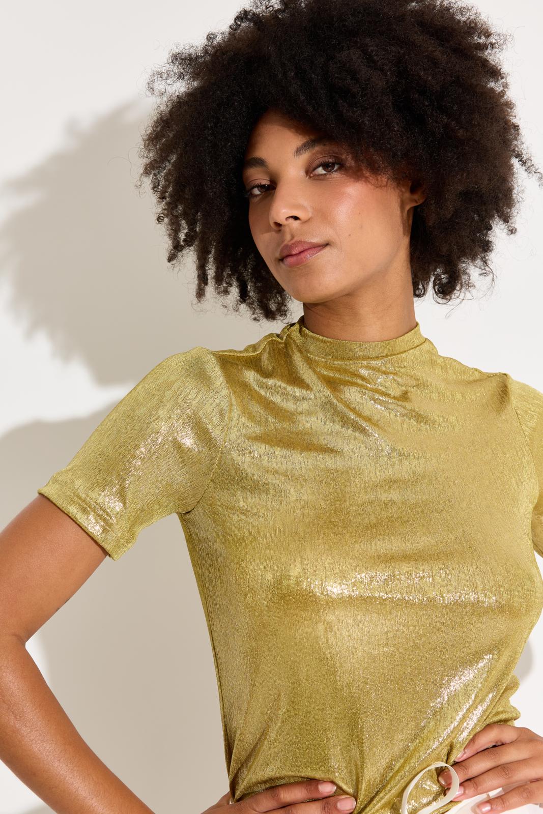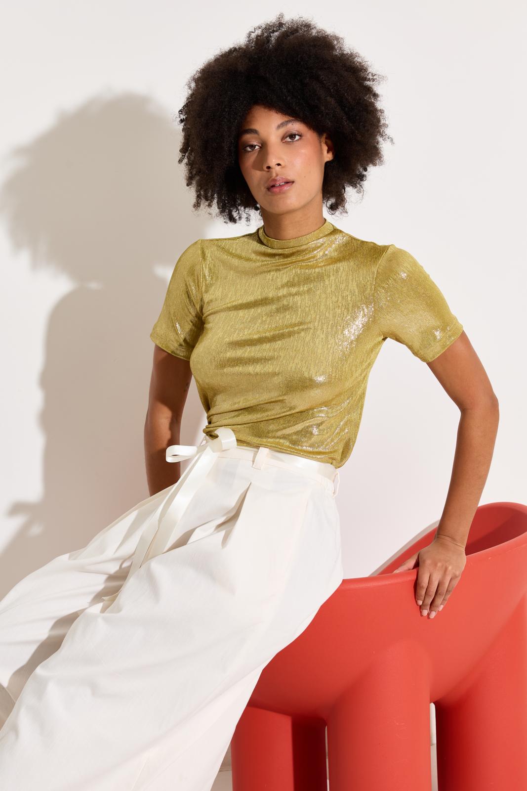 Gouden greep: dit eenvoudige basic T-shirt verander je net zo makkelijk in een party piece, bijvoorbeeld met goudglans tricot.