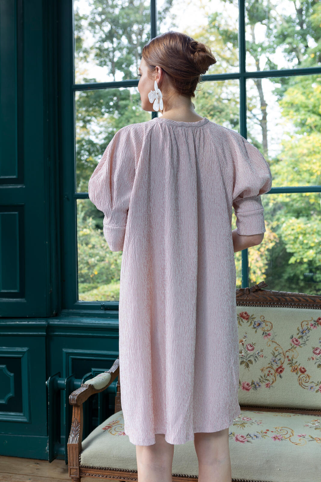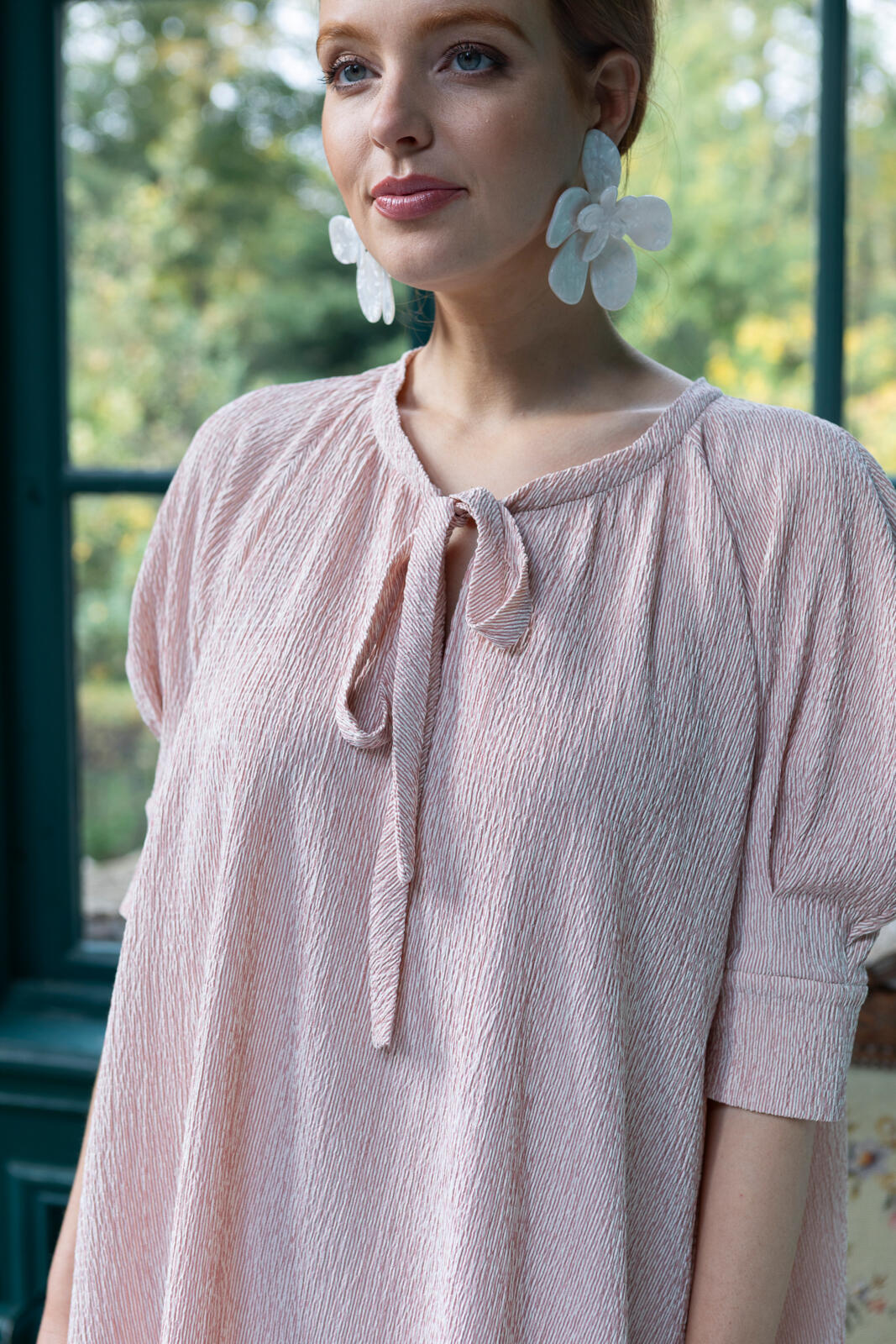 Deze superfijne jurk heeft pofmouwen die extra volume krijgen door de stolpplooien onderin. Door de stofkeuze varieert de stijl: de geborduurde chambray geeft een meer casual look, terwijl de roze versie een gekledere uitstraling heeft. Wil je hem liever wat langer? Vergeet niet om wat extra stof te kopen!