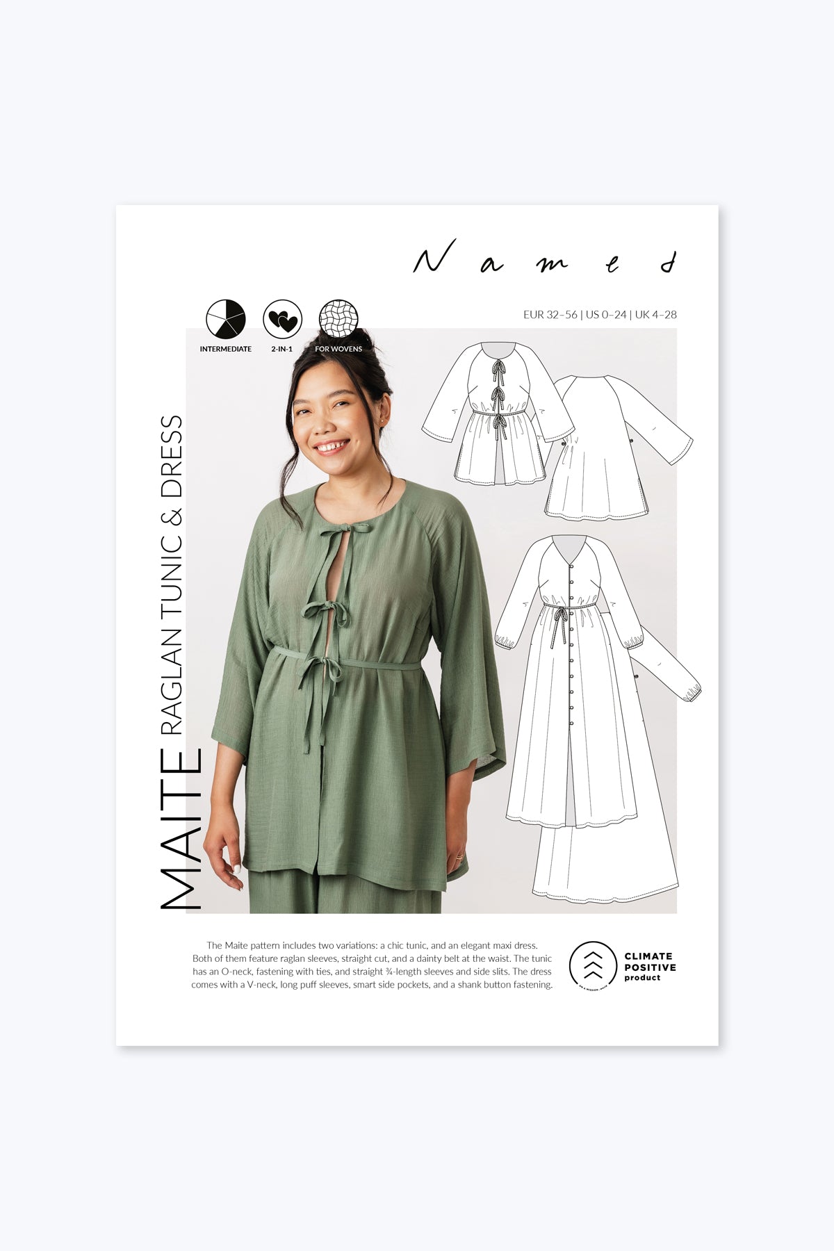 Het Maite naaipatroon biedt twee verfijnde variaties: een chique tuniek en een elegante maxi-jurk. Beide modellen hebben raglanmouwen, een recht silhouet en een smalle ceintuur die de taille subtiel accentueert.