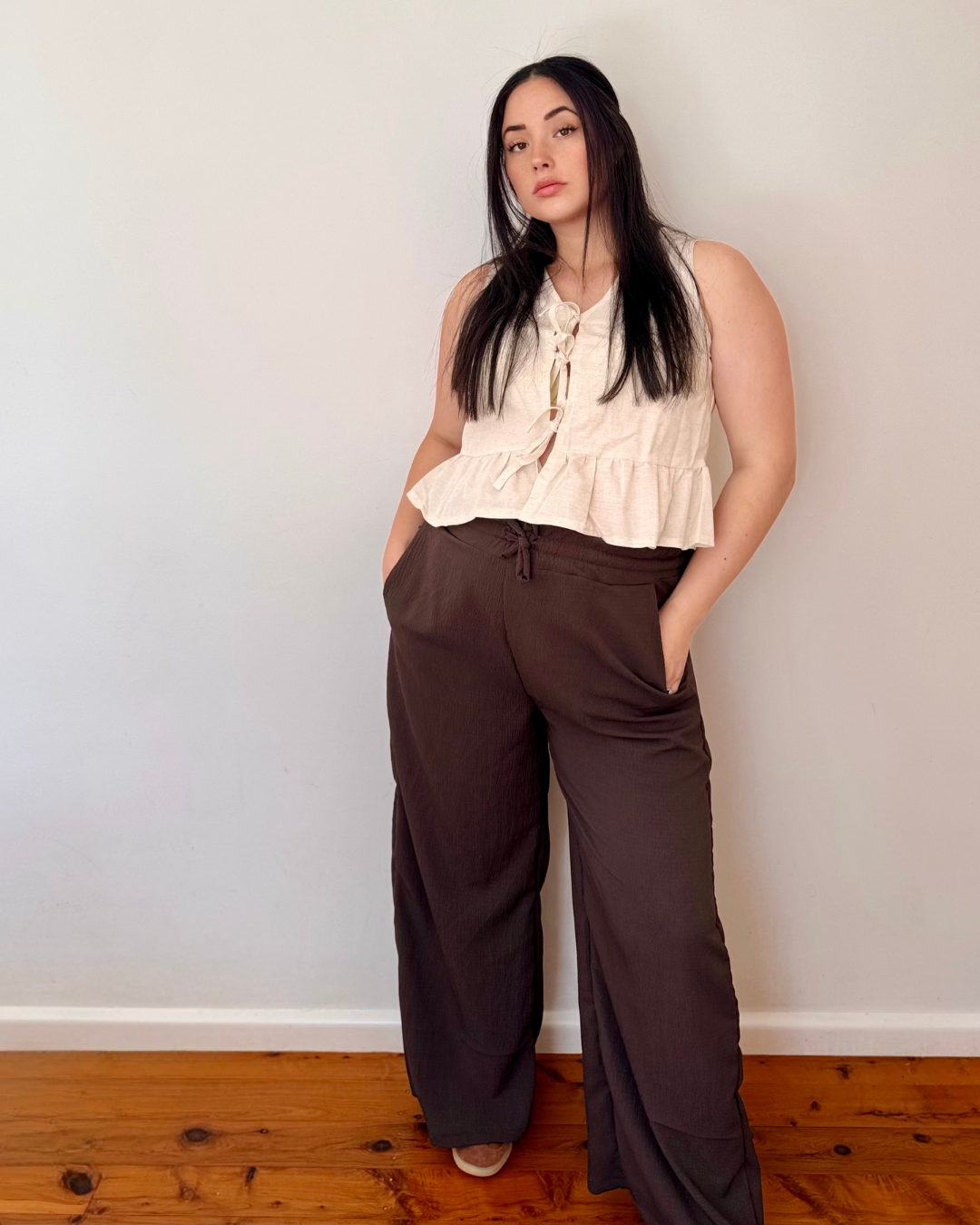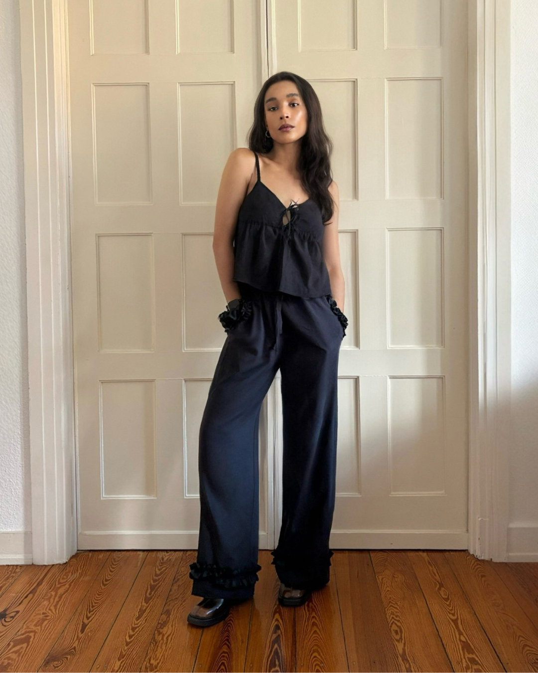 Tilly is een comfortabele broek met wijde pijpen en een elastische tailleband voor ontspannen momenten in het dagelijks leven. Afhankelijk van de stofkeuze kan hij worden gedragen als casual of zakelijke broek, pyjamabroek of luchtige culotte in de zomer. Tilly is geschikt voor zowel gebreide als geweven stoffen. Door de eenvoudige constructie is hij perfect voor gestreepte stoffen. Het patroon bevat een ontwerp voor een lange broek (model A), een korte broek (model B) en een 7/8-broek (model C). Een optioneel trekkoord in de tailleband zorgt voor een goede pasvorm en voegt een klein detail toe aan de totale look. Tilly heeft ook optionele zijzakken en een smalle tailleband (zie model B).