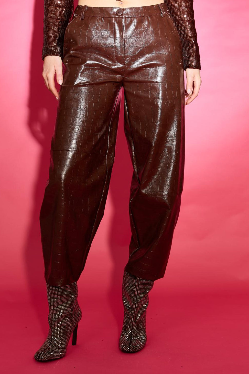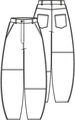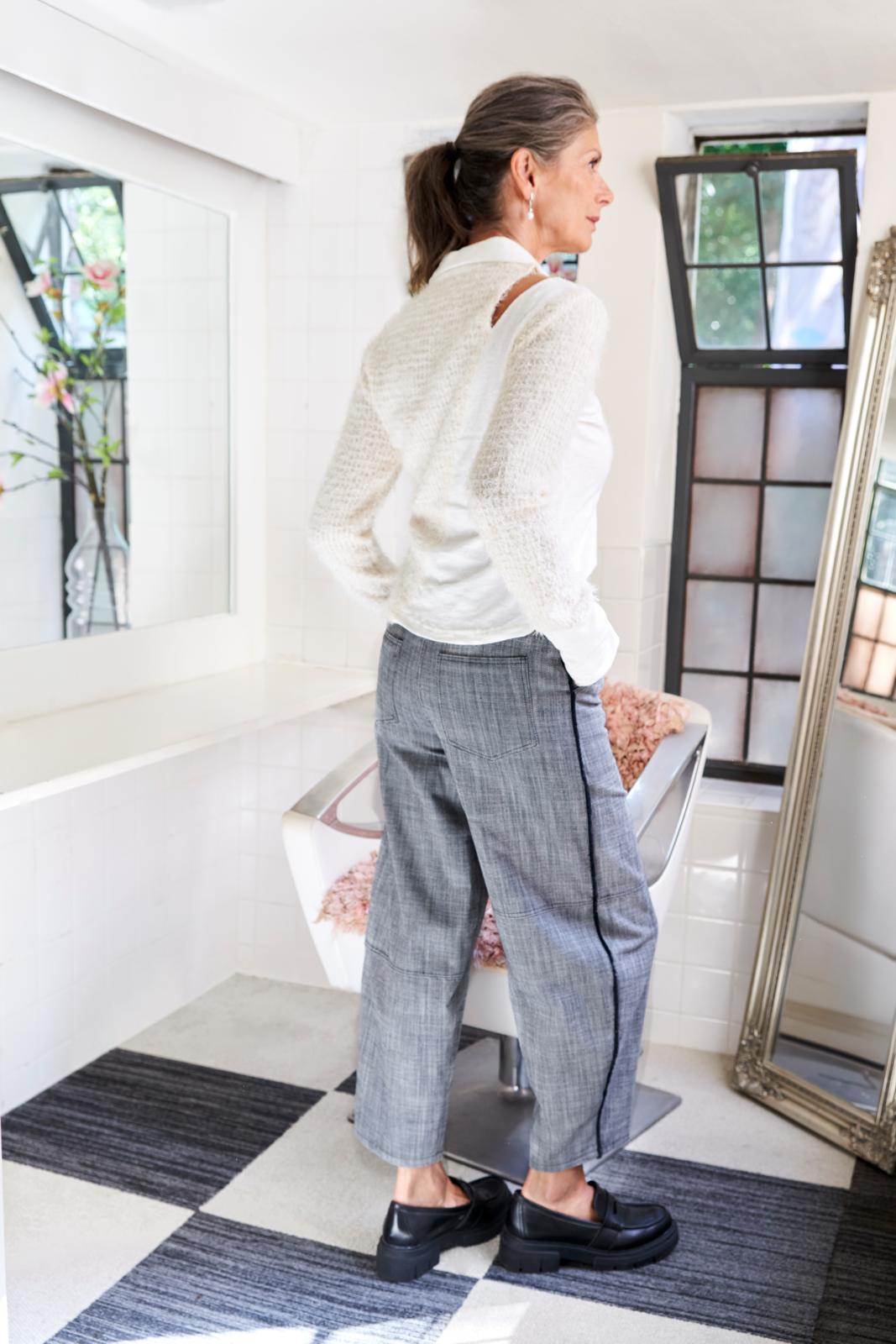 De barrel leg broek is hét nieuwe basismodel. Een stoere casual broek met ‘ronde pijpen’, achter een heuppas en opgestikte zakken. W.b. de donkerblauwe broek met sierrandje op de zijnaad; hier is de zelfkant van de stof – met rafeltjes – voor gebruikt.