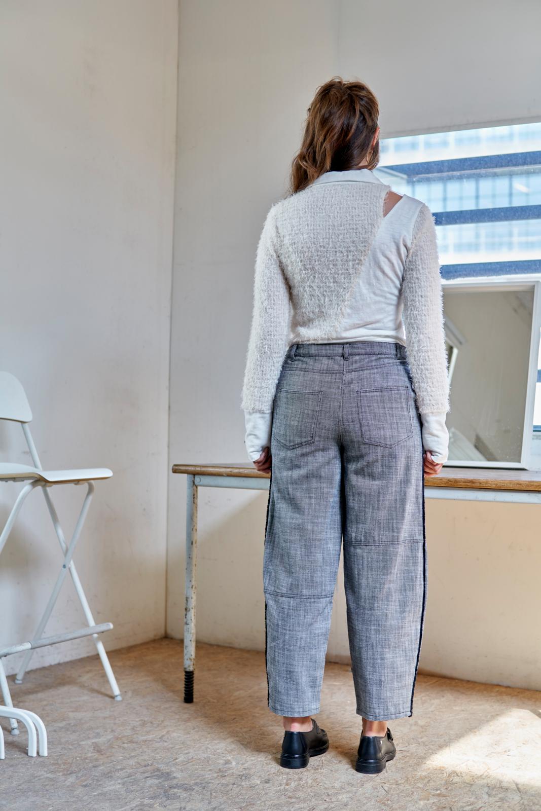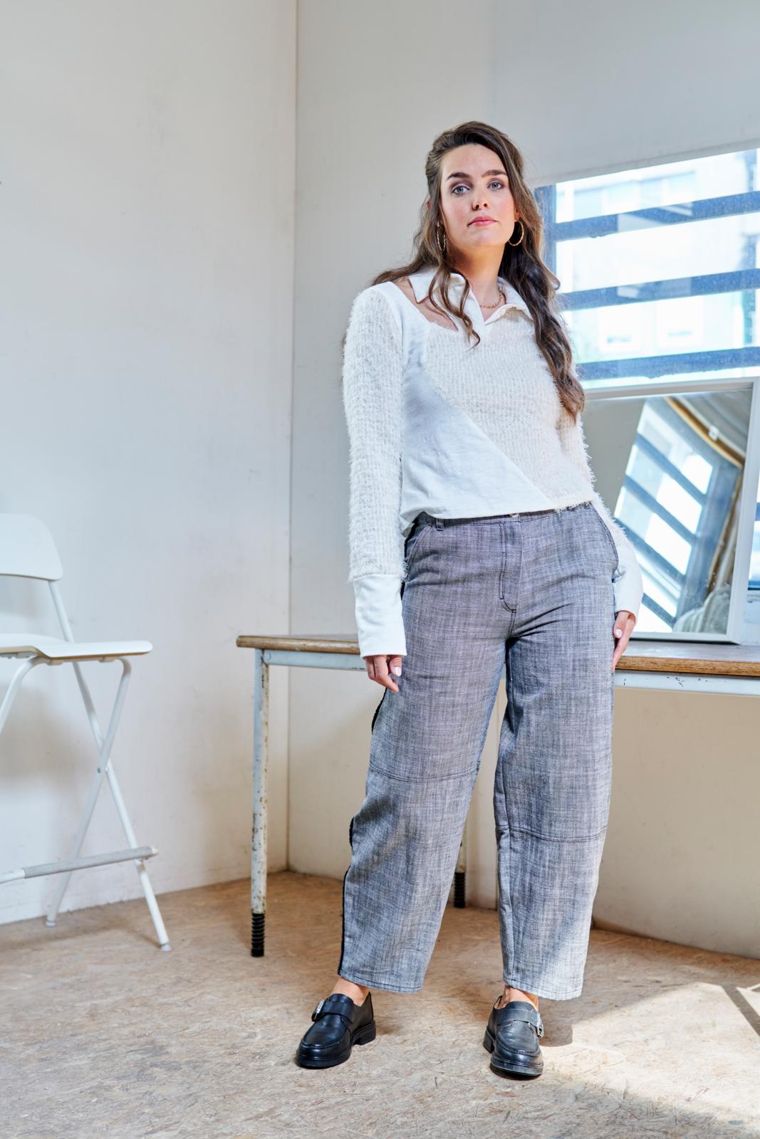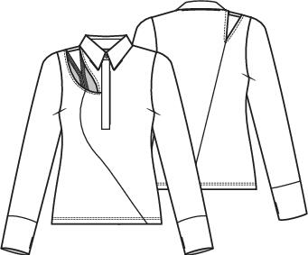 Een spannende polotrui met uitsparing. De kraag en manchetten (mét duimgaten) zijn van tricot, de rest van gebreide stof. Alles van één stof kan ook prima.