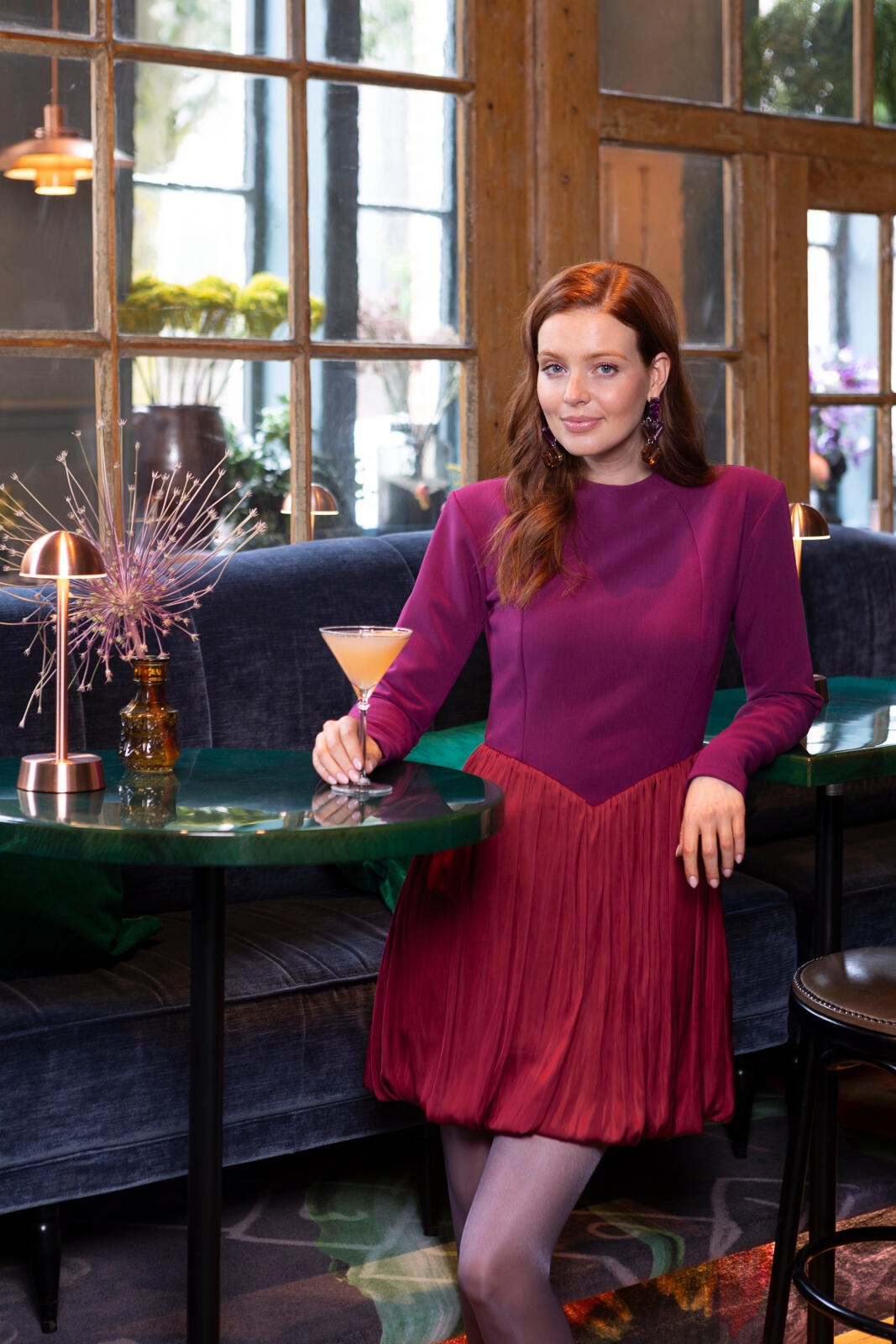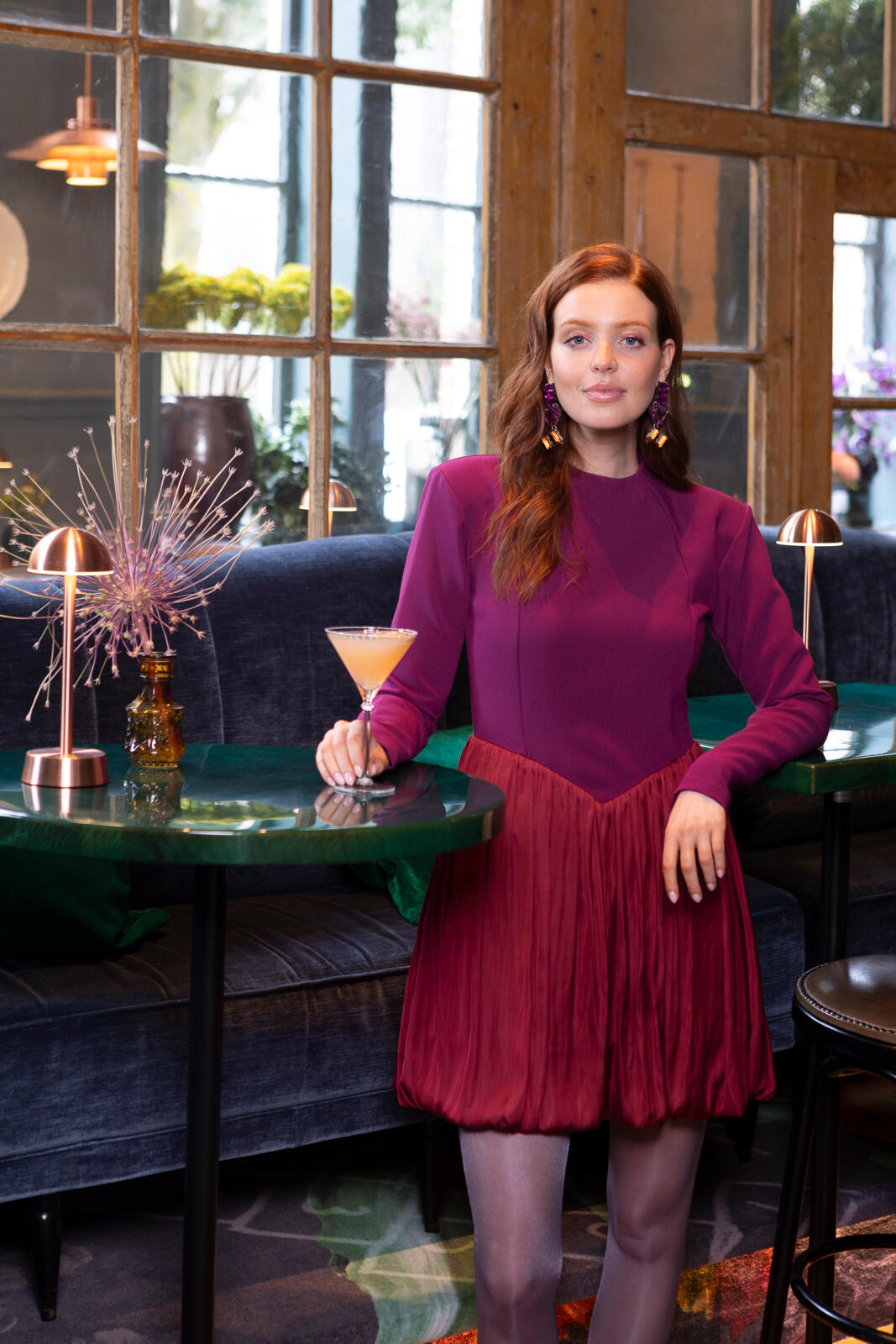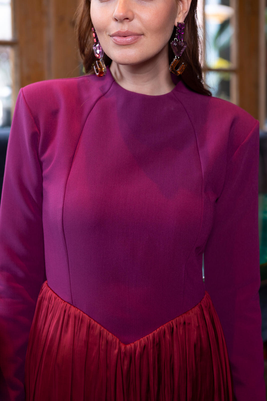 De ton sur ton-combinatie van stoffen (tinten uit één kleur­familie) geeft deze jurk extra cachet. Het model van stretchstof en kreuksatijn heeft dichte mouwen en achter een blinde rits.