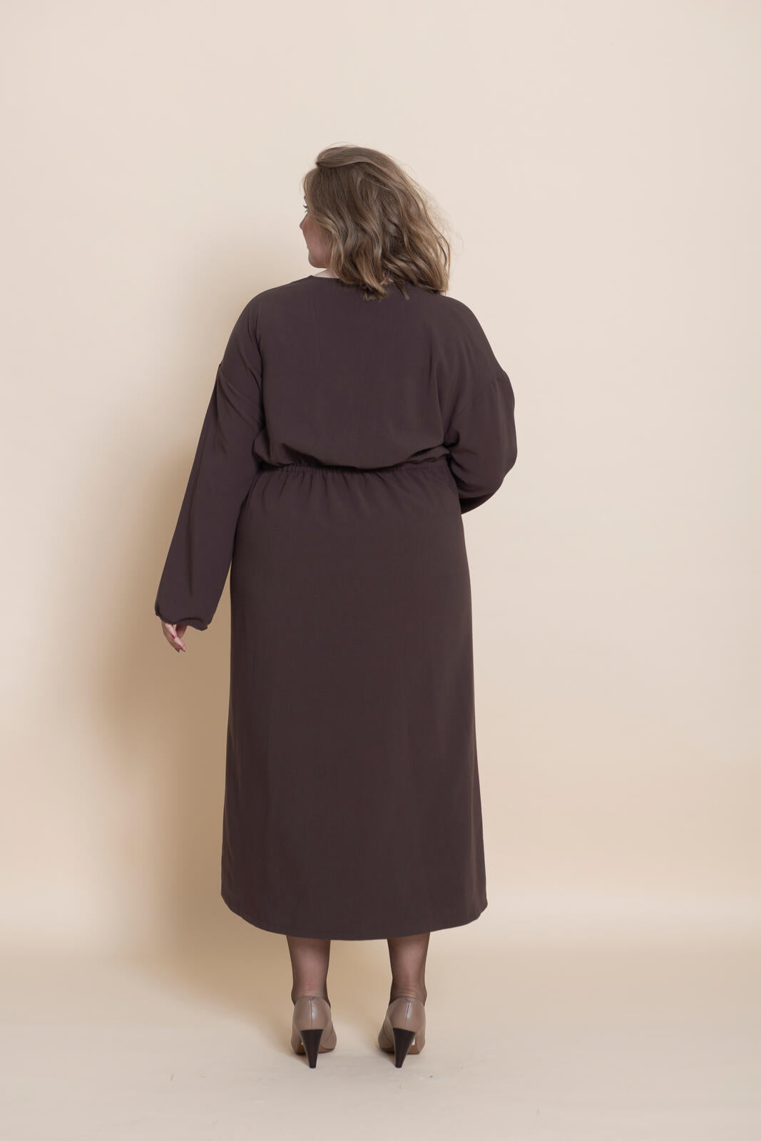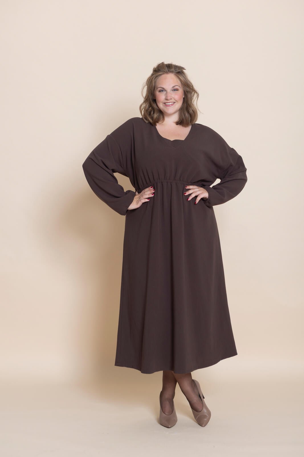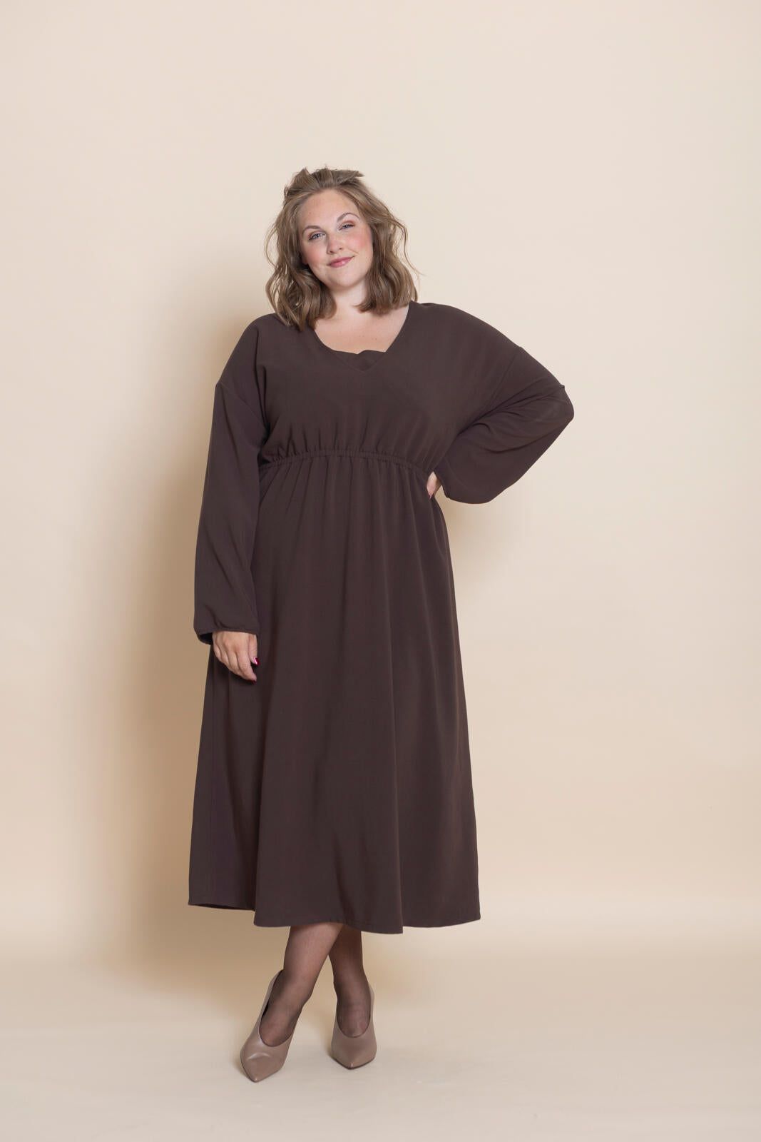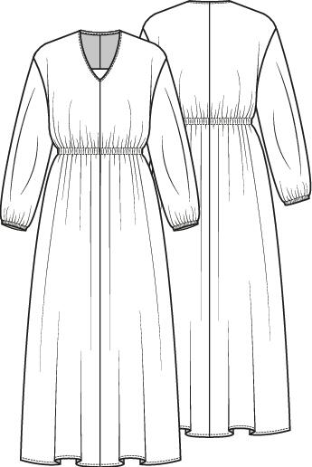 Dit is nu eens een typisch geval van ‘weinig moeite, veel effect’. Een makkelijk-maken-model met een sluik, oversized silhouet. In de taille en onder in de mouwen is elastiek gezet. Kies eventueel een mooie printstof voor dit patroon. Want deze jurk heeft geen deelnaden of details waardoor elk dessin goed uitkomt.