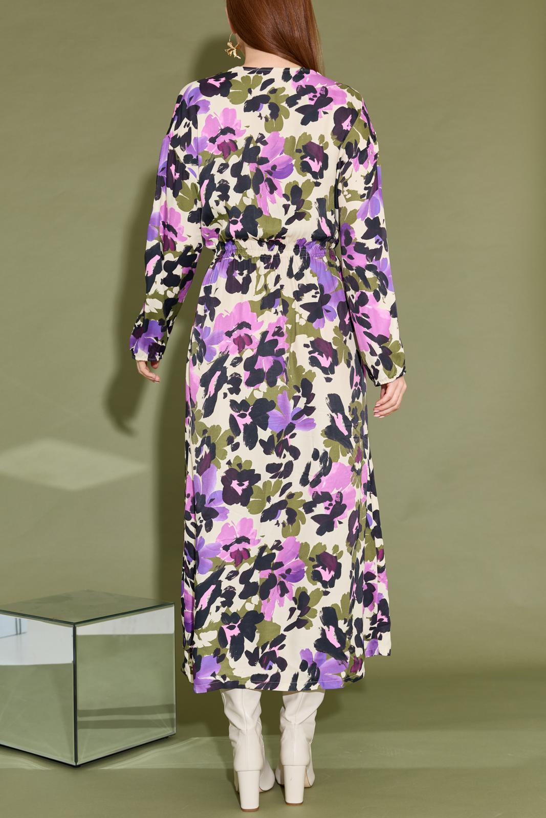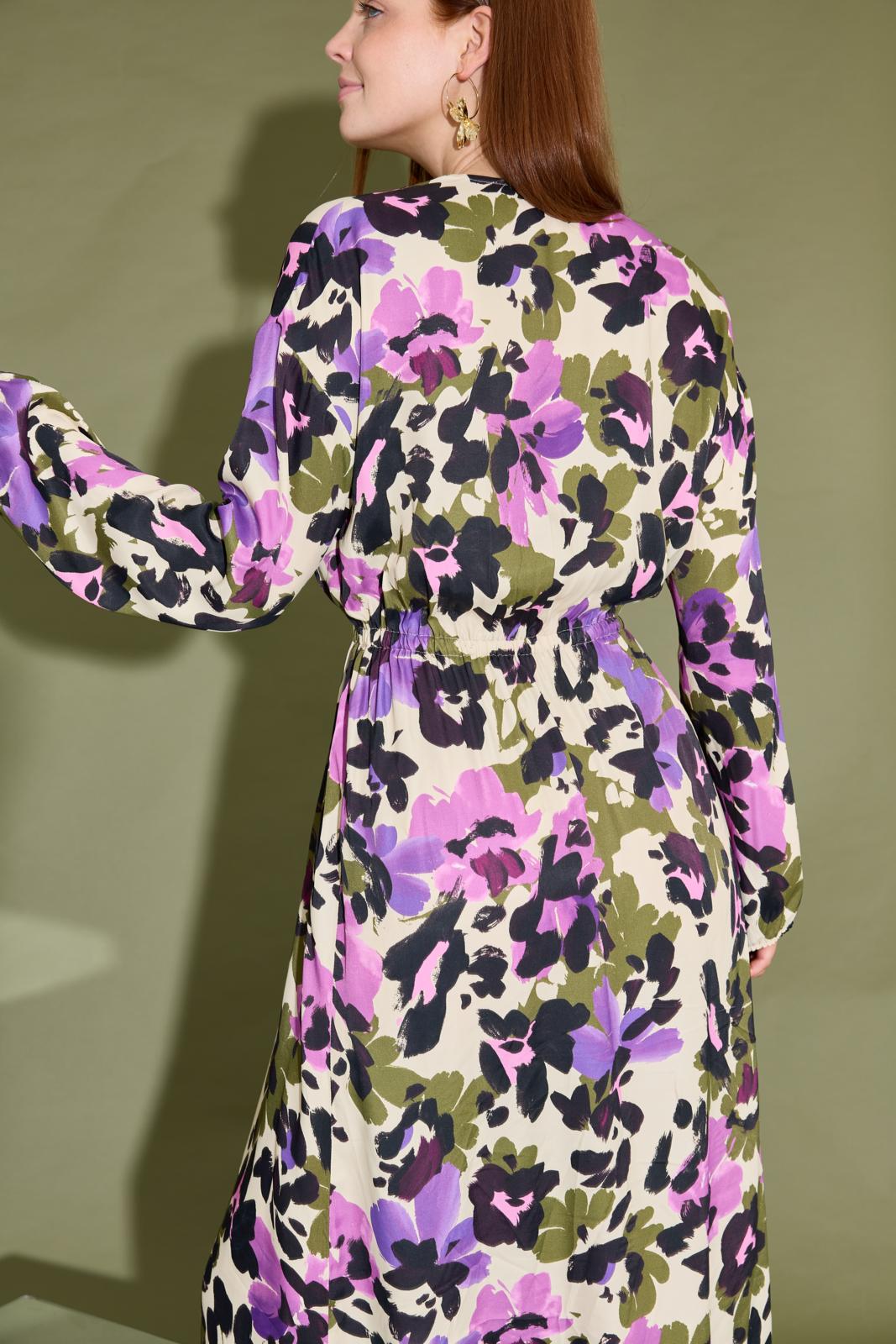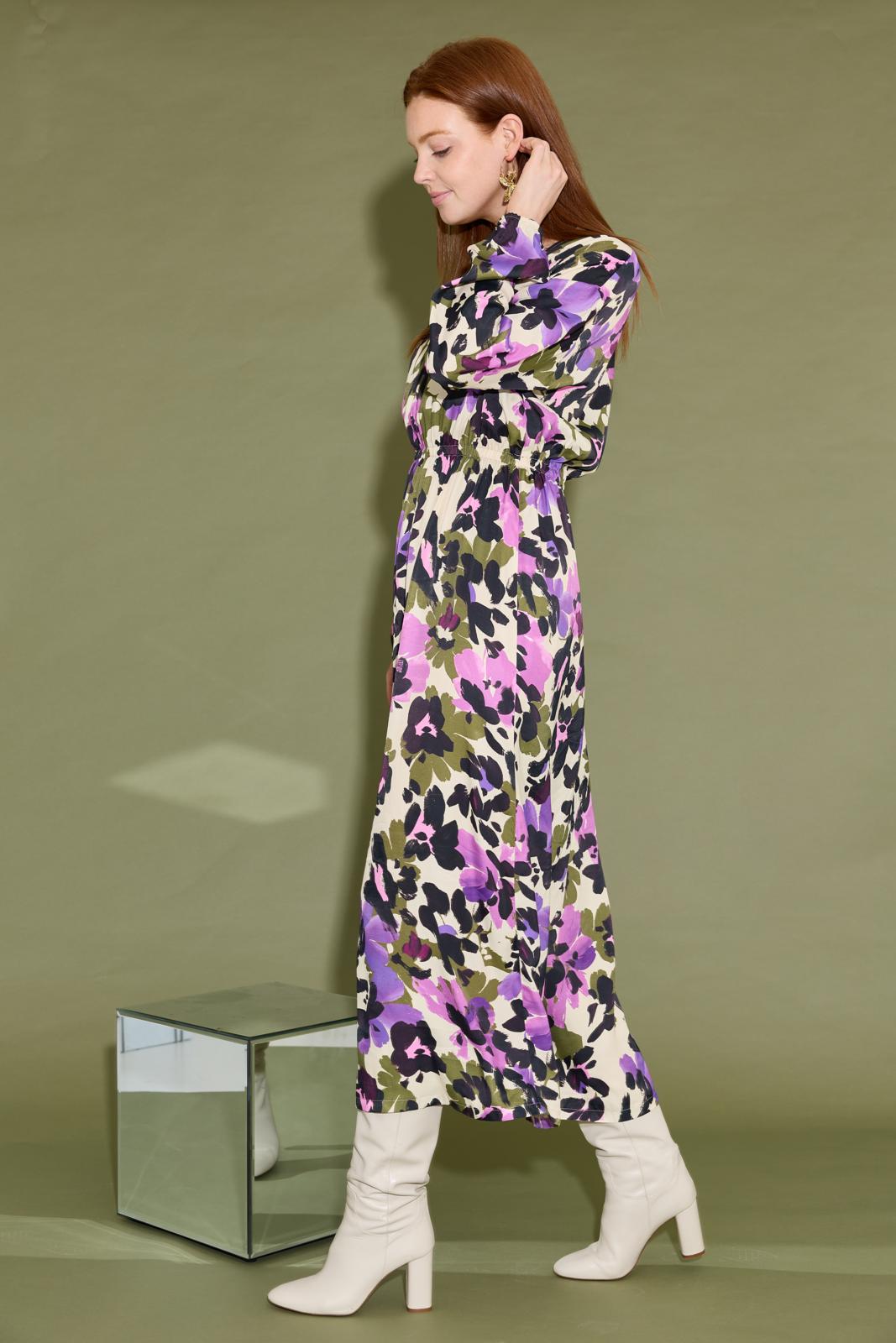 Dit is nu eens een typisch geval van ‘weinig moeite, veel effect’. Een makkelijk-maken-model met een sluik, oversized silhouet. In de taille en onder in de mouwen is elastiek gezet. Kies eventueel een mooie printstof voor dit patroon. Want deze jurk heeft geen deelnaden of details waardoor elk dessin goed uitkomt.
