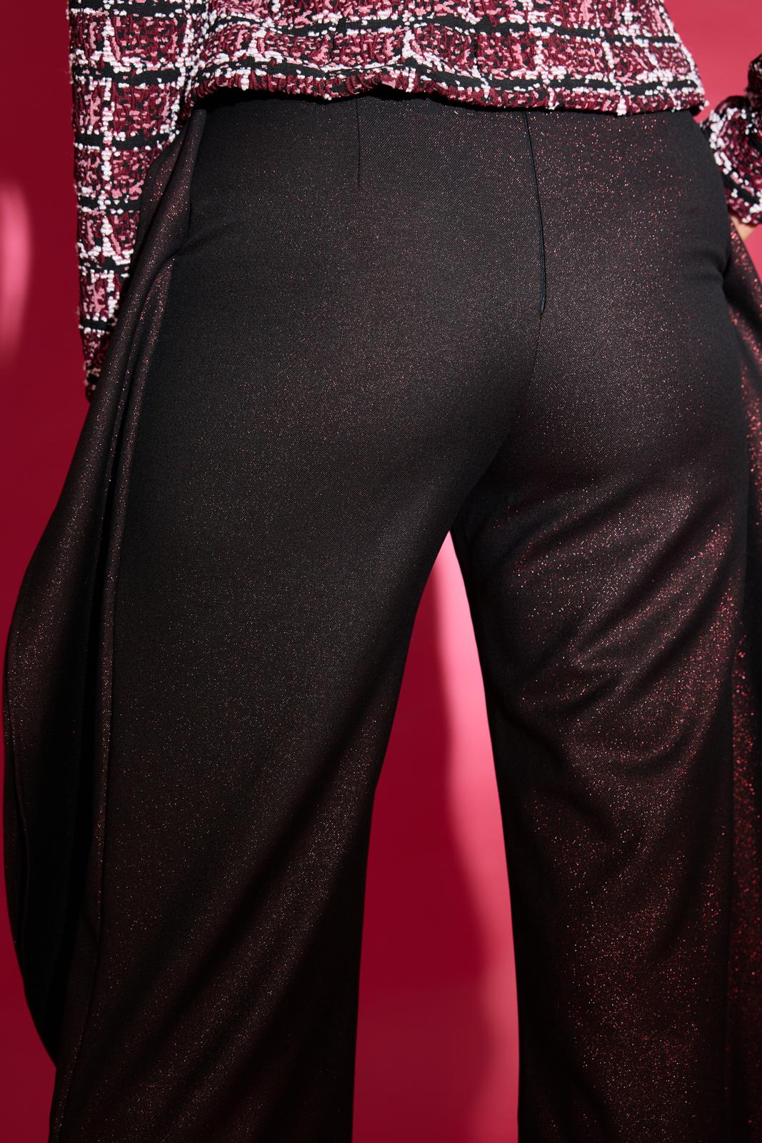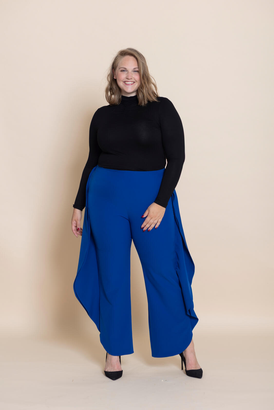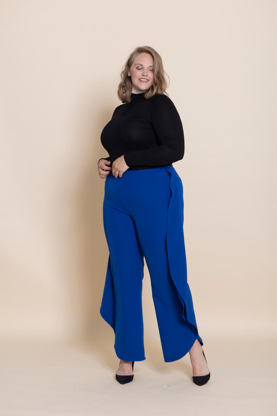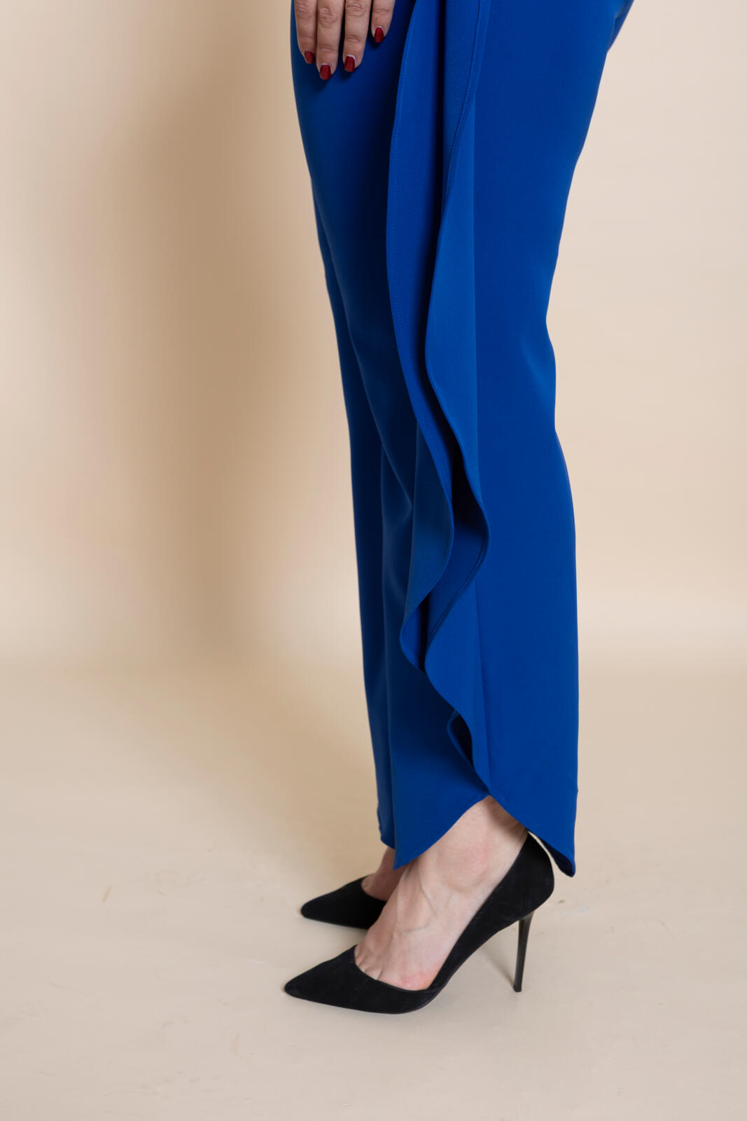 Deze eyecatcher heeft dubbele volants die zijn mee gestikt in de zijnaden. Het basismodel met afgeronde pijpen heeft een beleg in de taille en middenachter een blinde rits.