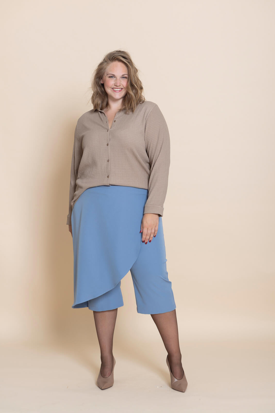 Deze culotte oogt heel vrouwelijk door het extra 'rokpandje'. Hij sluit middenachter met een blinde rits.