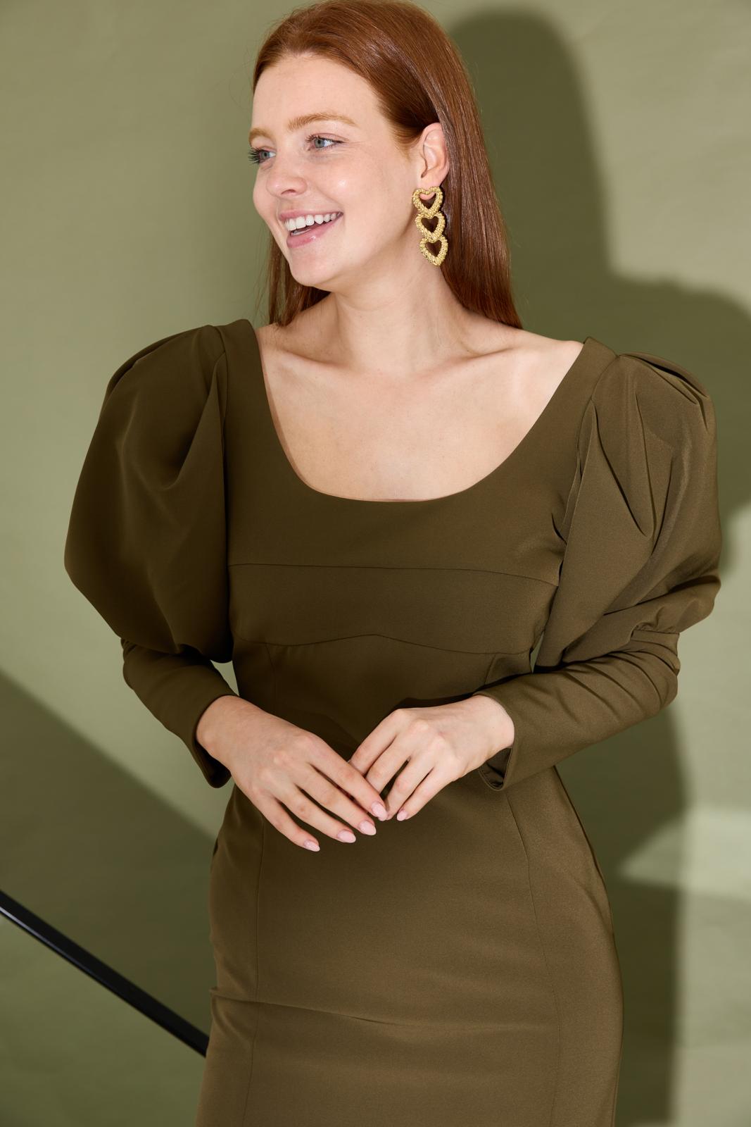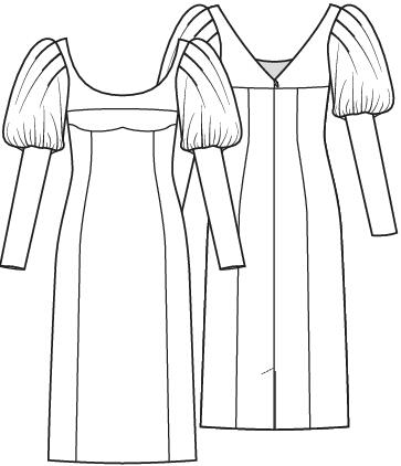 Deze lichaamsvolgende jurk met uitgesproken silhouet; hij blinkt uit door de grote bolle pofmouwen, met een slank deel bij de onderarm. Achter heeft dit model een diepe V-hals en blinde rits.