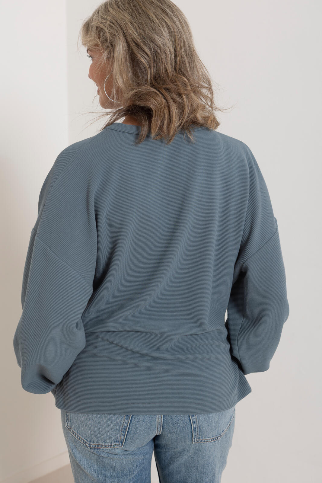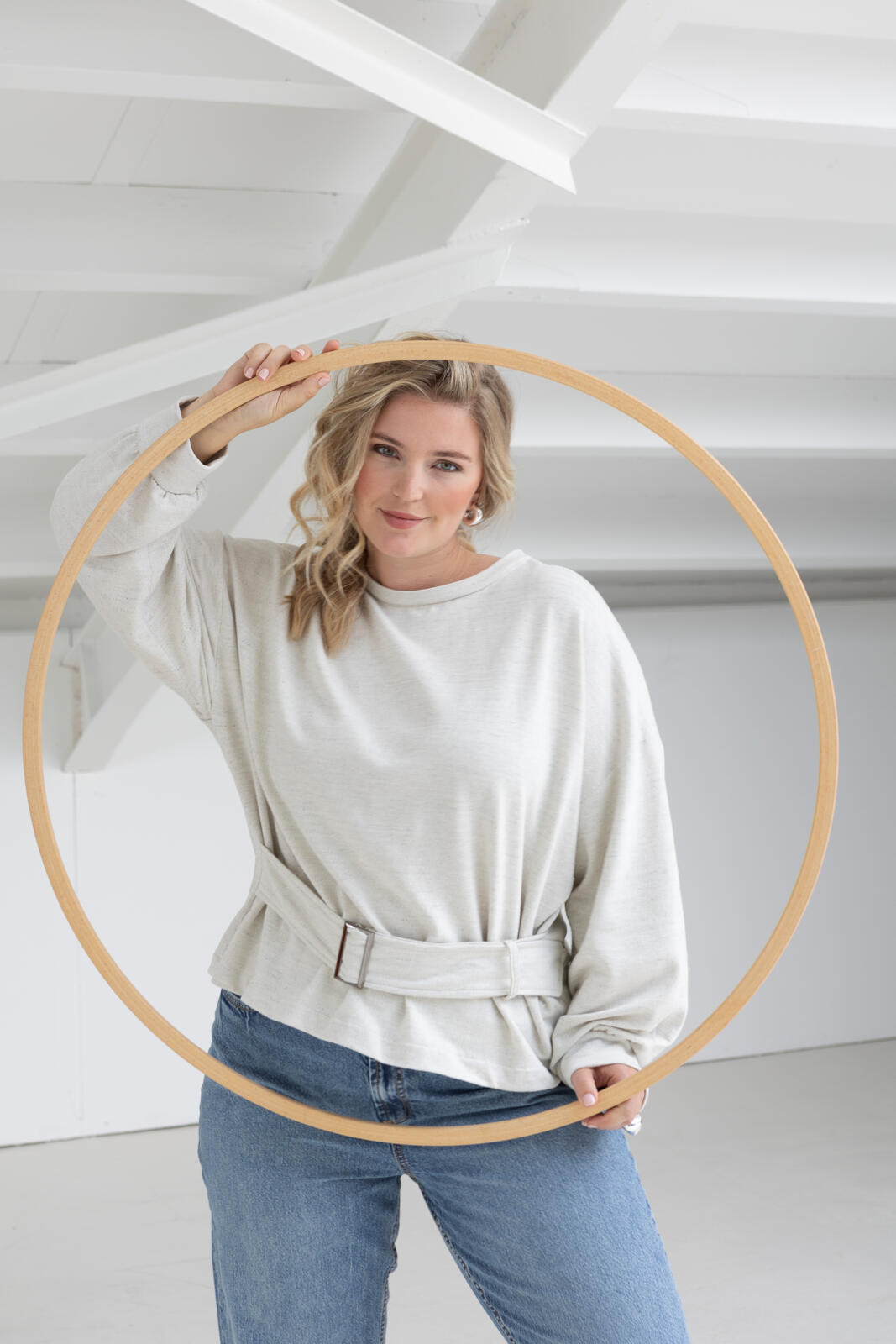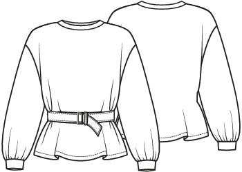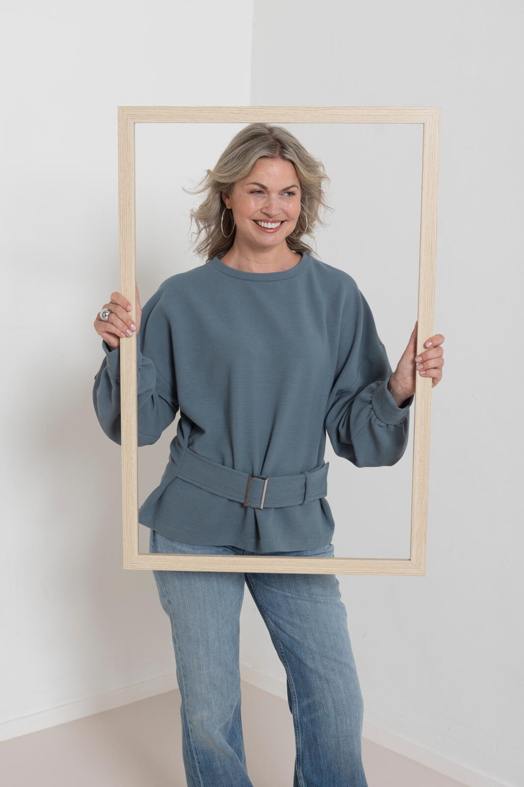 Waarom ook niet: een sweater met een ceintuur. Een casual item met een vrouwelijk tailleaccent. De sweater is oversized met verlaagd ingezette pofmouwen. De halve ceintuur met metalen gesp – is tussen de zijnaden gestikt.