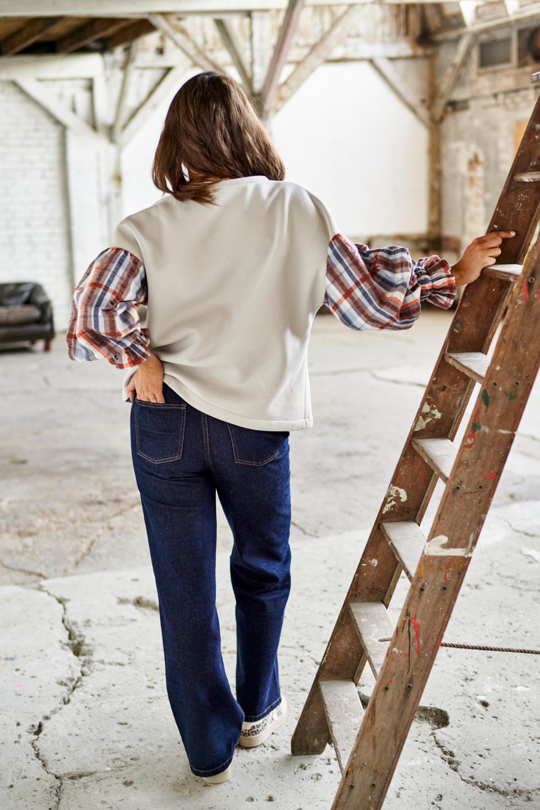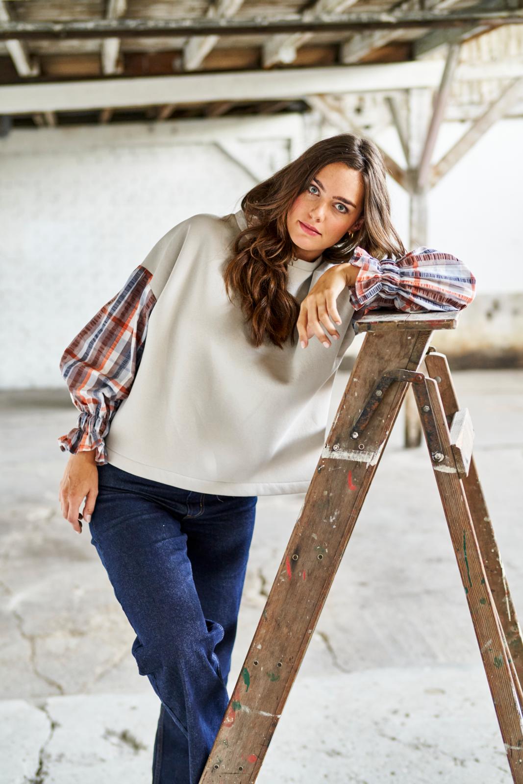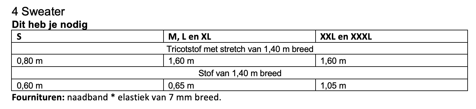 Deze sweater is heel geschikt om overgebleven lapje mee weg te werken. Daarmee maak je de wijde pofmouwen én heb je een uniek item. De ruimvallende trui is gemaakt van sweatstof met een boordje van dezelfde stof. Je kunt ook voor bijpassende boordstof kiezen.
